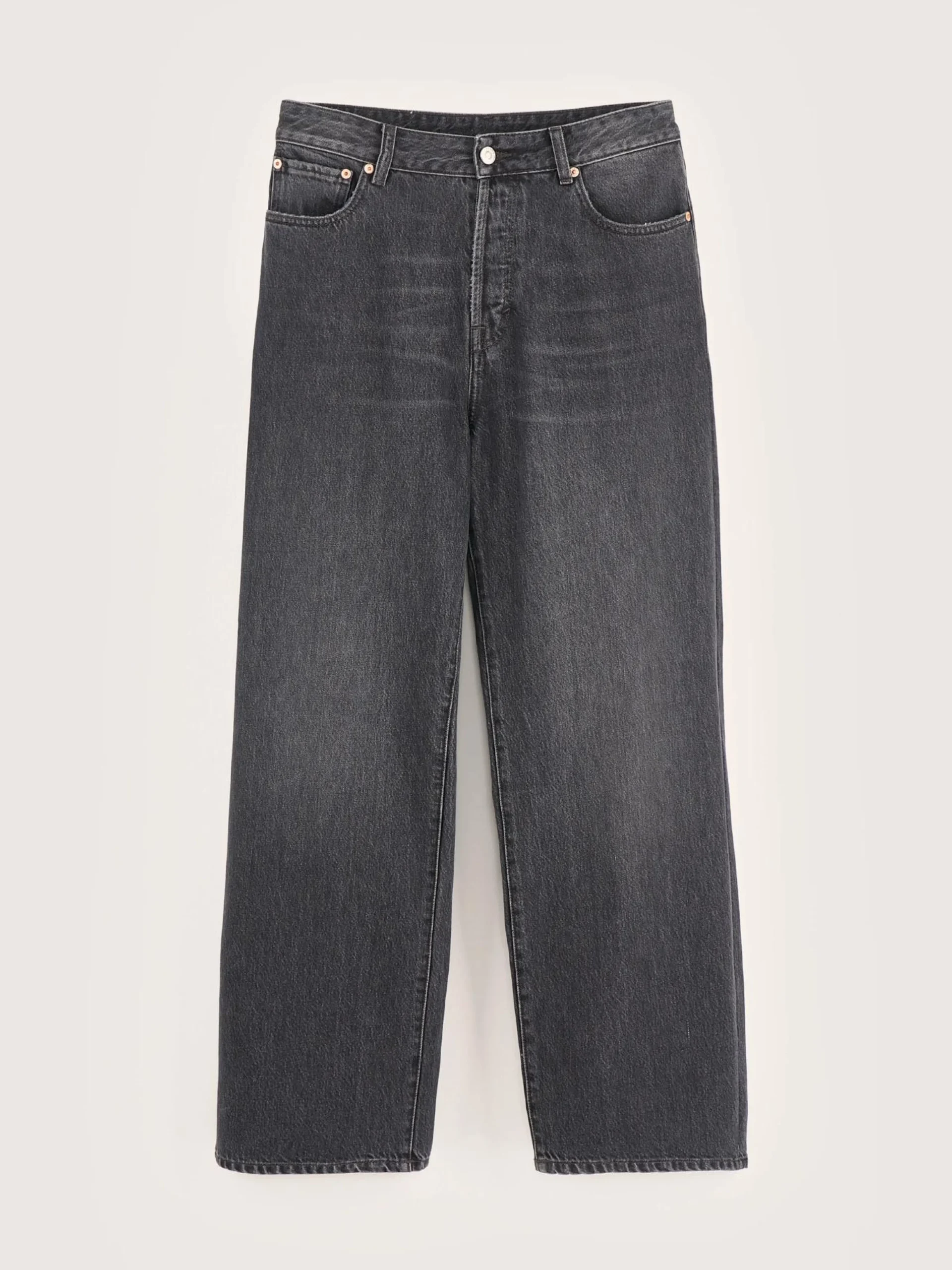 Mid-waist jeans met wijde pijpen in versleten zwart.