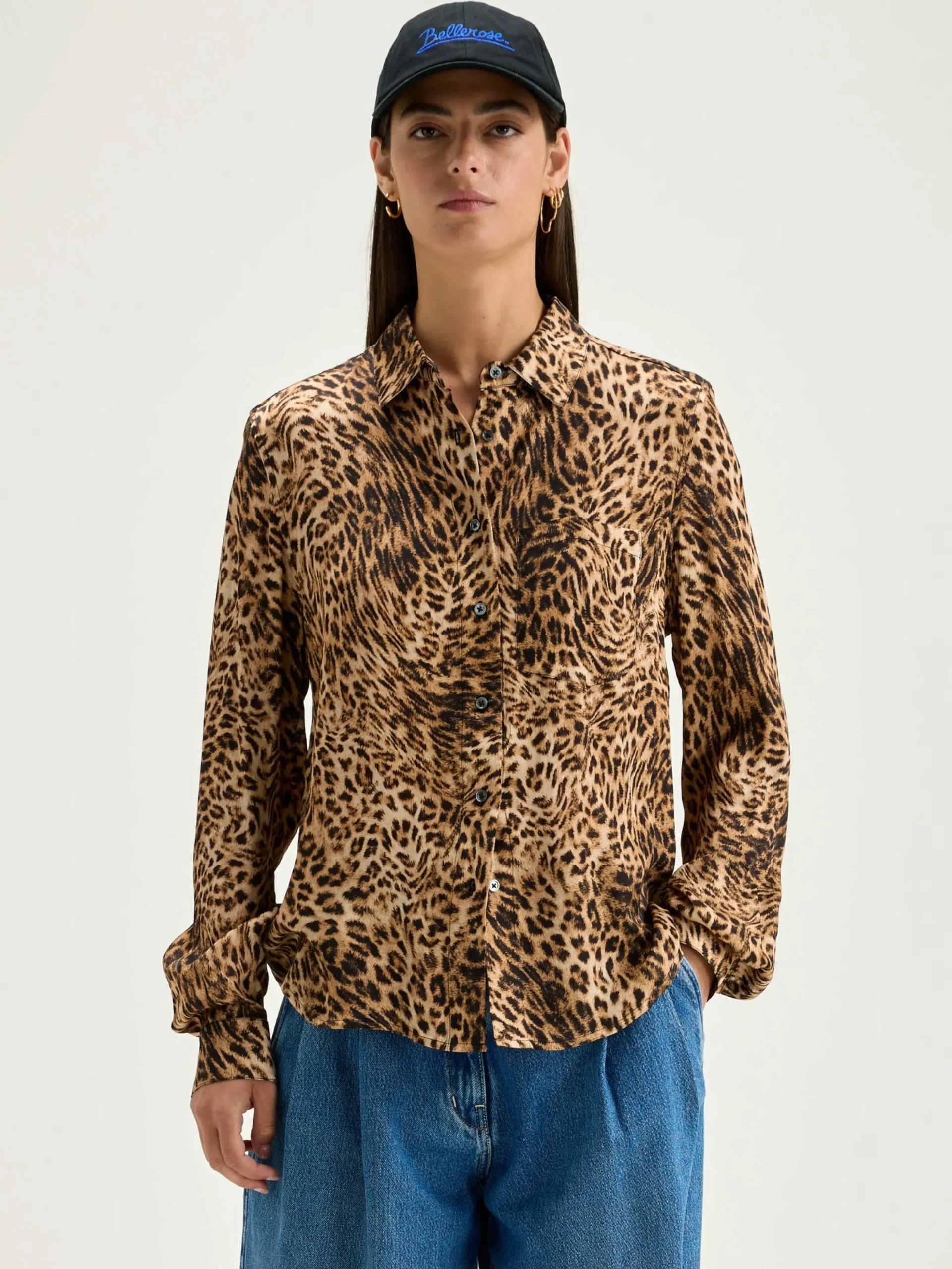 Lang hemd met een kraag en een recht model, van viscose met luipaardprint.