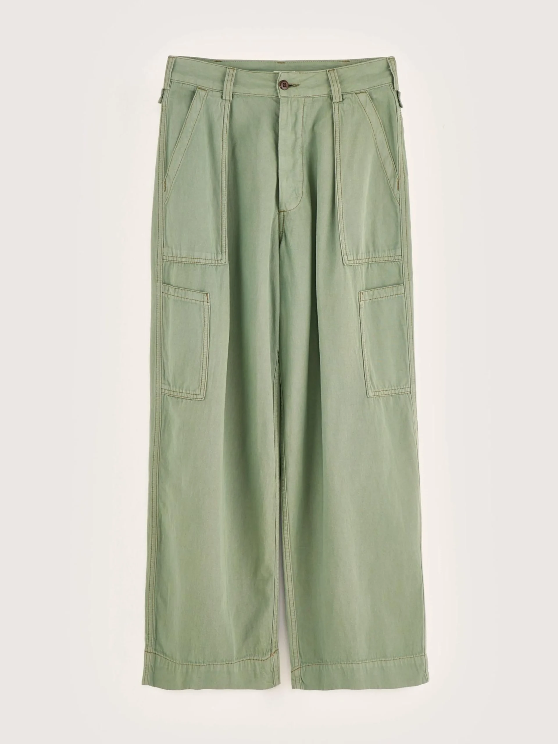 Klassieke cargo broek met wijde pijpen en fatigue-zakken in een eucalyptusgroene katoen en linnenmix.