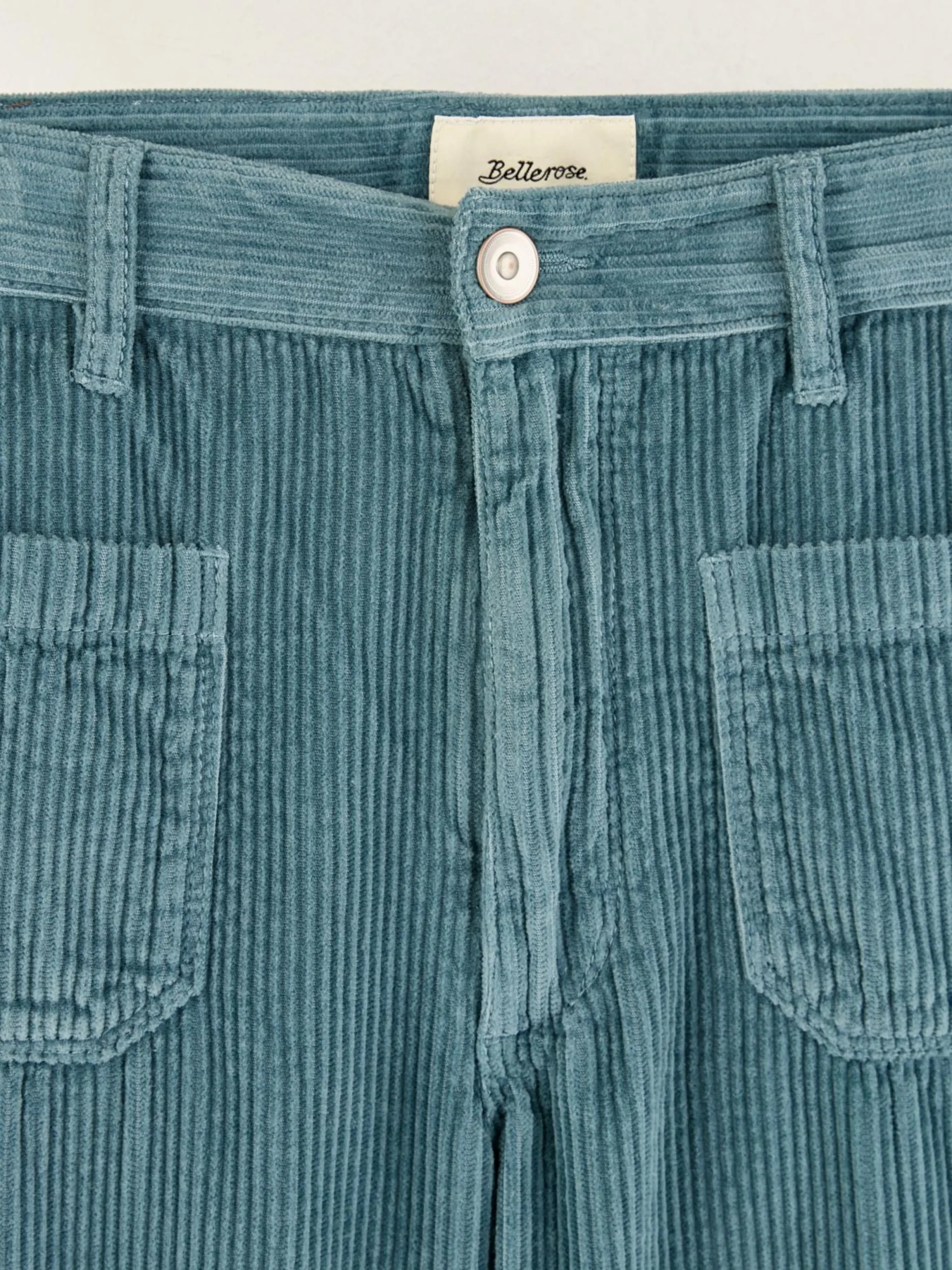 Metaalblauwe broek met hoge taille en wijde pijpen, van corduroy katoen.