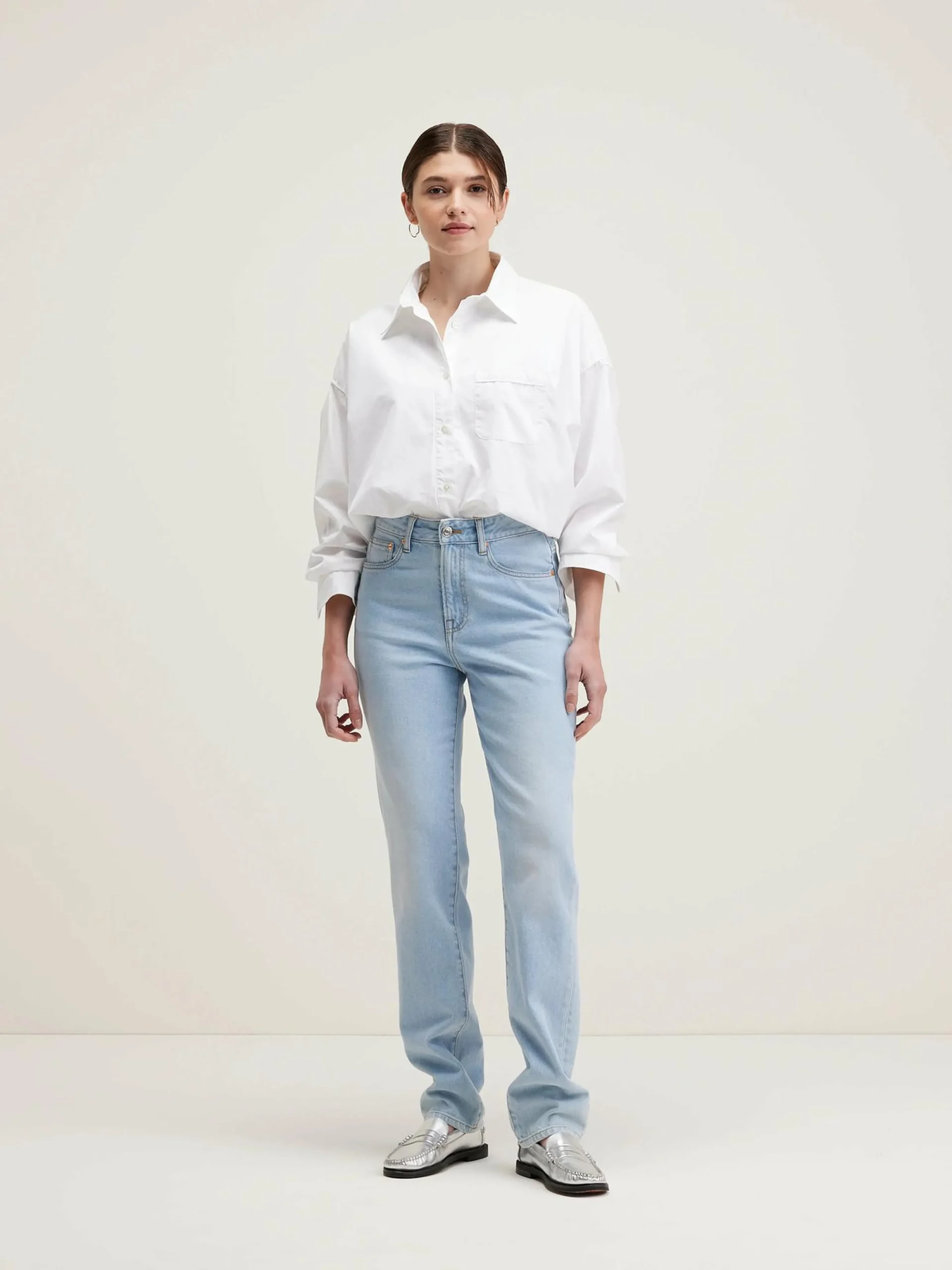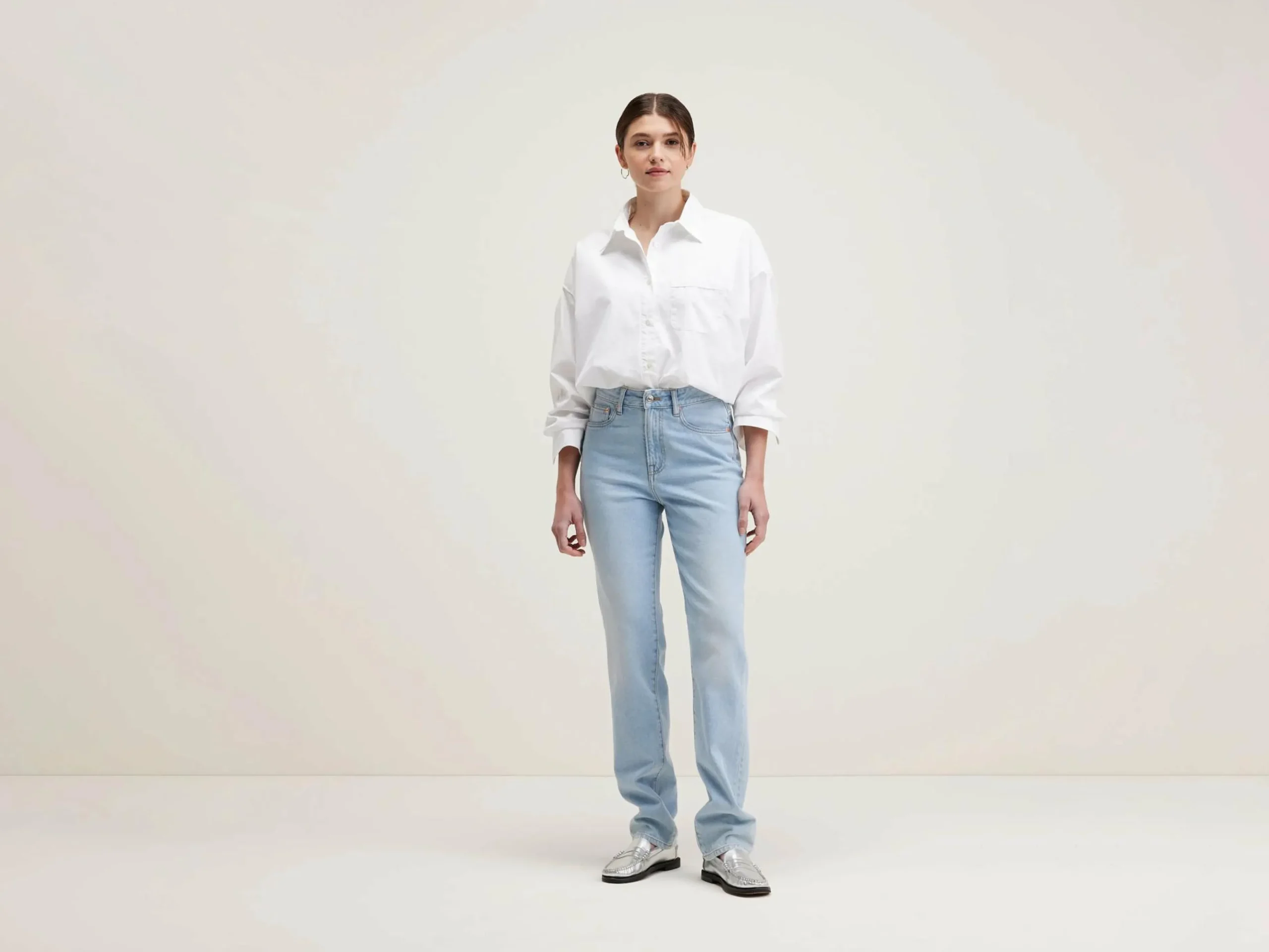 High-waist, lichtblauwe gebleekte slim fit jeans.