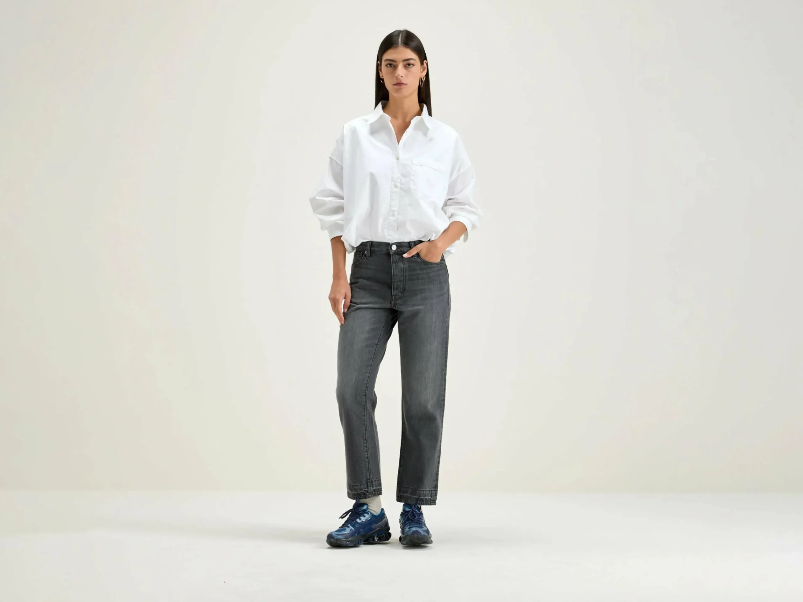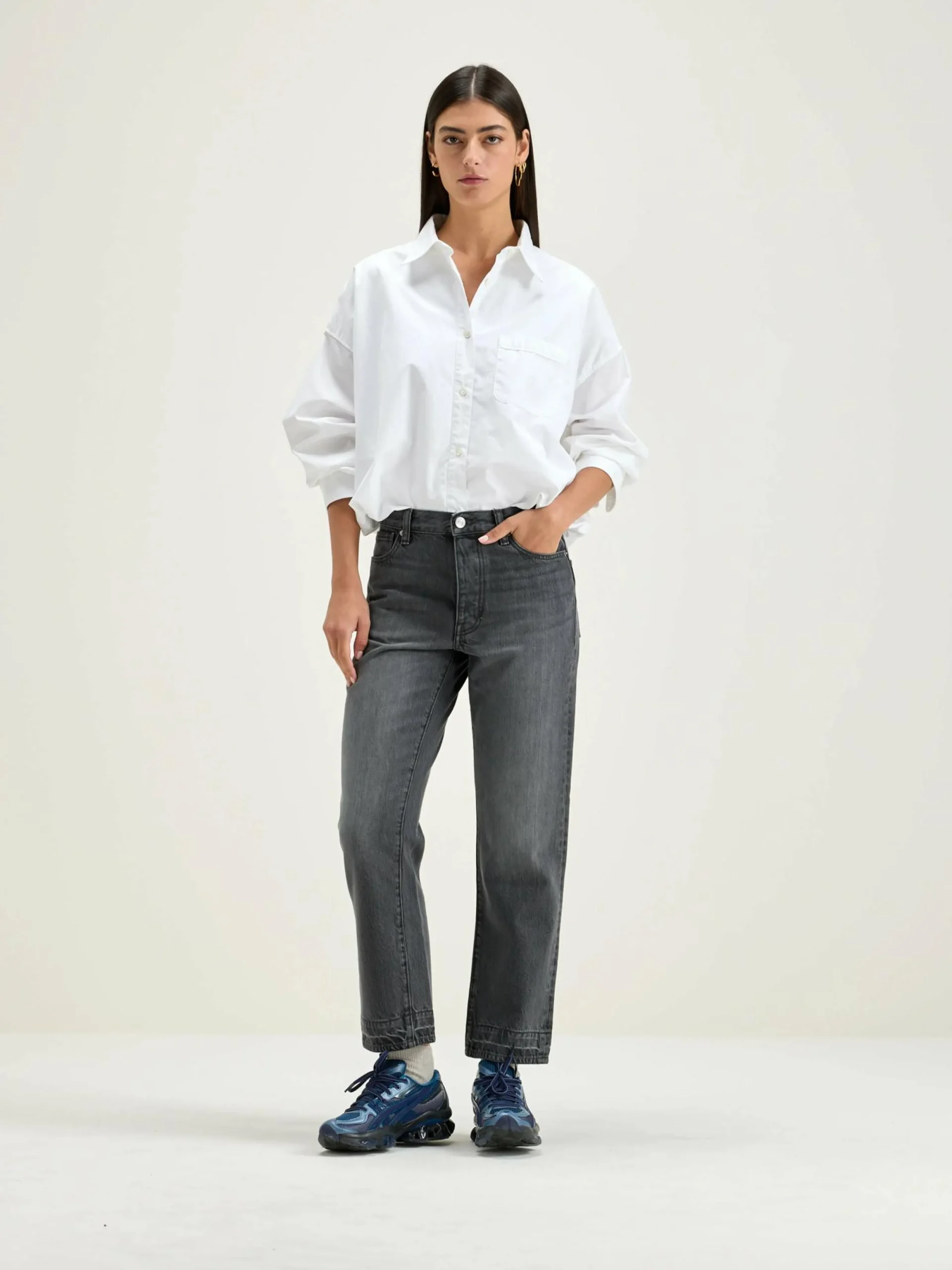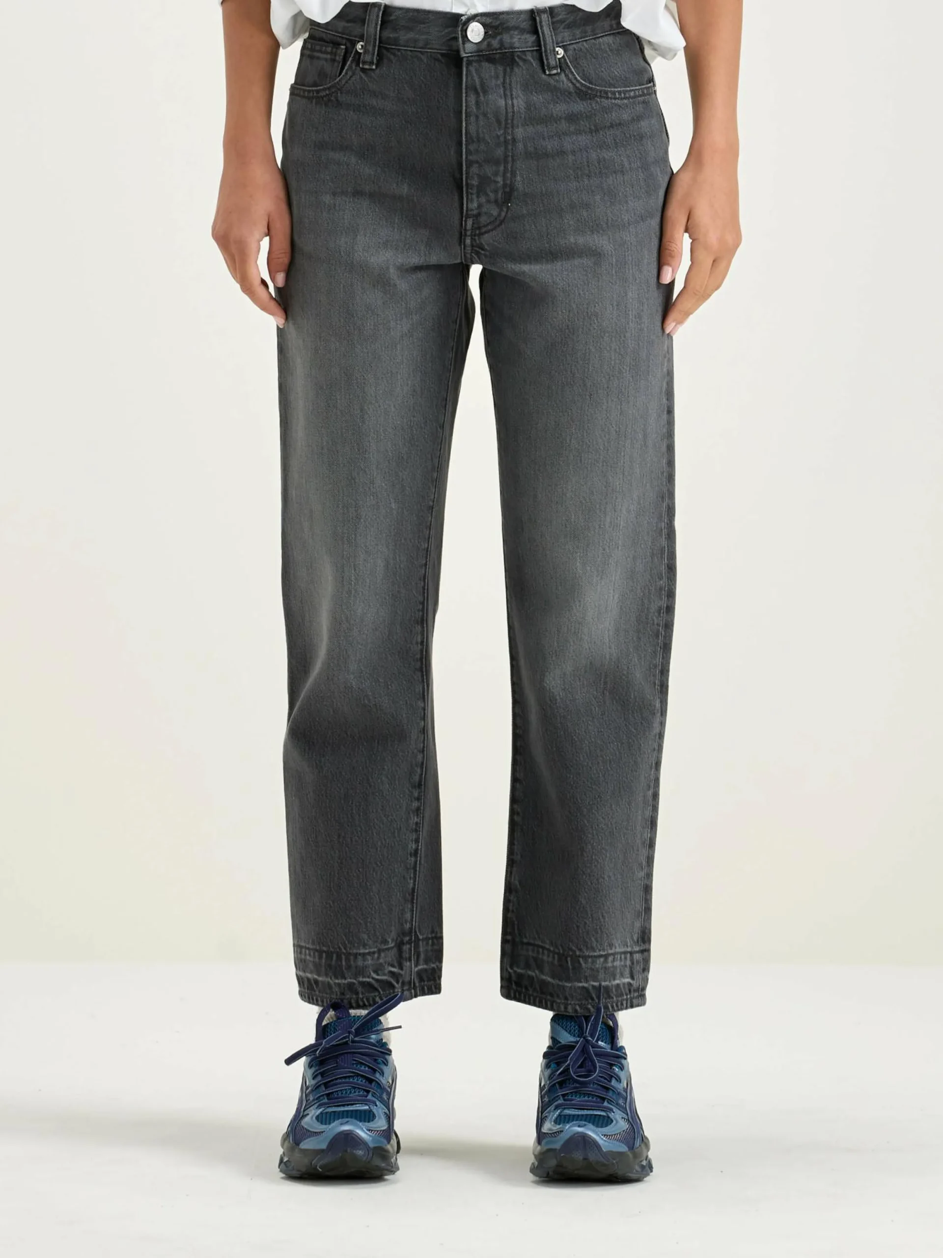 Klassieke, rechte jeans met hoge taille, van zwart katoendenim met een gedragen look.