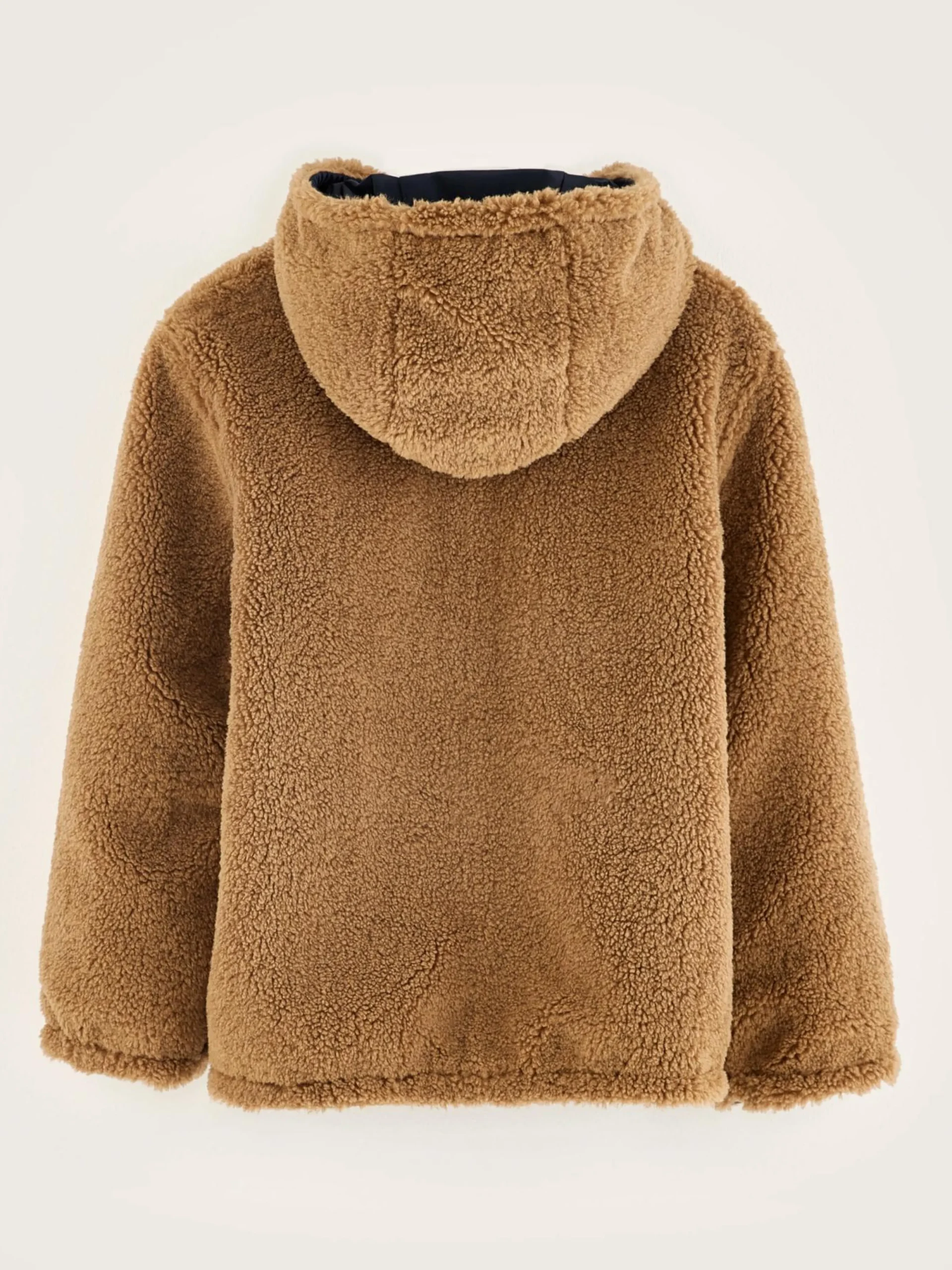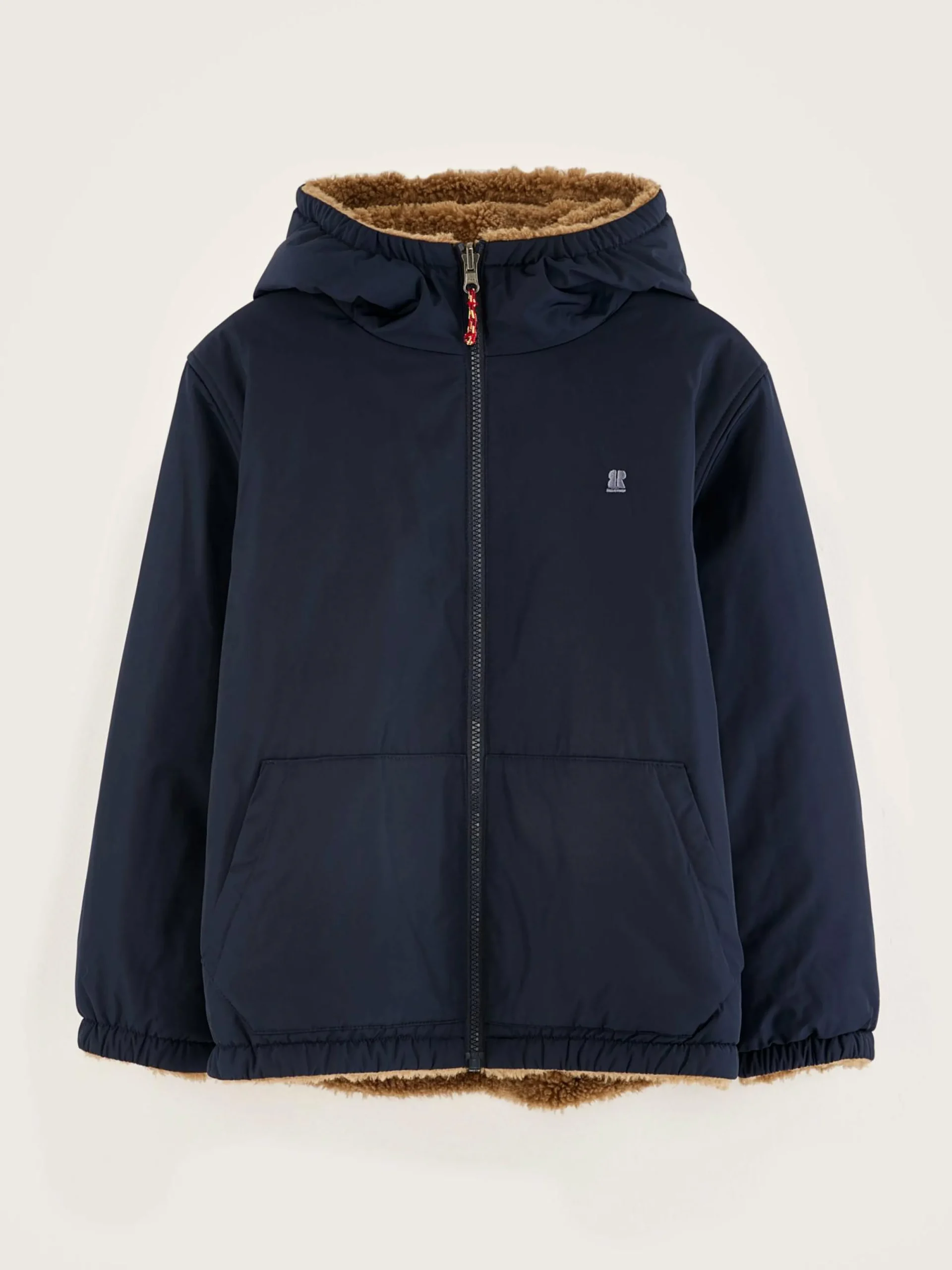 Klassieke, omkeerbare jas met capuchon, van waterafstotende donkerblauwe ripstop textiel en teddystof.