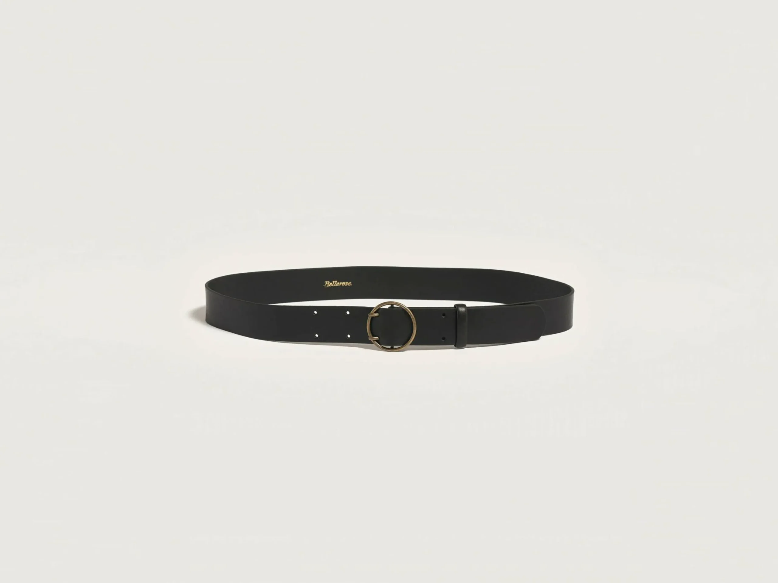 Klassieke leren riem gemaakt van glad zwart leer die wordt vastgezet met een ronde gesp van verouderd messing.