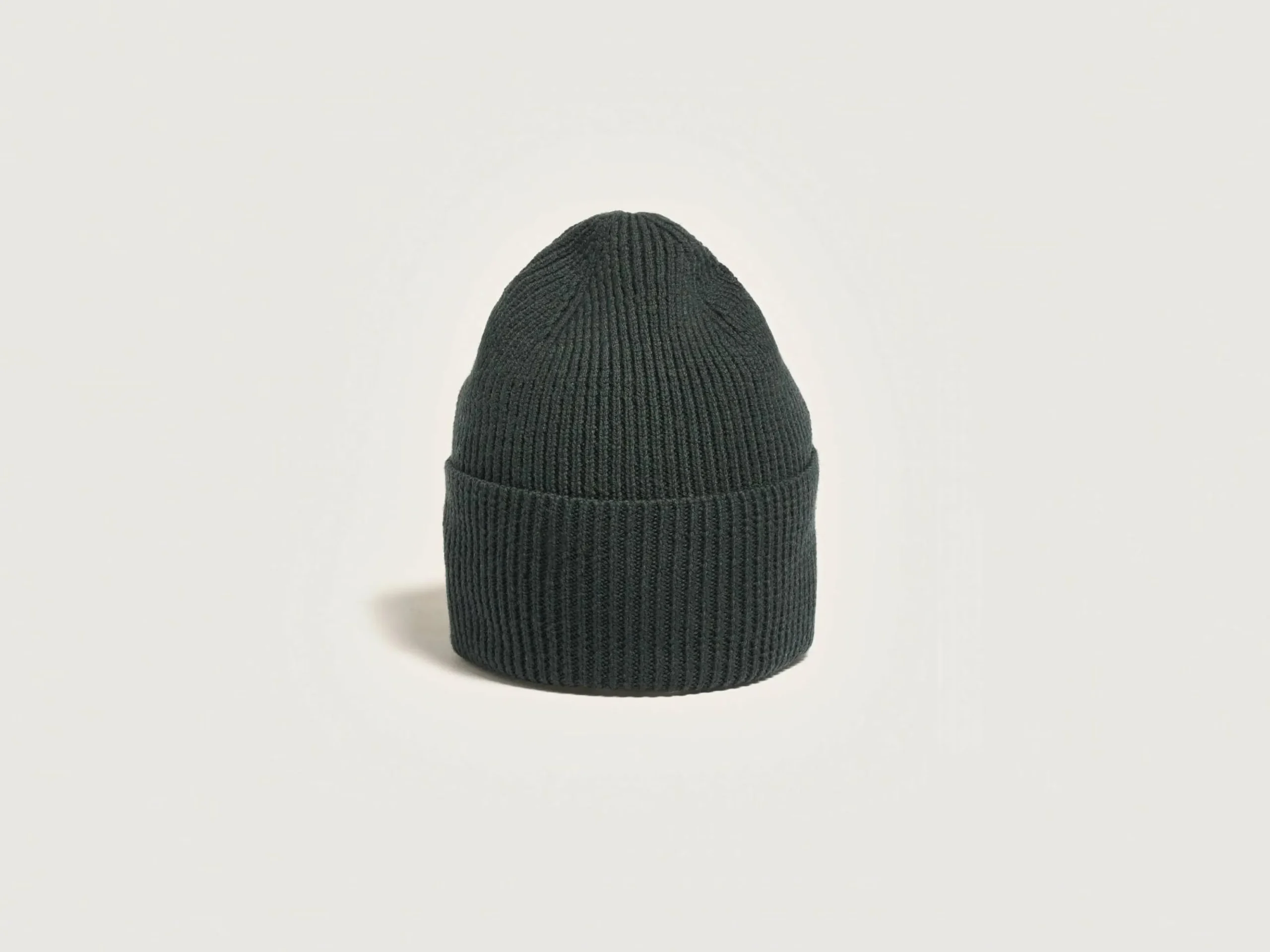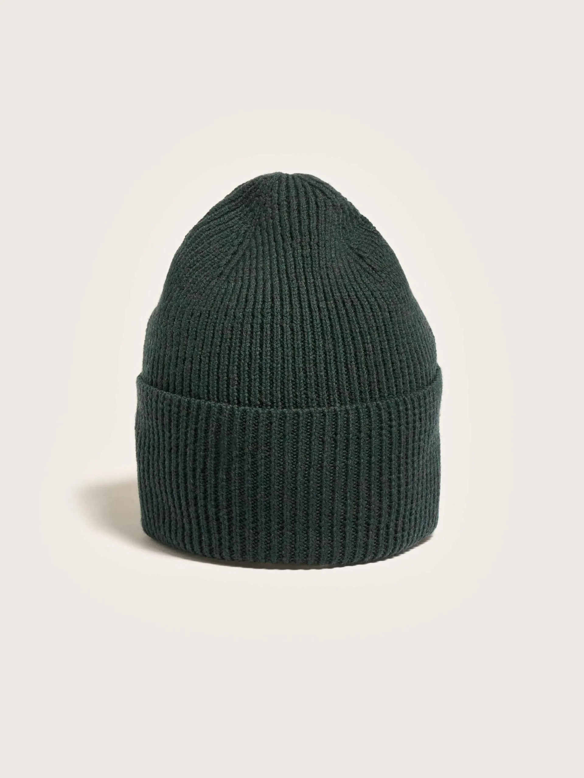 Ribgebreide, flesgroene muts met omgeslagen rand.