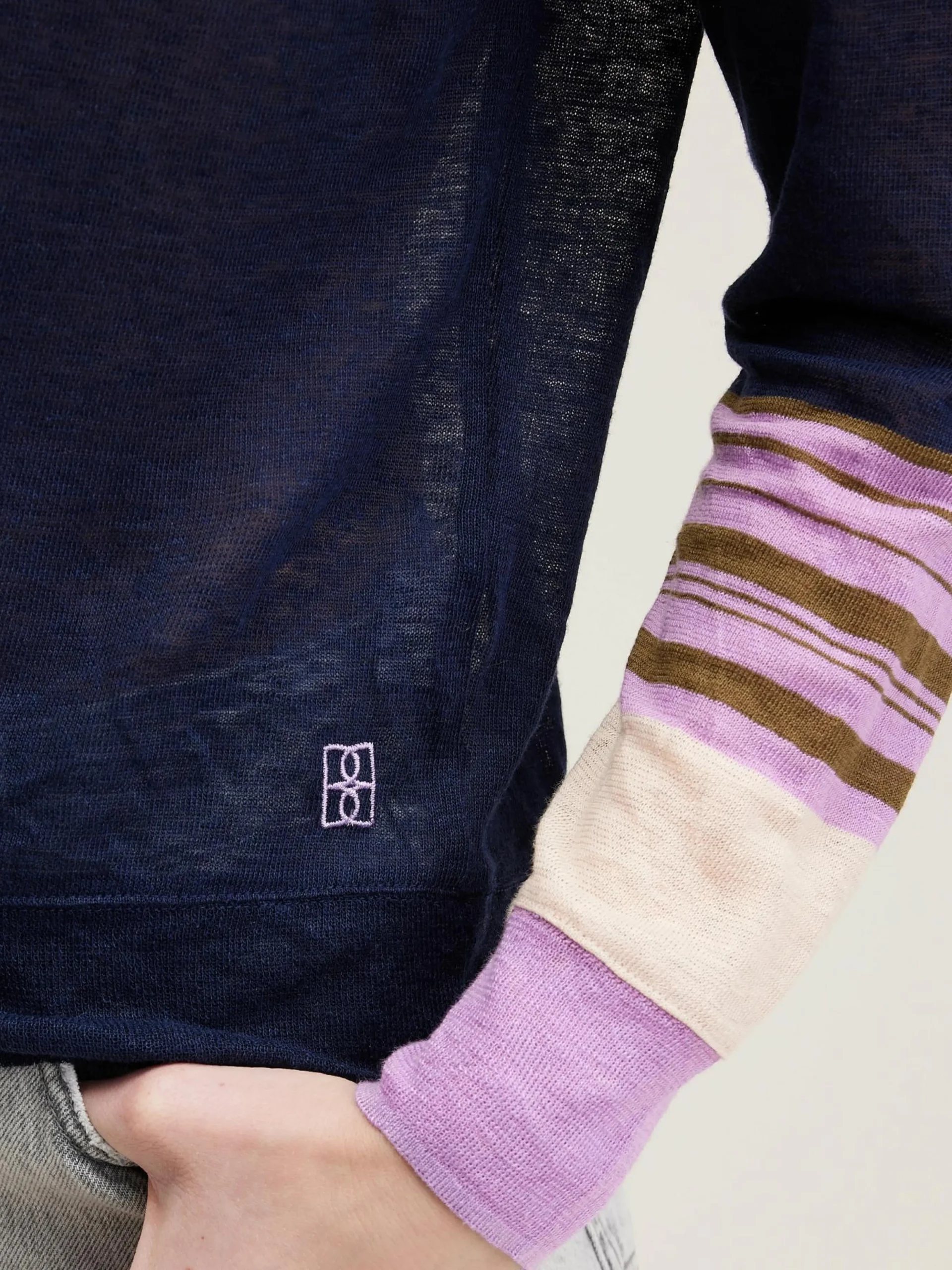 Relaxed linnen marineblauw T-shirt met contrasterende strepen op de lange mouwen.