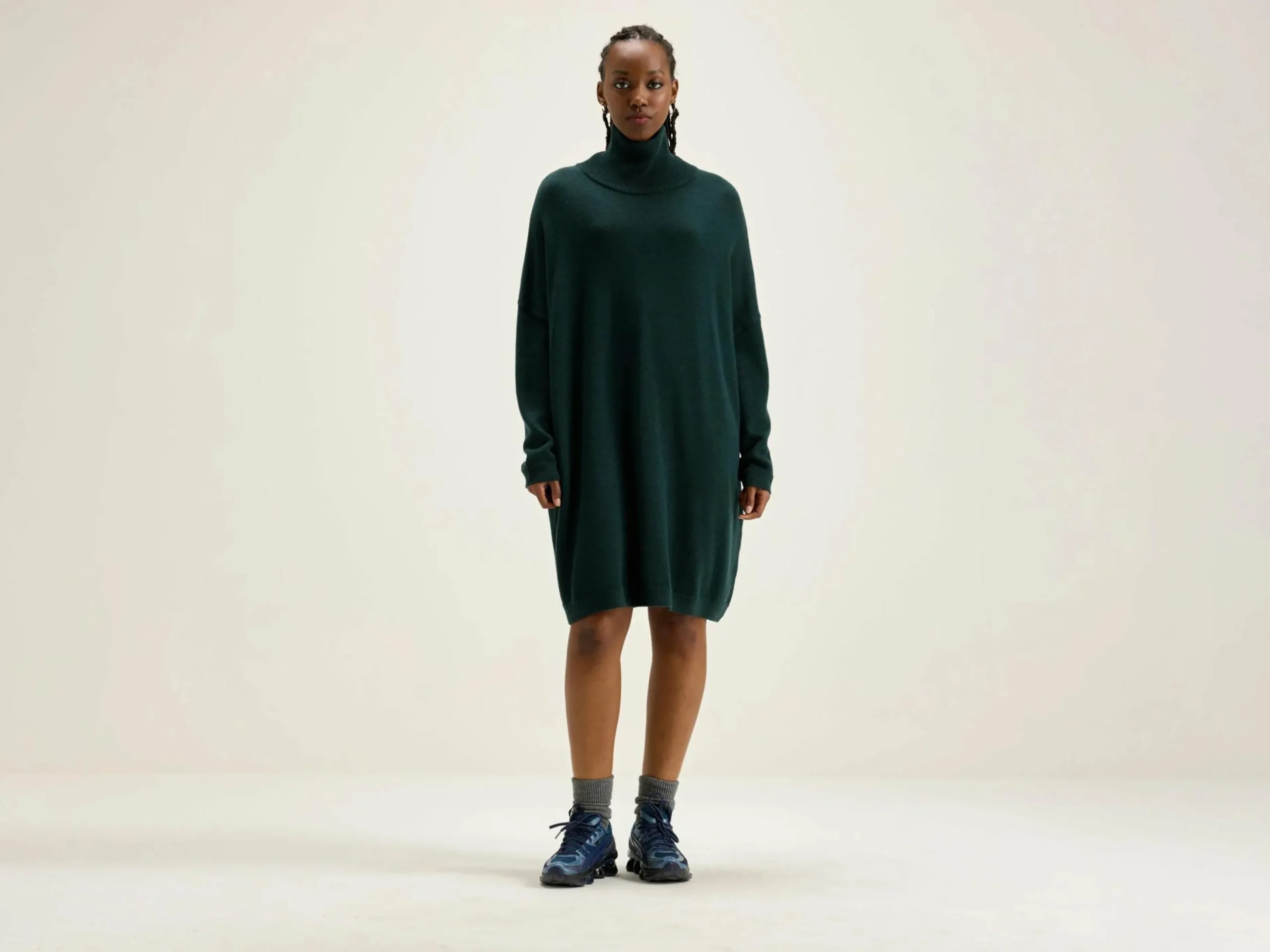 Flesgroene, oversizede gebreide jurk van extra fijne merino, met een dubbelgebreide turtle neck.