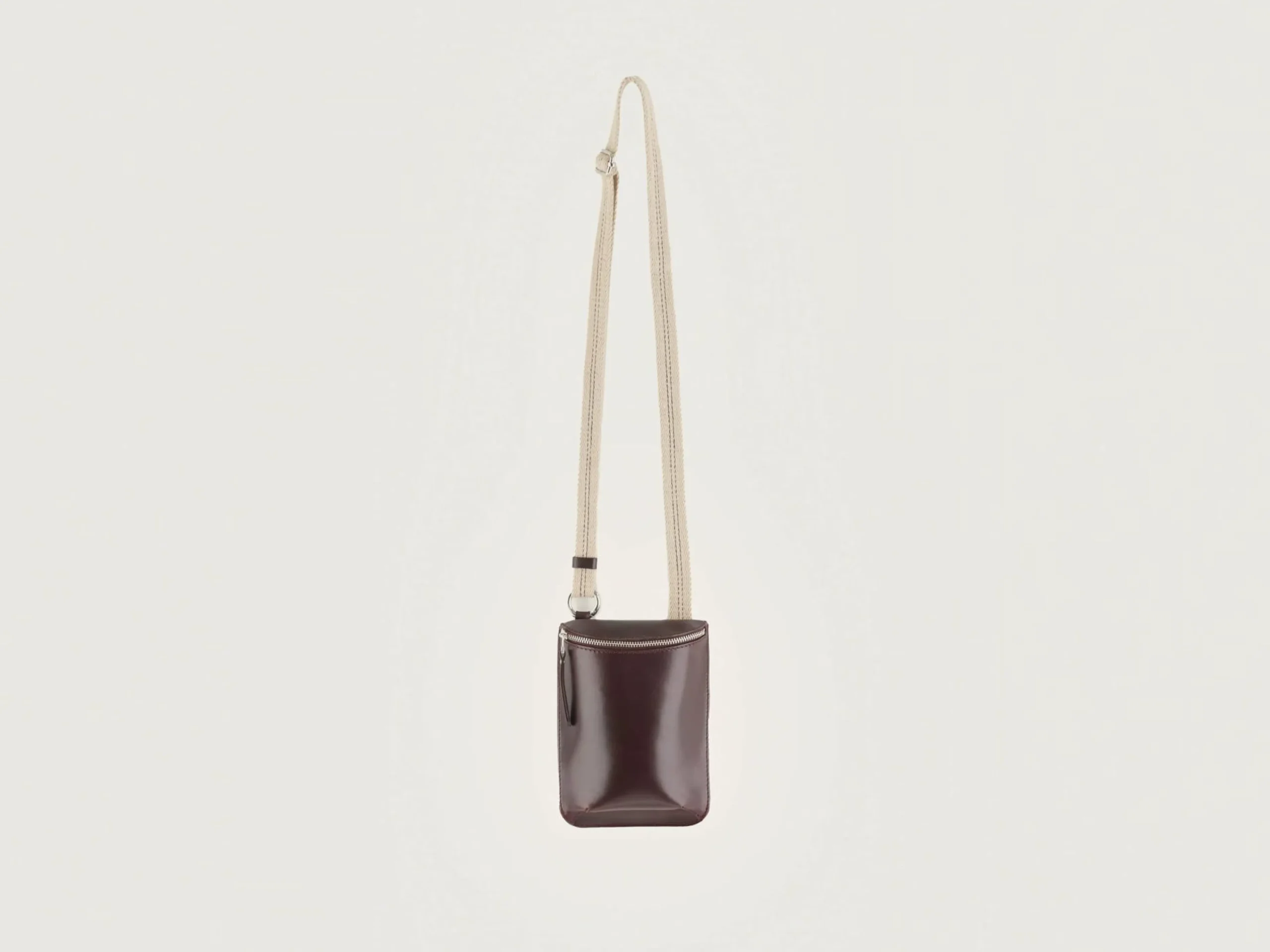 Mini tas met ritssluiting van soepel bordeauxrood leer met een kenmerkende dubbel gestikte riem.