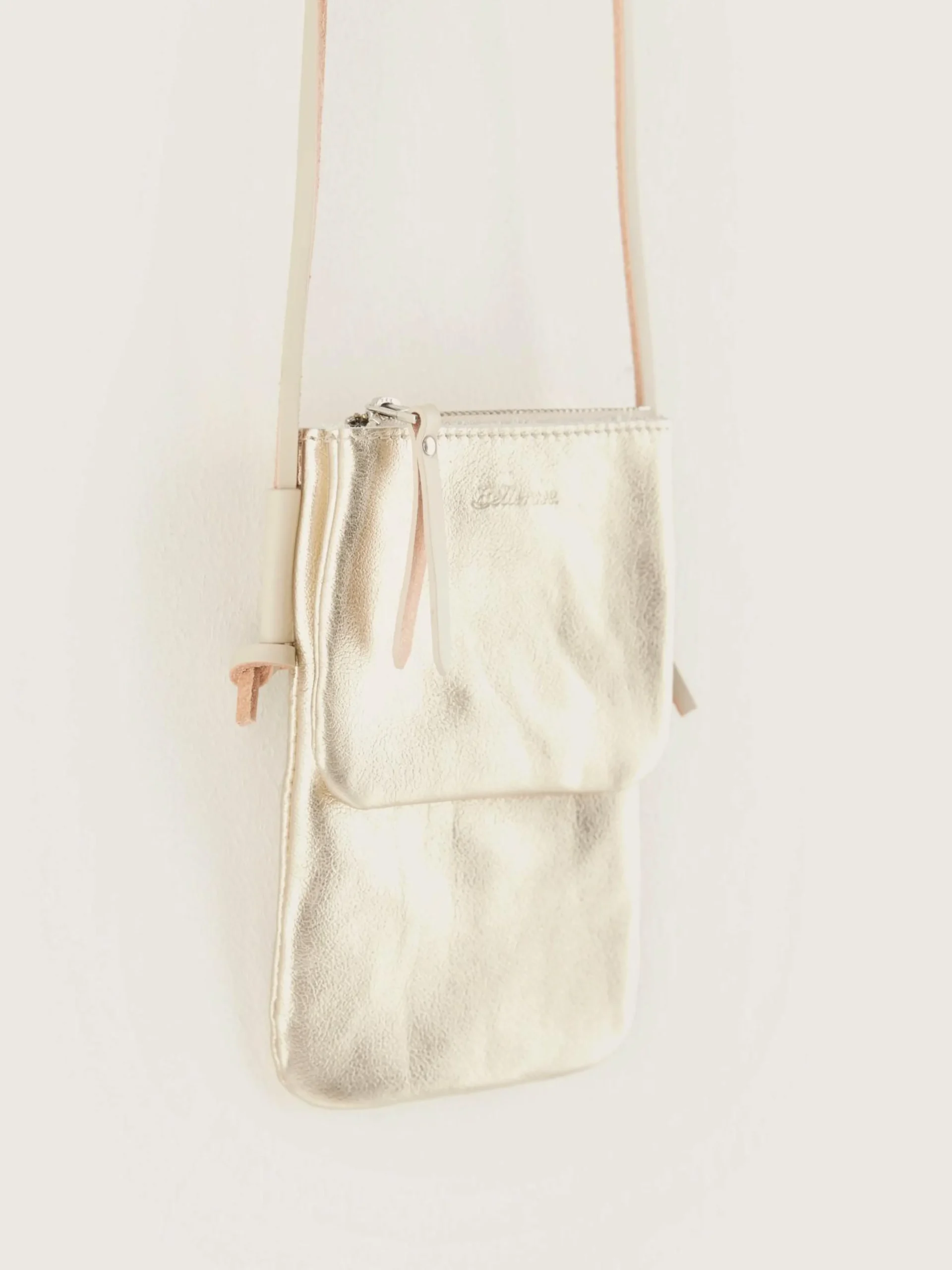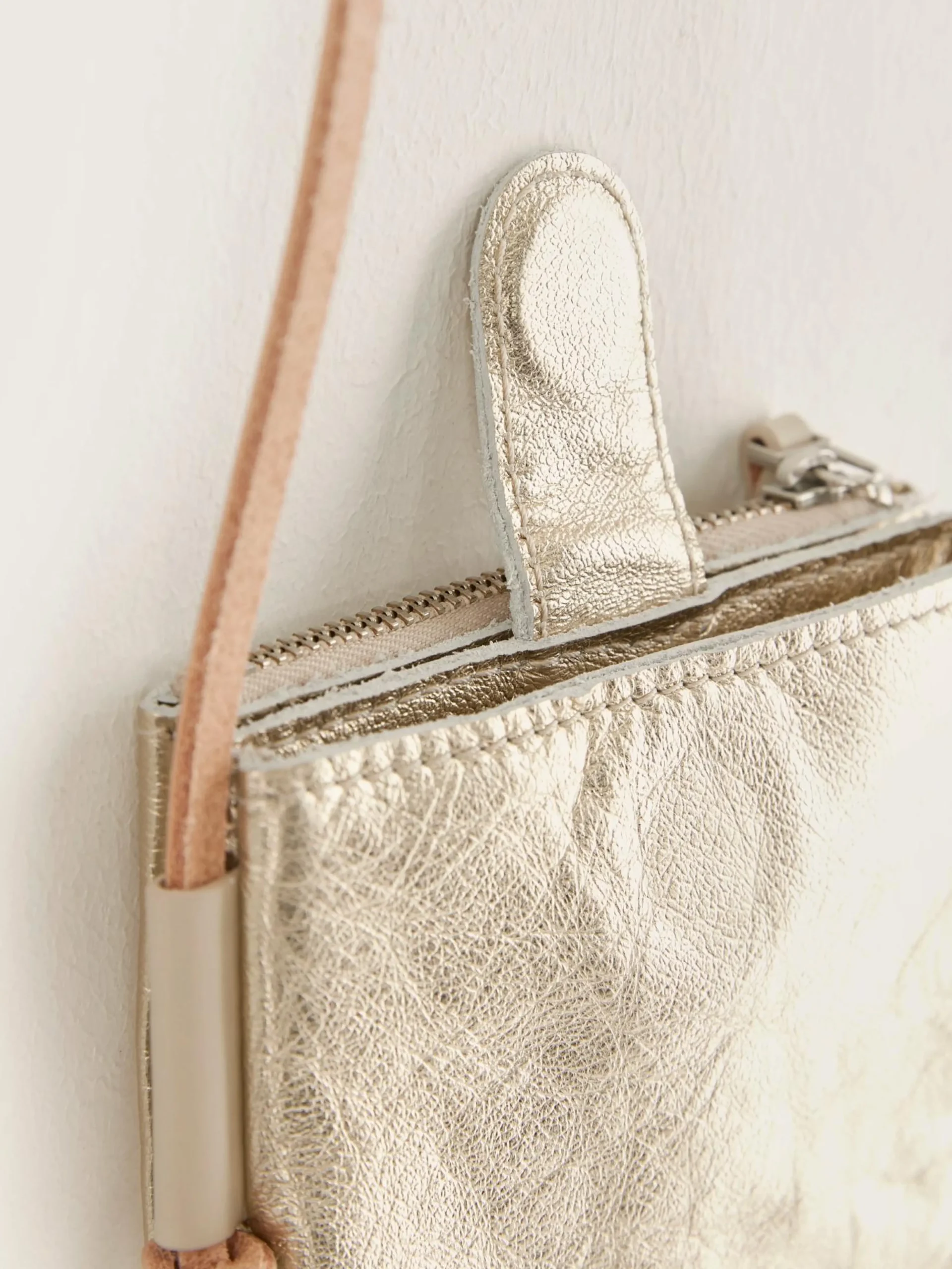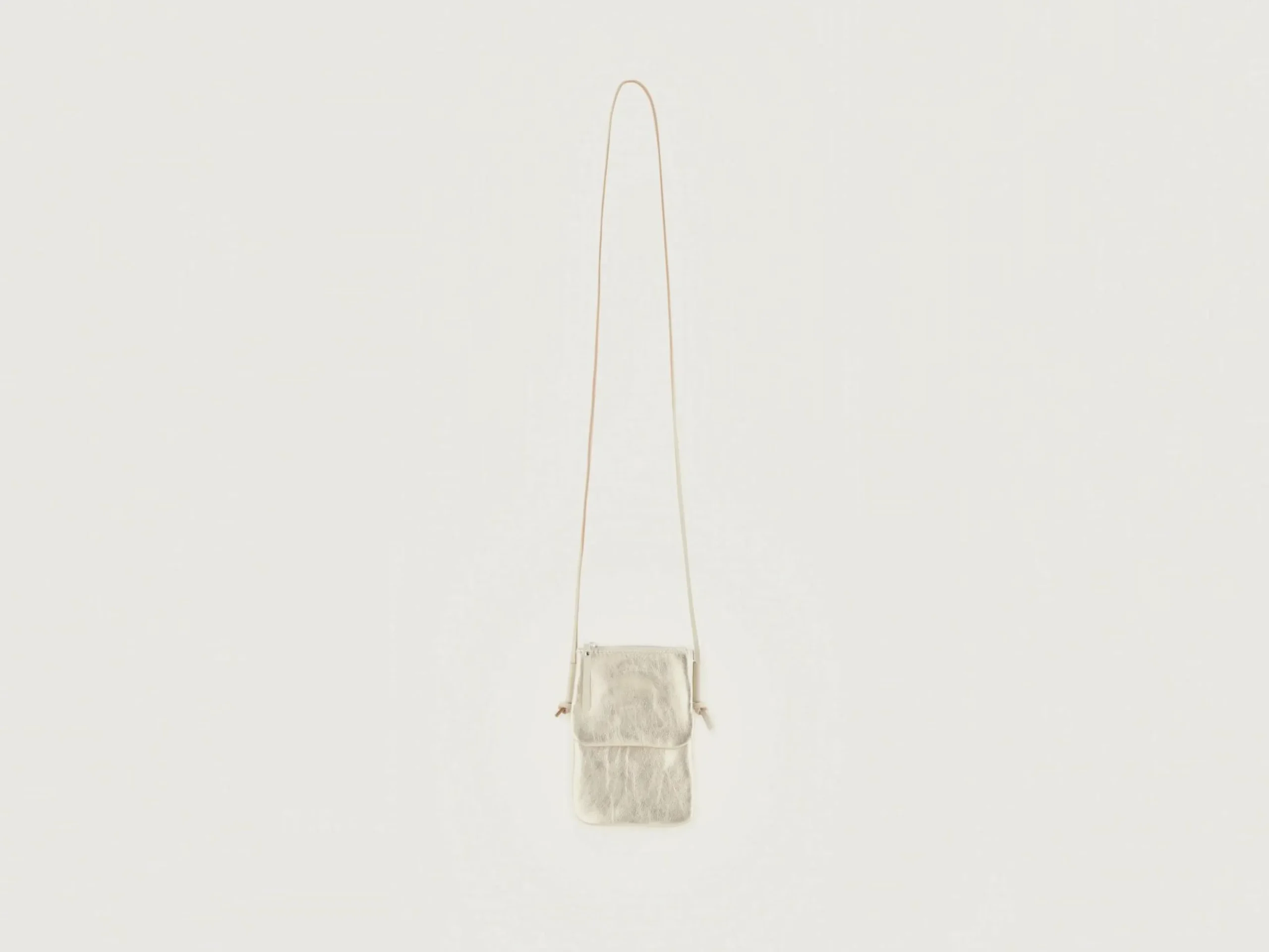 Grijs leren minitasje met metallic coating.