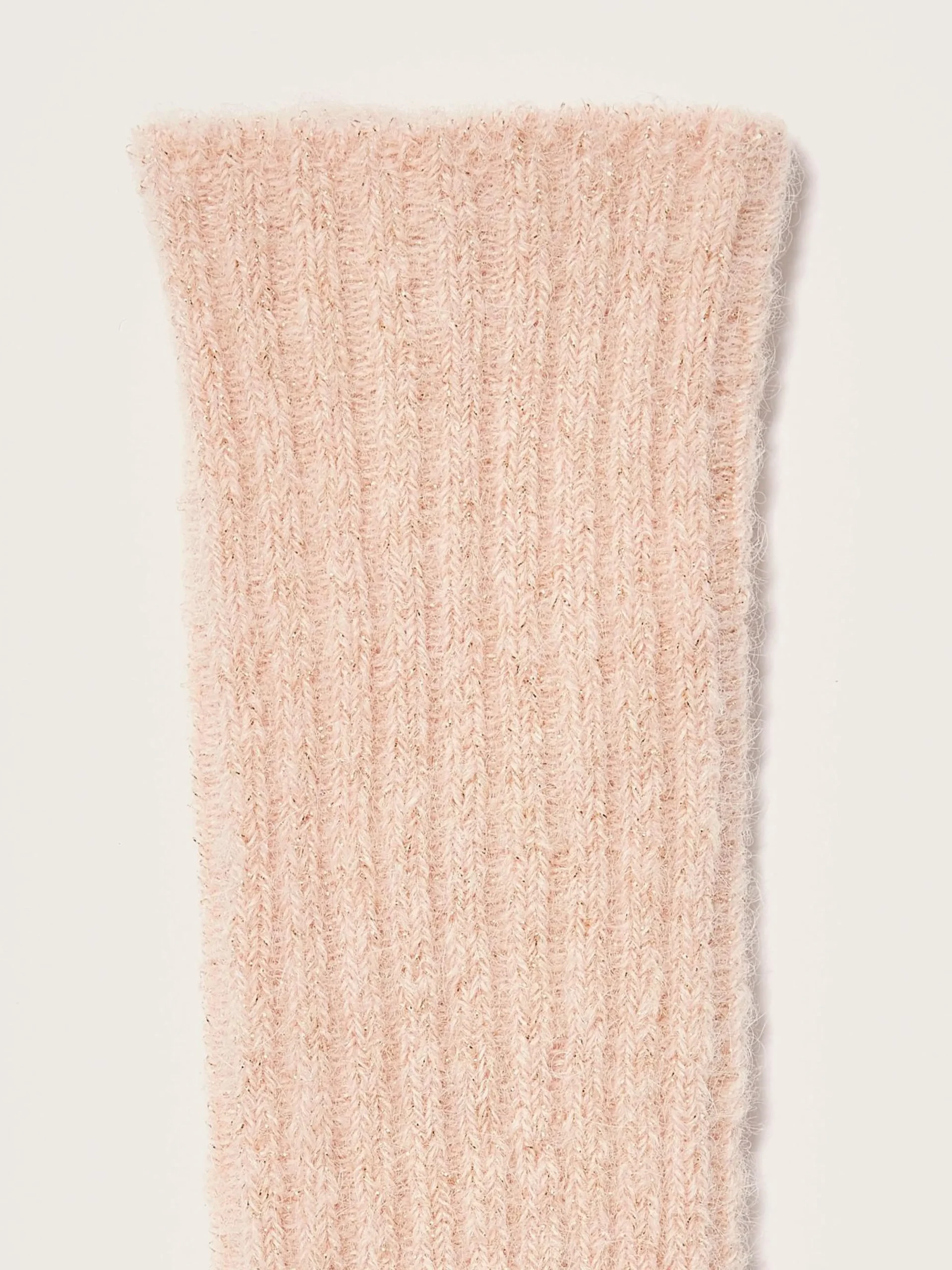 Klassieke, poederroze, ribgebreide sokken van lurexgaren.