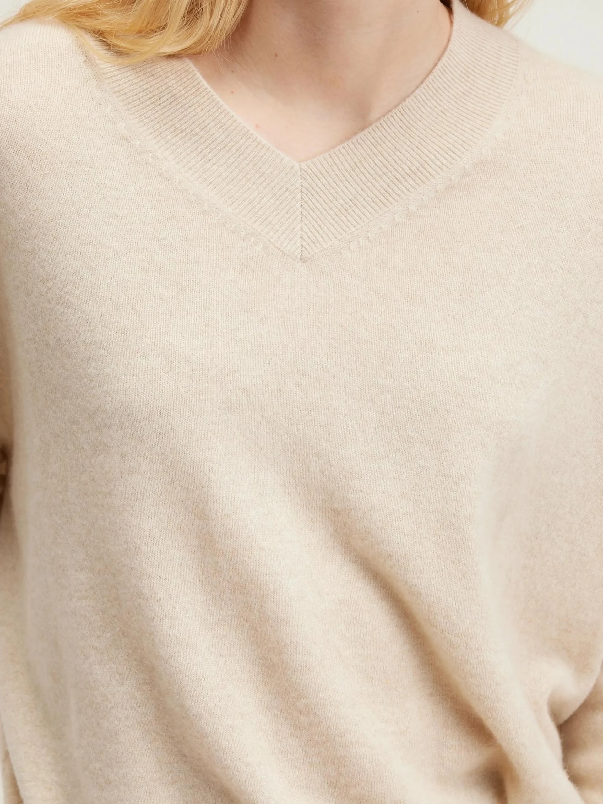 Oversizede havermoutkleurige trui van kasjmier, met V-hals.