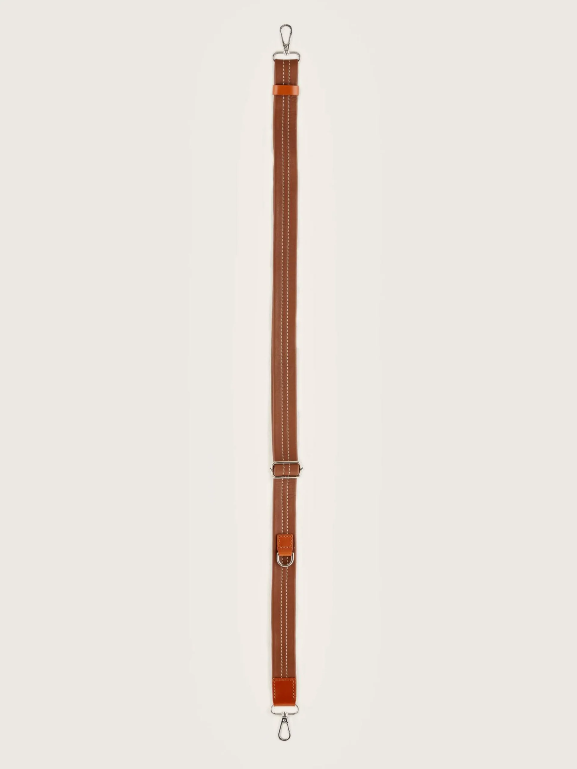 Verstelbare riem van cognac-kleurig glad leer met zilverkleurige hardware.