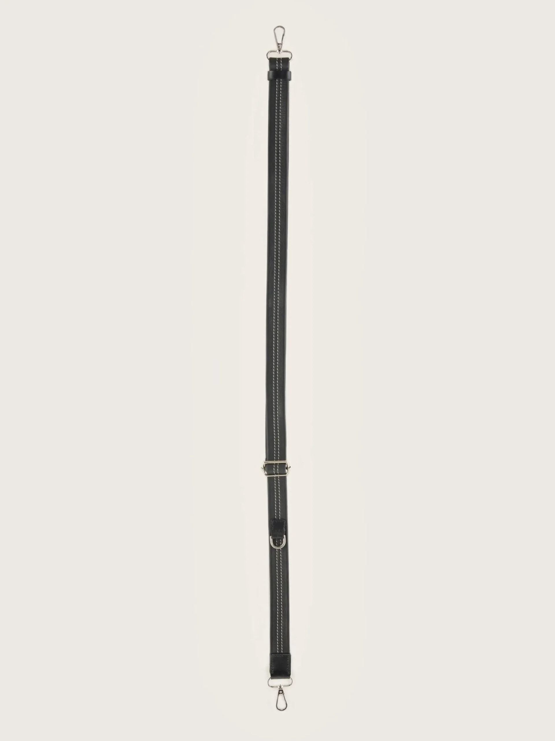Verstelbare riem van zwart glad leer met zilverkleurige hardware.