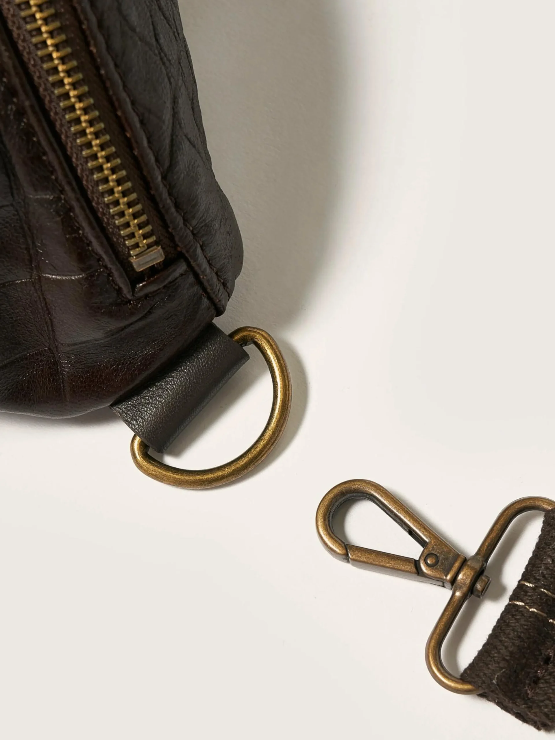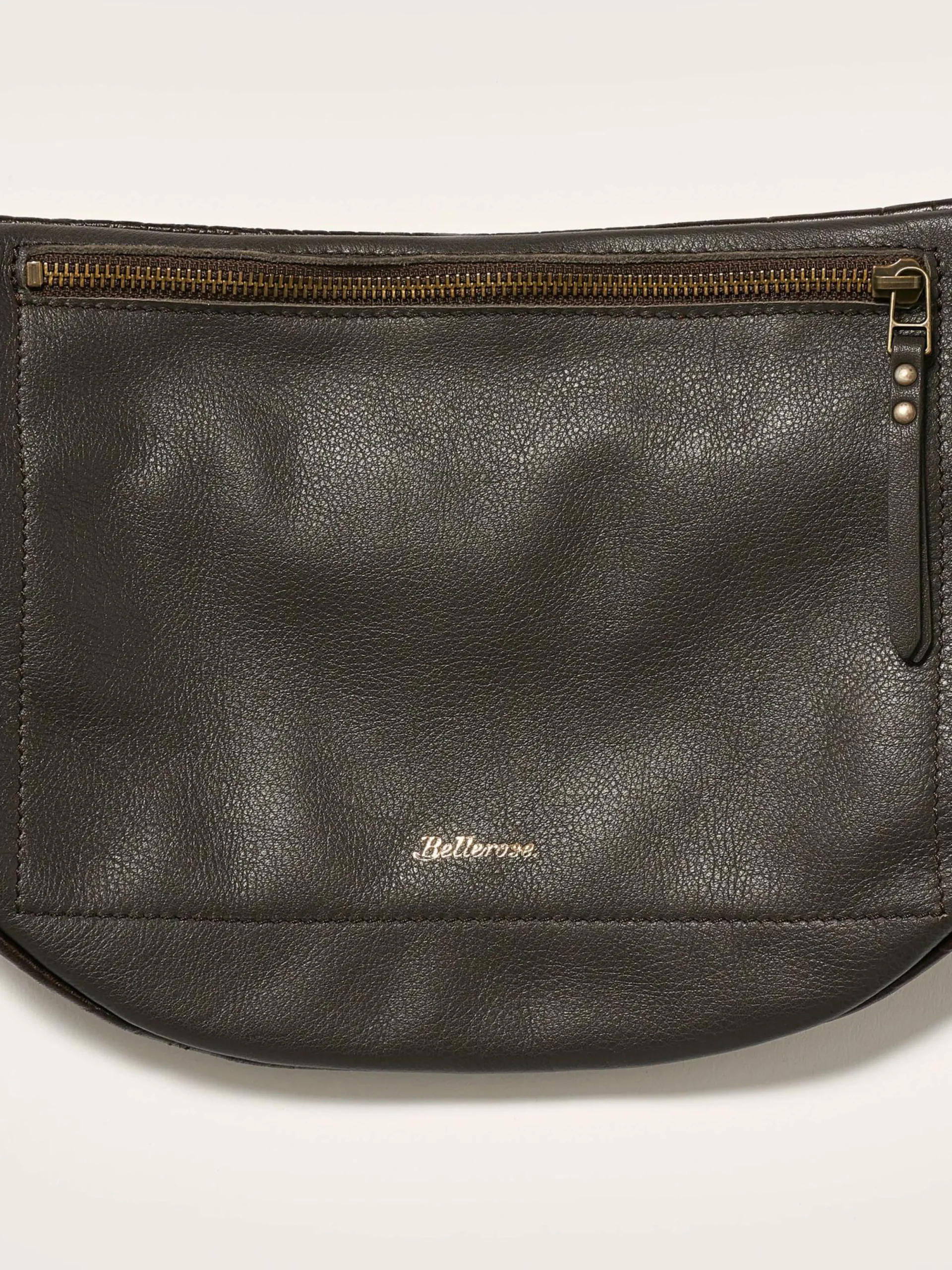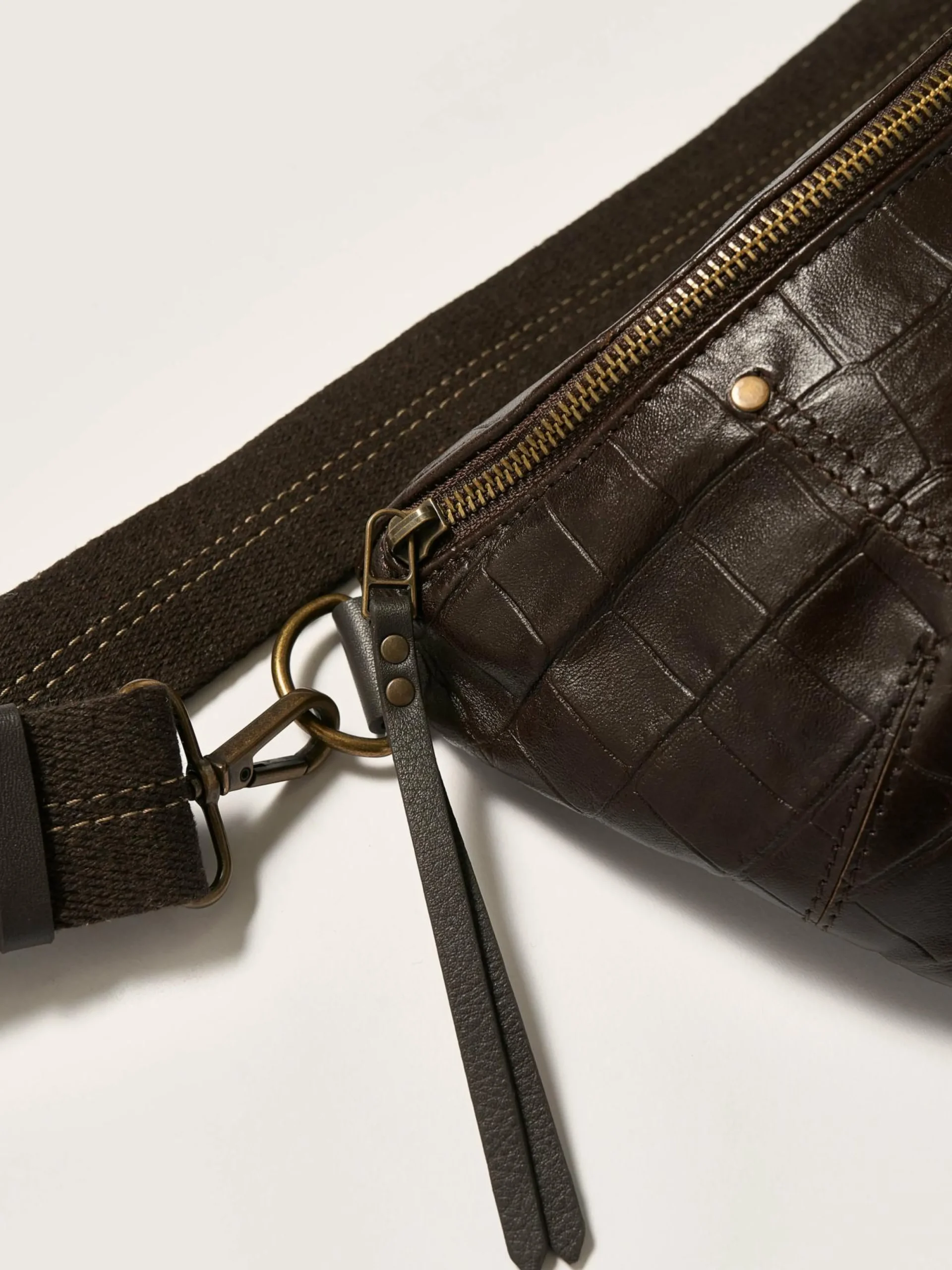 Soepele heuptas van donkerbruin gebosseerd leer met krokodil-look.