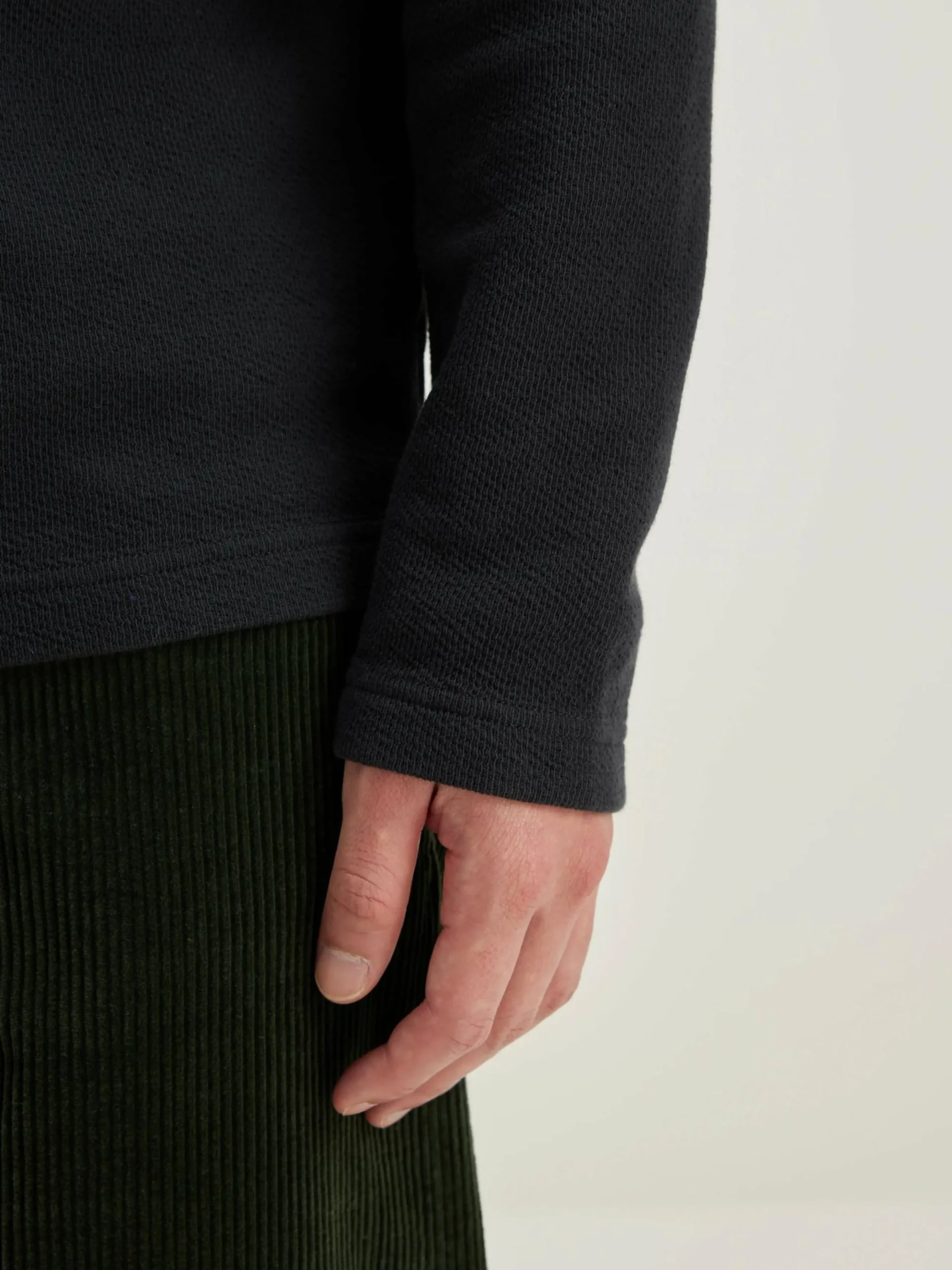 - Opstaande, geribde kraag met halve ritssluiting