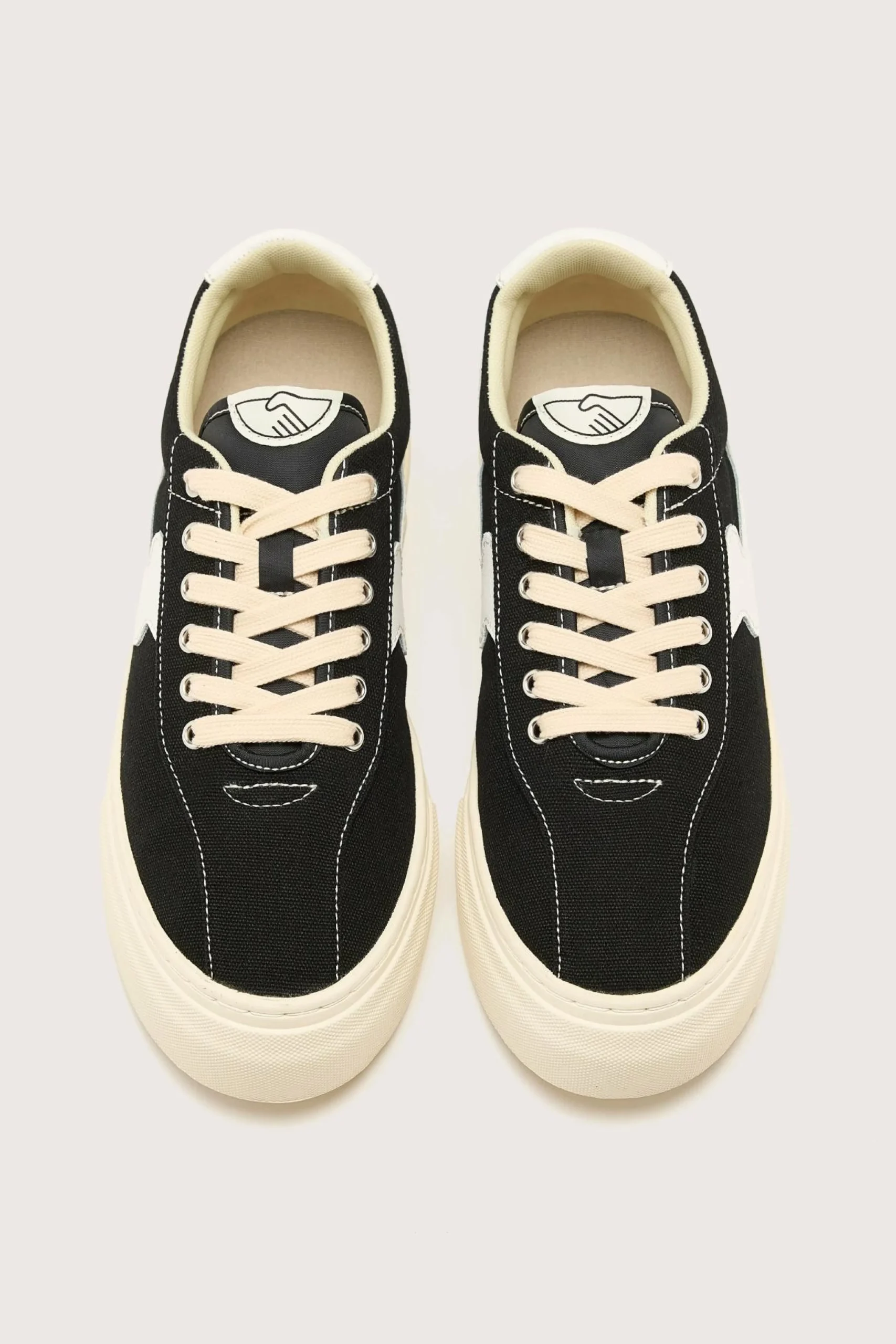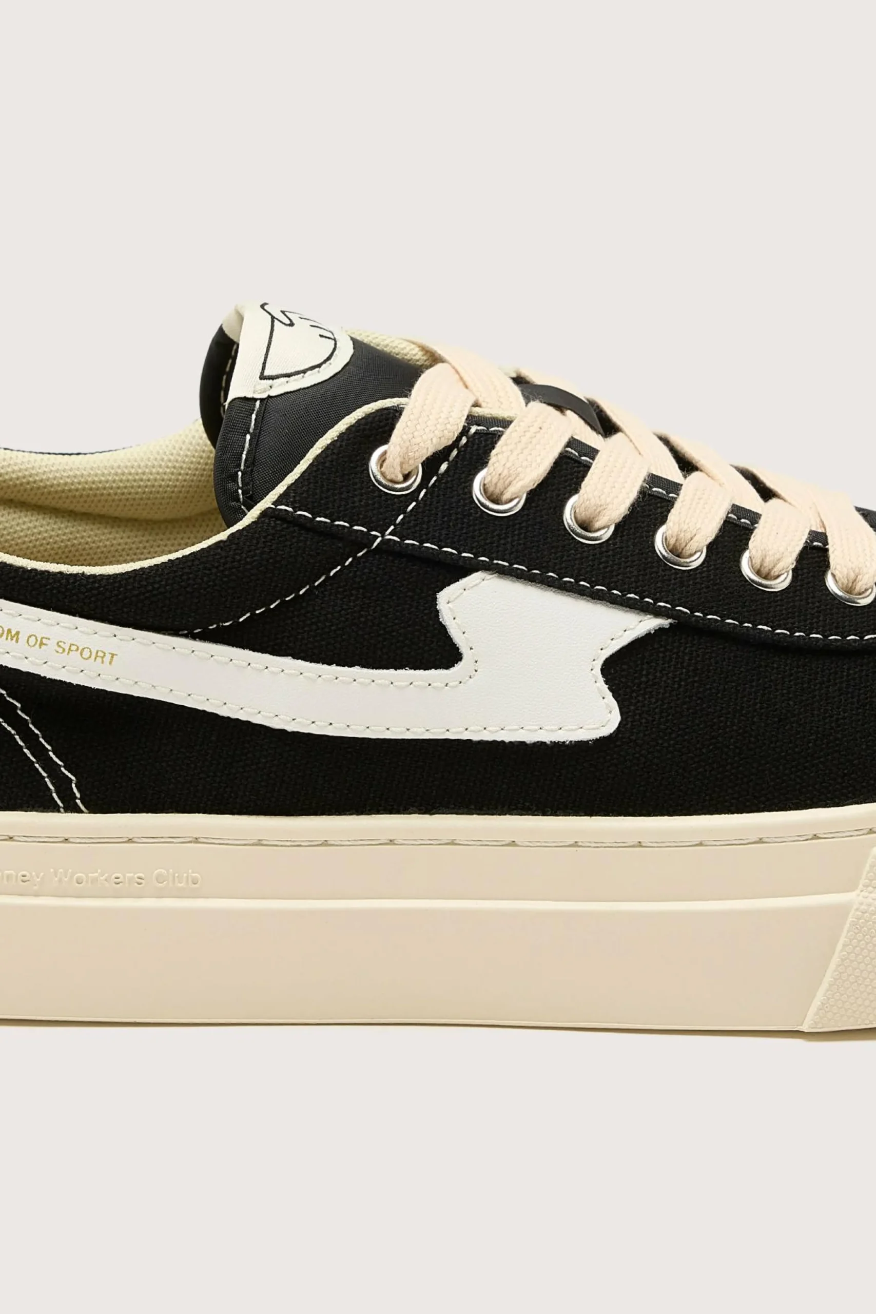 The Stepney Workers Club Dellow S-Strike sneaker features a canvas upper, a leather S-Strike, and high-wall foxings on a rubber cupsole.