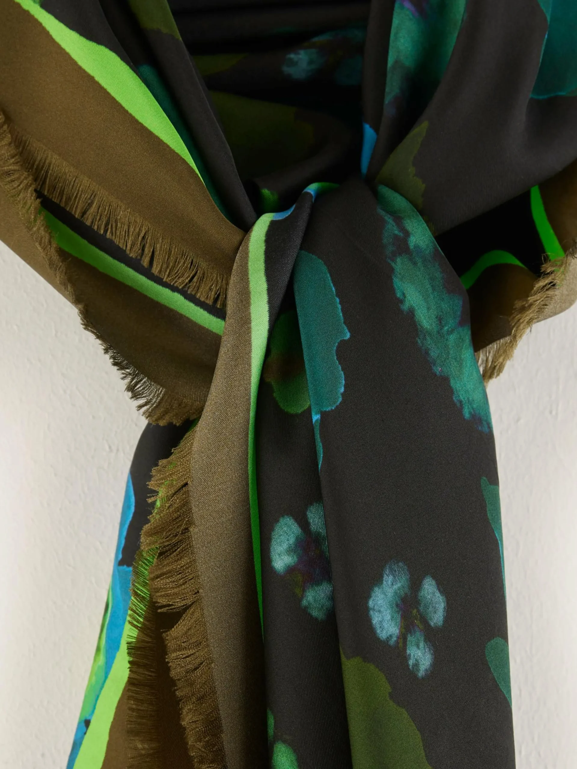 Vierkante gebloemde sjaal van keperzijde met neon rand.