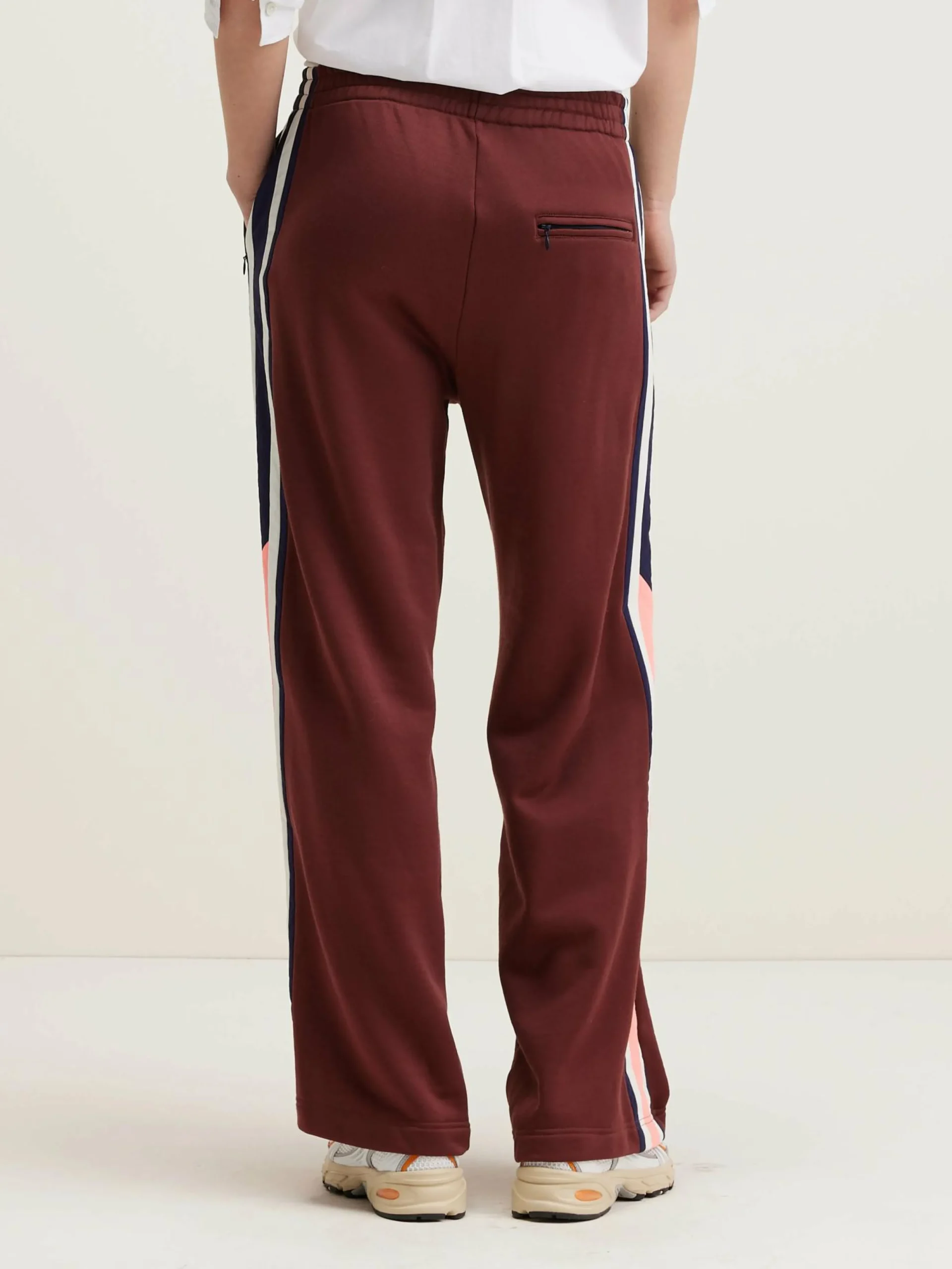 High-waist, granaatappelrode joggingbroek met contrasterende zijstrepen.
