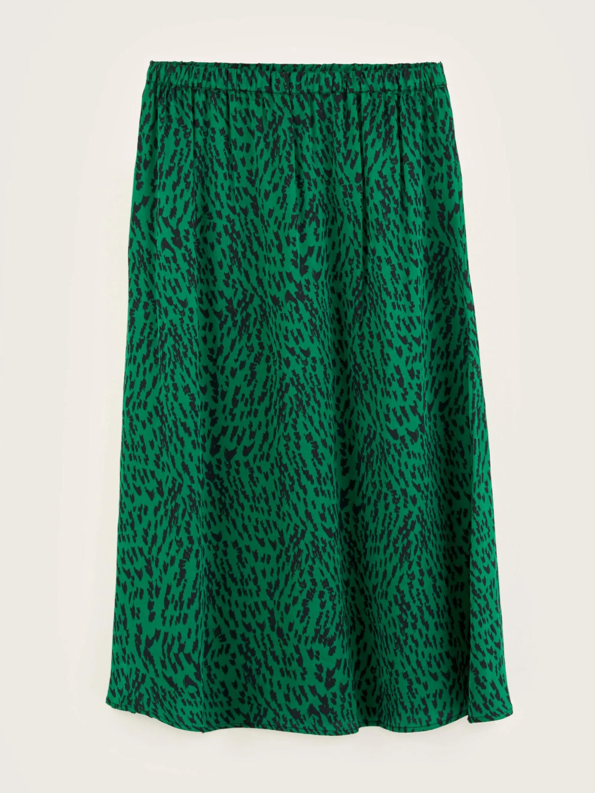 Midirok met elastische tailleband en diepe zijsplitten, van groene viscose met luipaardprint.