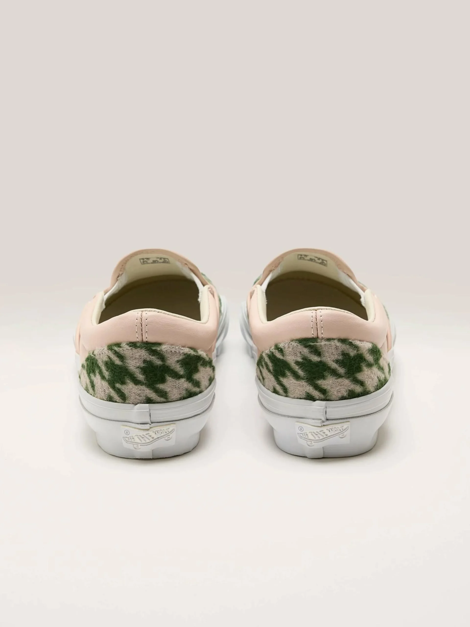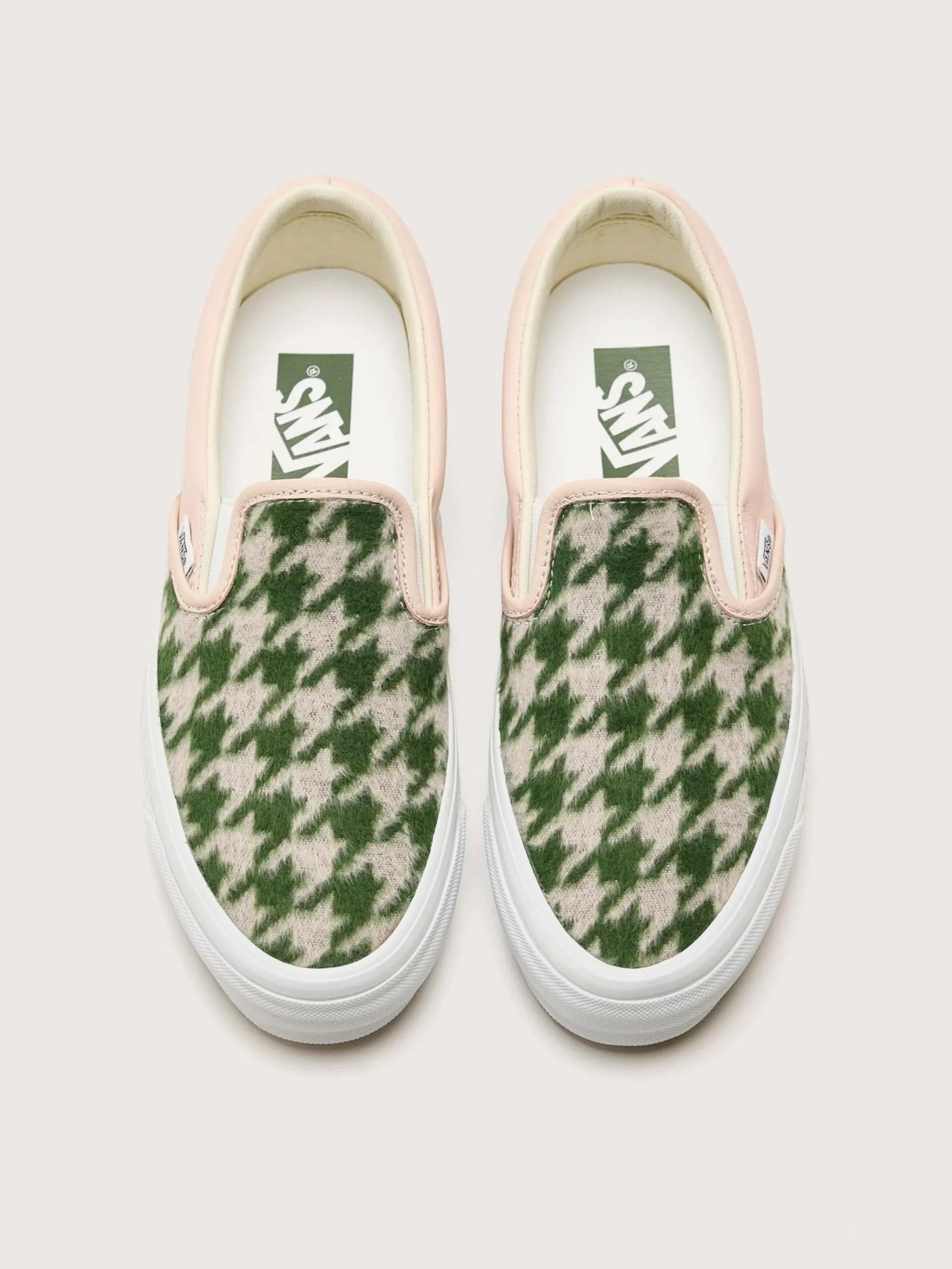 De Vans Slip-on Reissue 98 schoenen hebben een bovenwerk van canvas en leder met houndstooth print en een rubberen buitenzool met hoge zijwand.