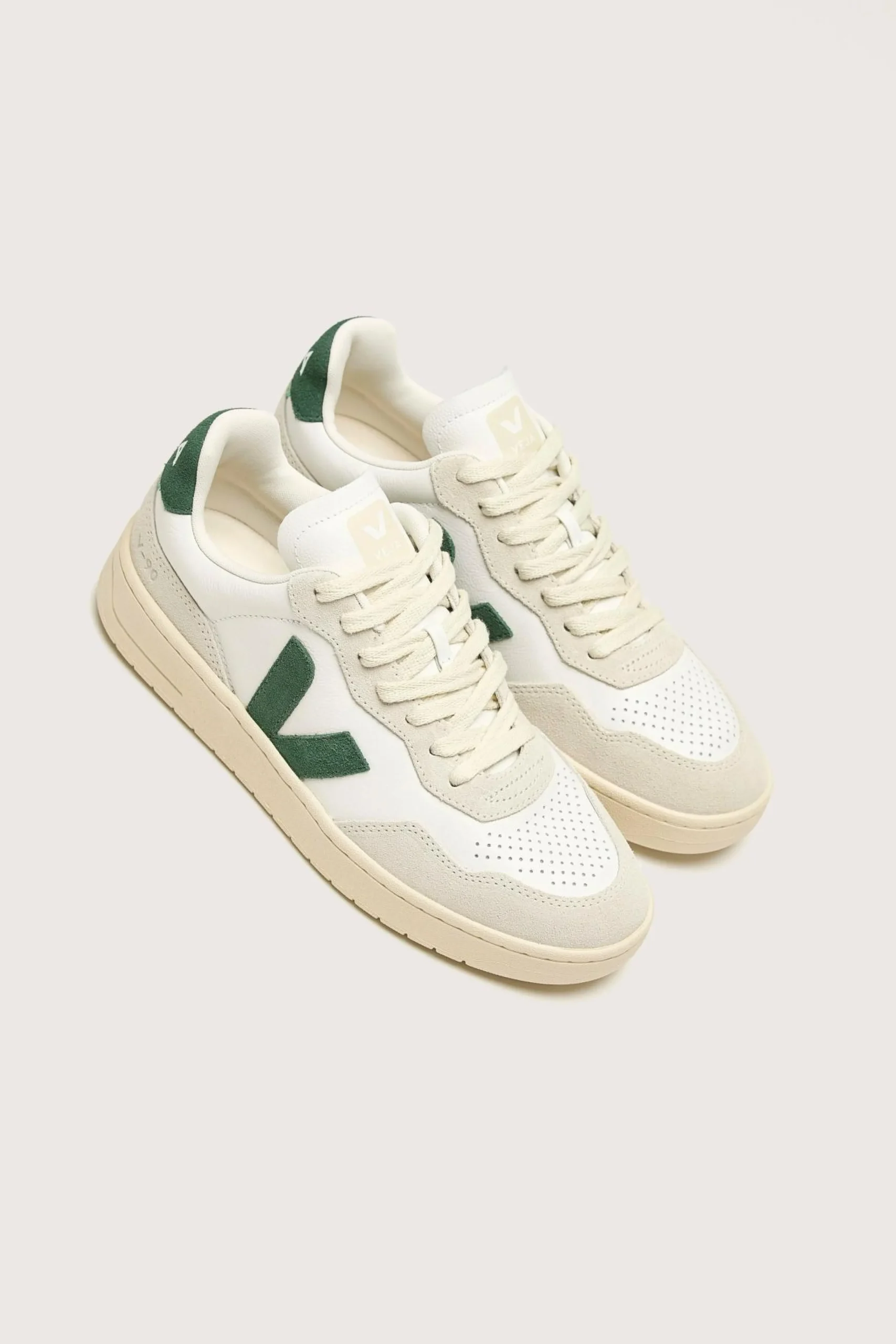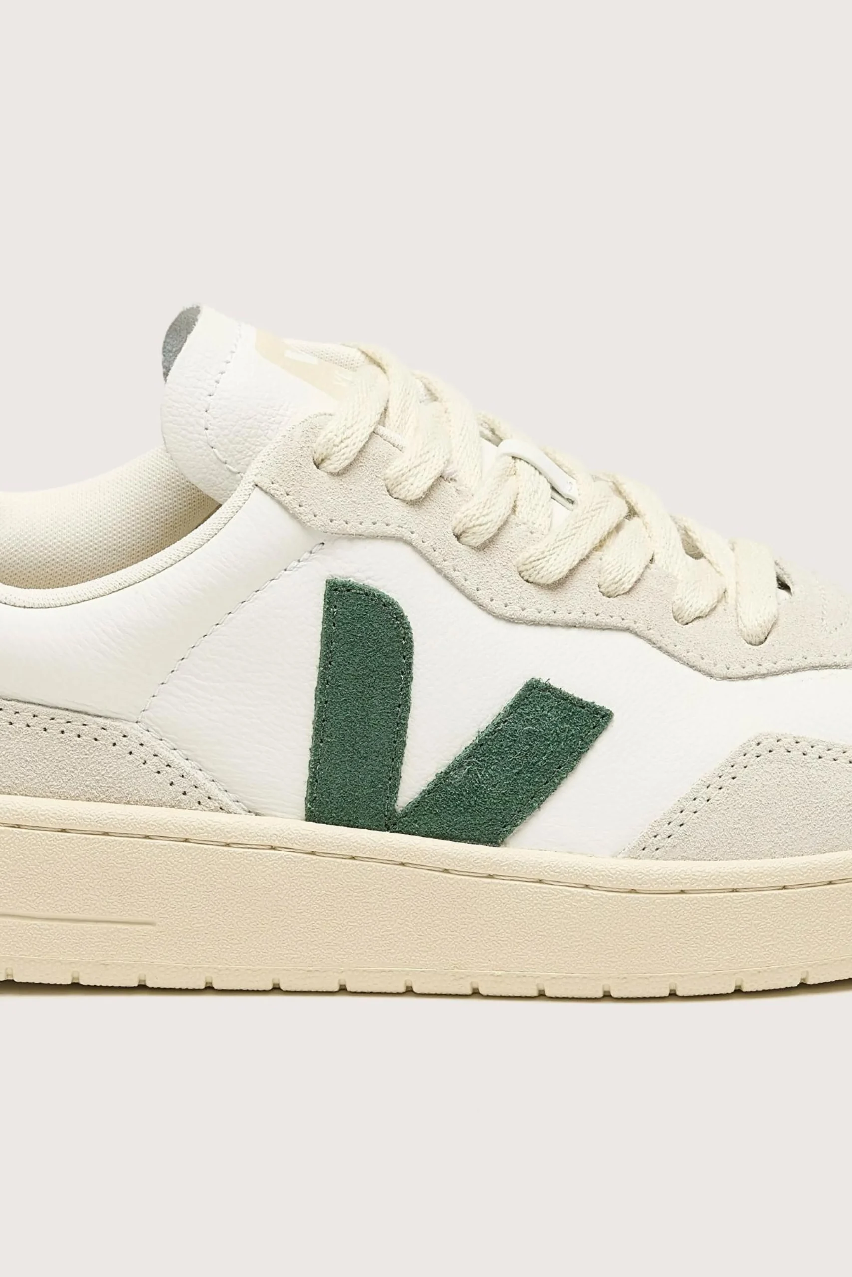 The Veja V-90 sneakers feature Organic Traced leather uppers with iconic Amazonian rubber outsoles and eco-friendly design elements.