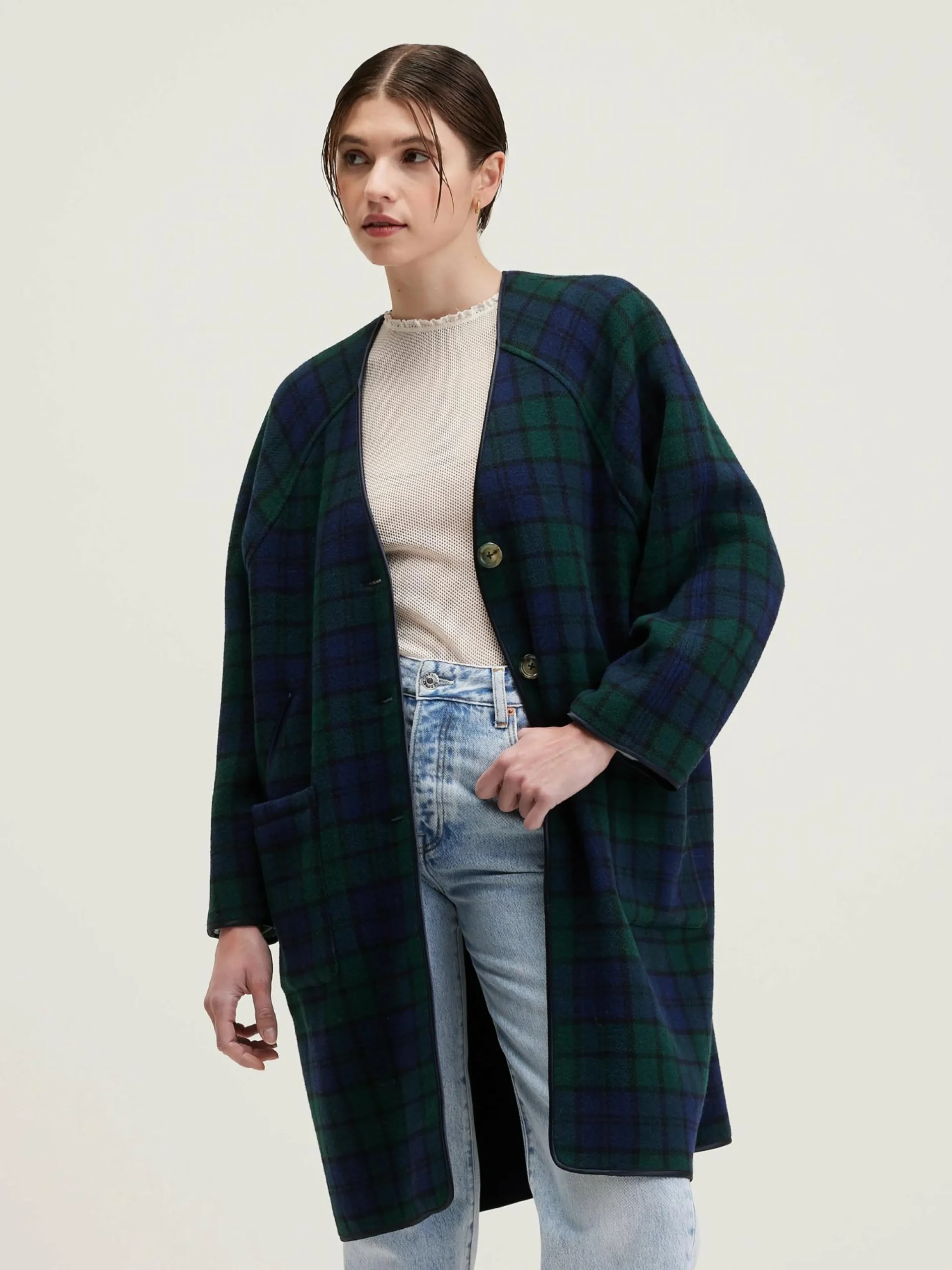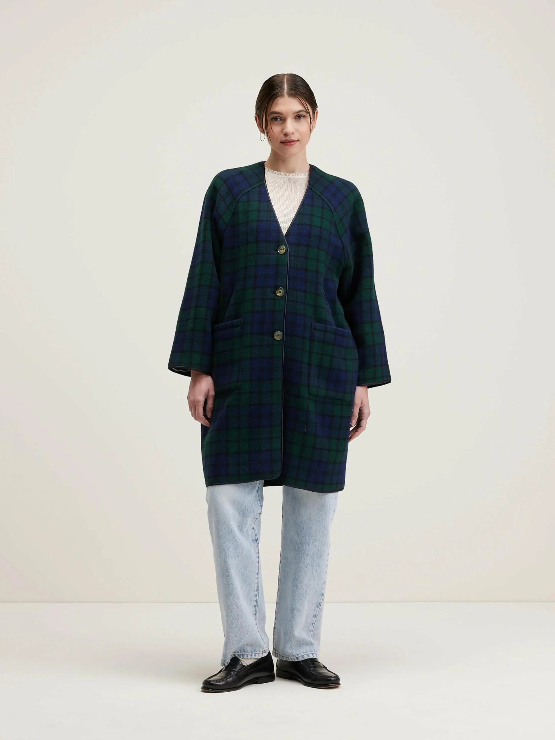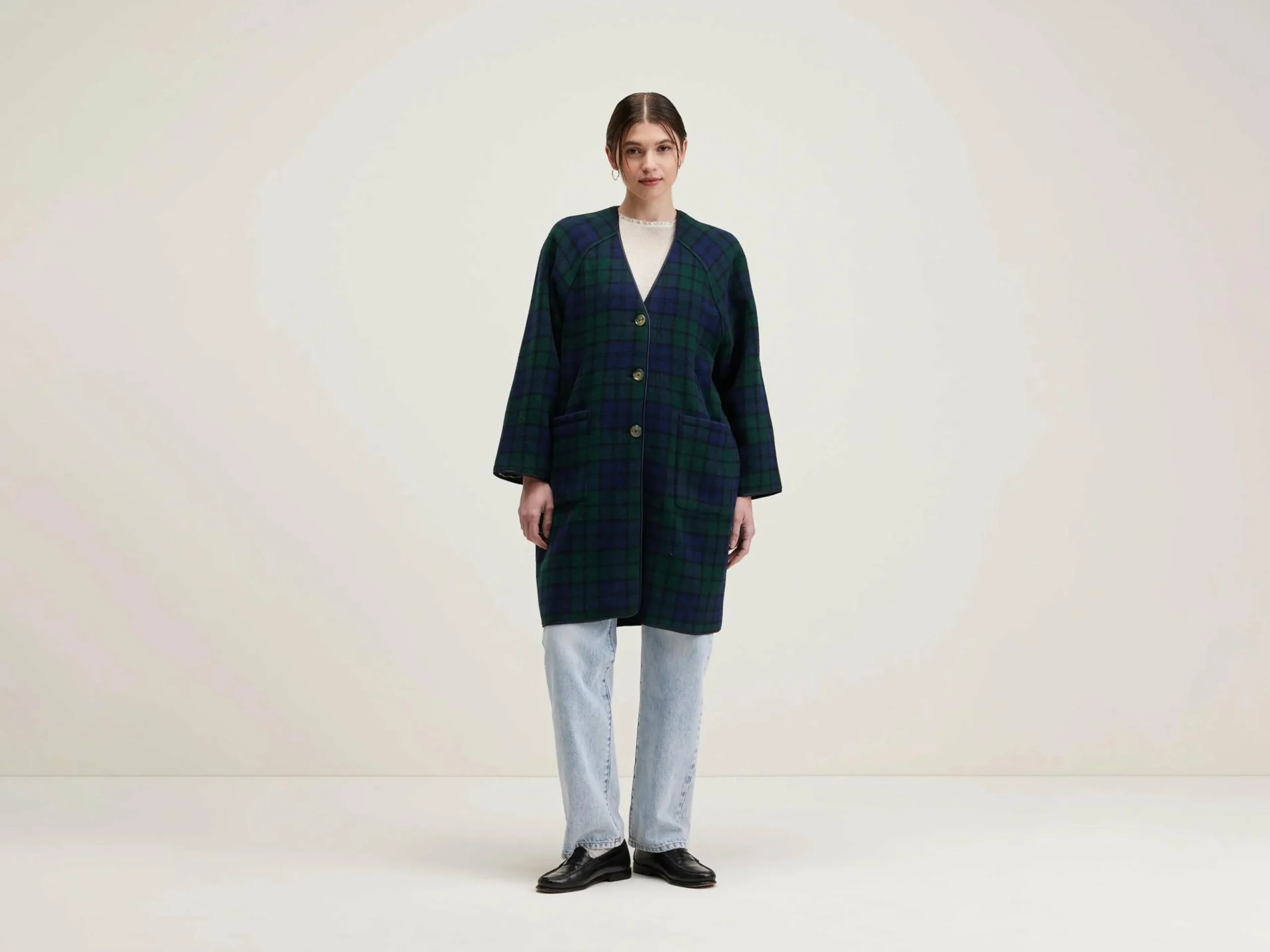 Lange mantel zonder kraag, met v-hals, in black watch ruiten.