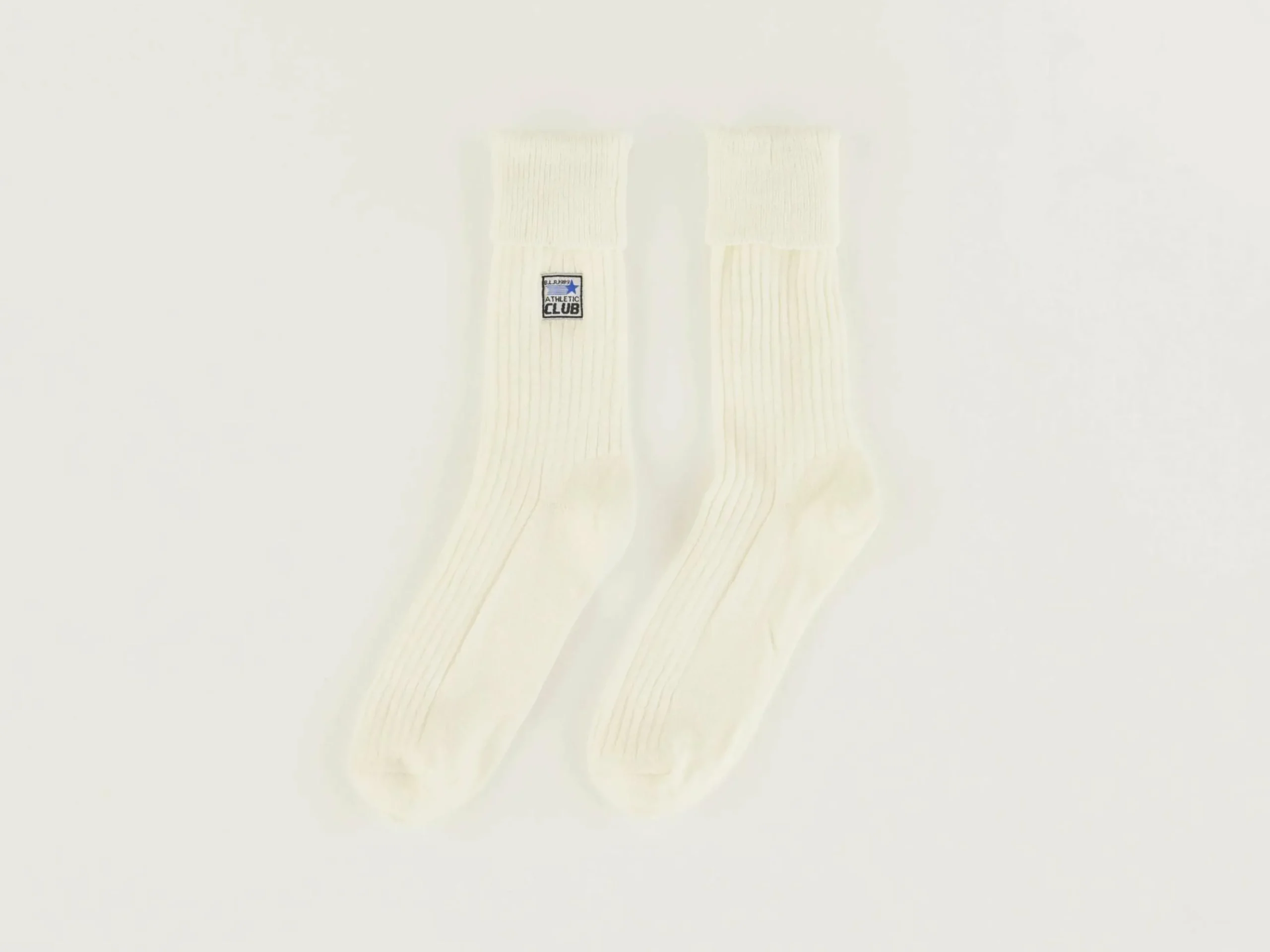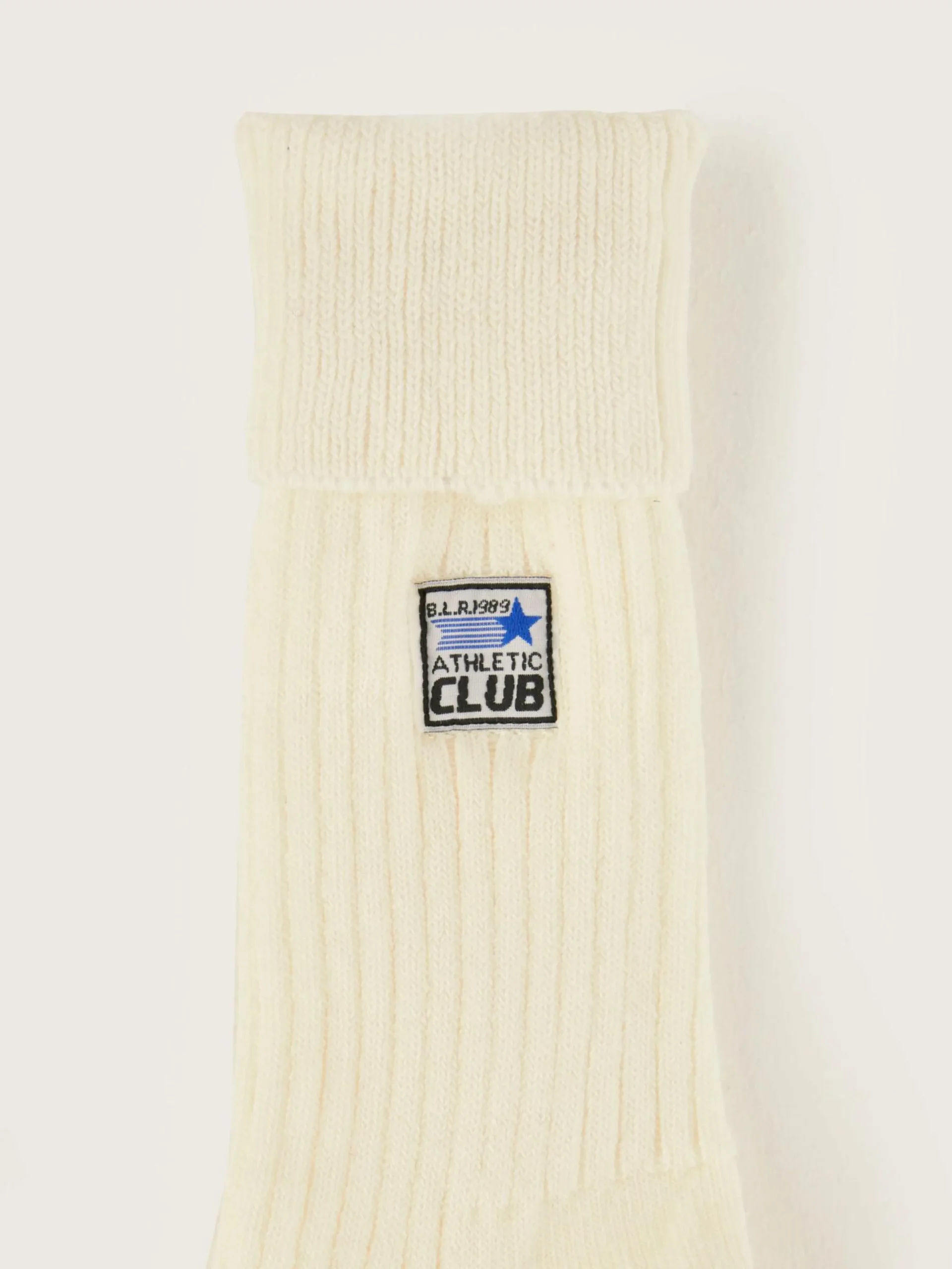 Geribde sokken van ecru wolmix, met Bellerose Athletic Club-label.