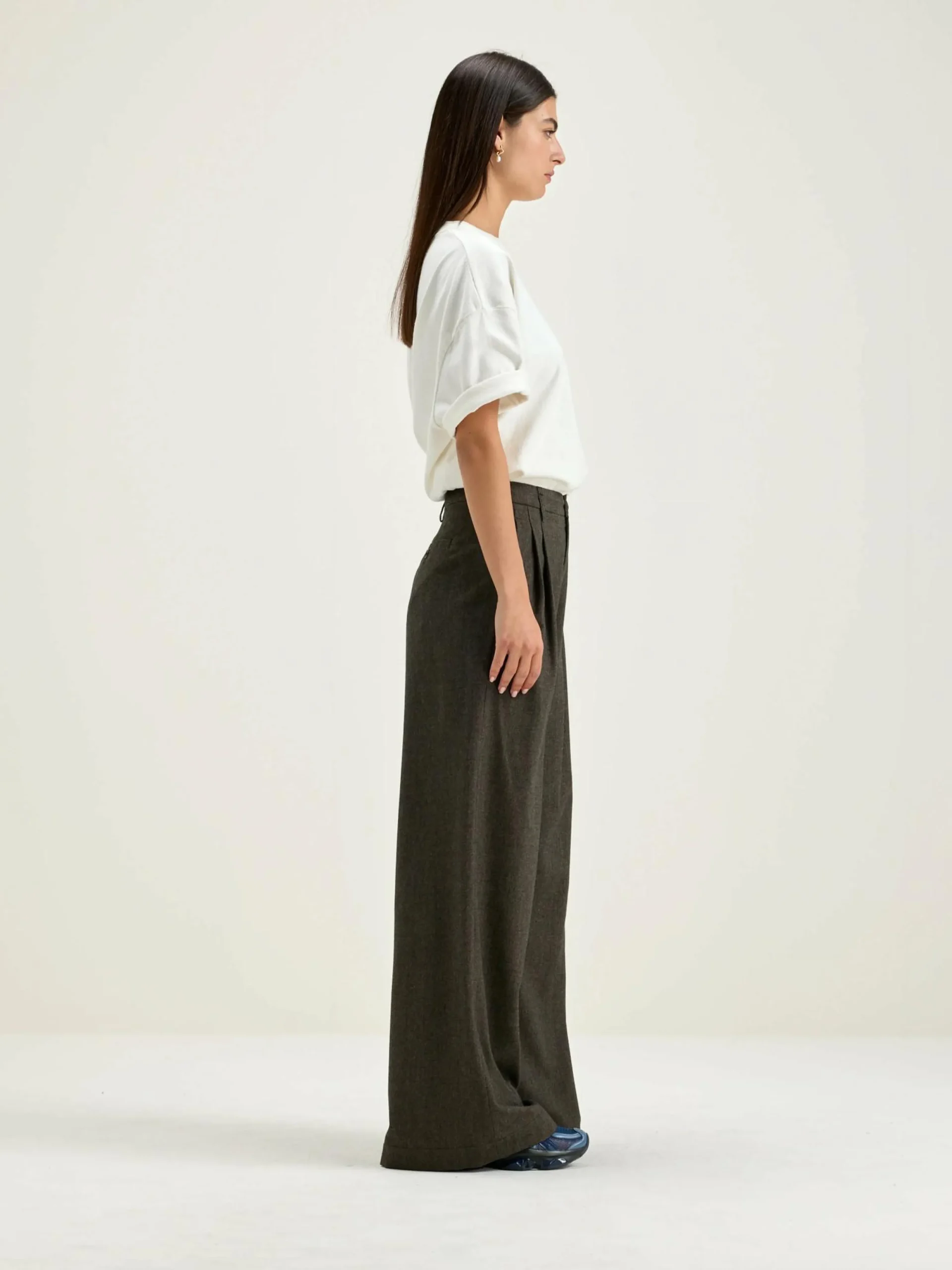 Elegante high-waist broek met wijde pijpen en plooien vooraan, van bruine, flanelachtige stof.