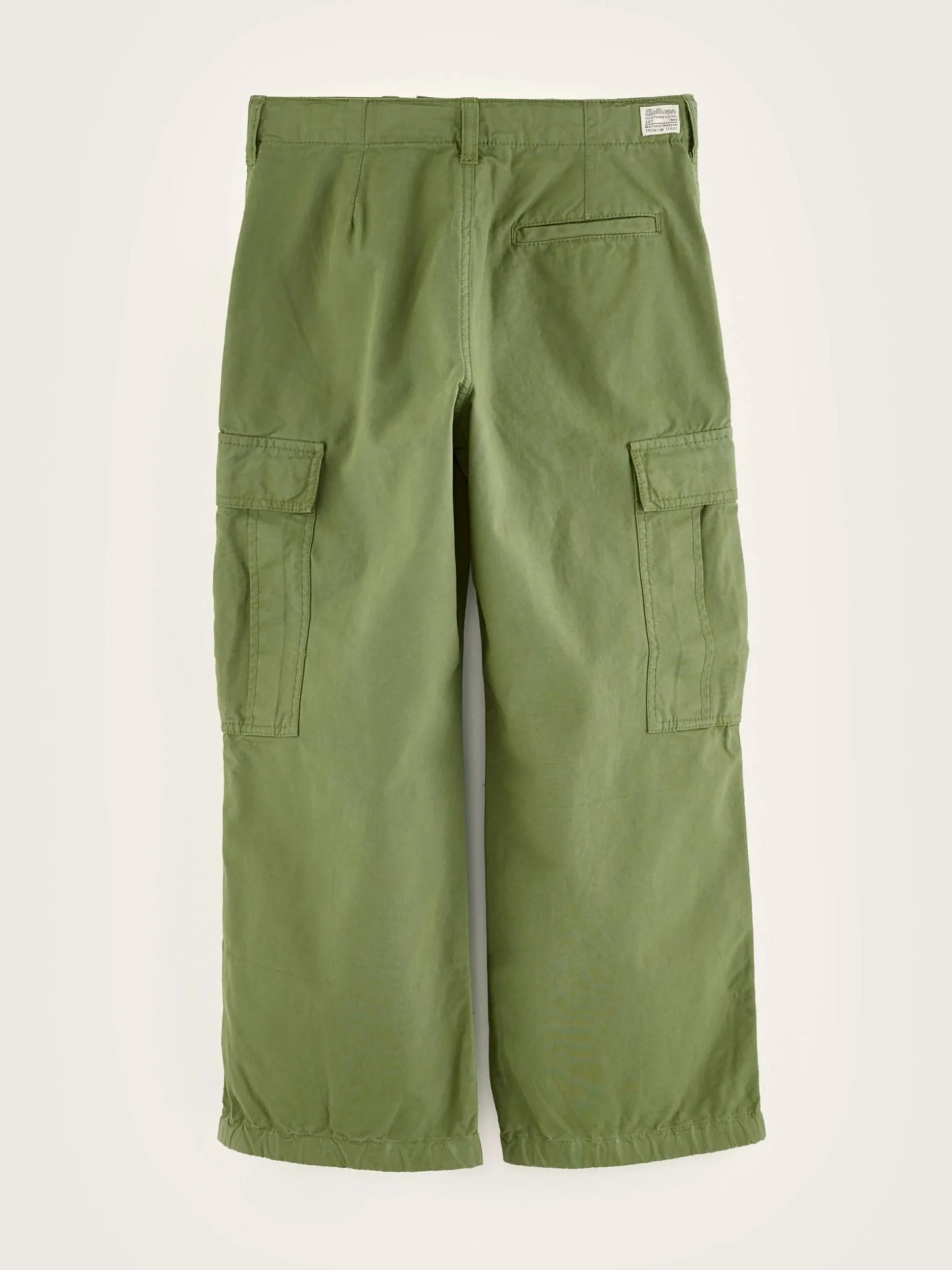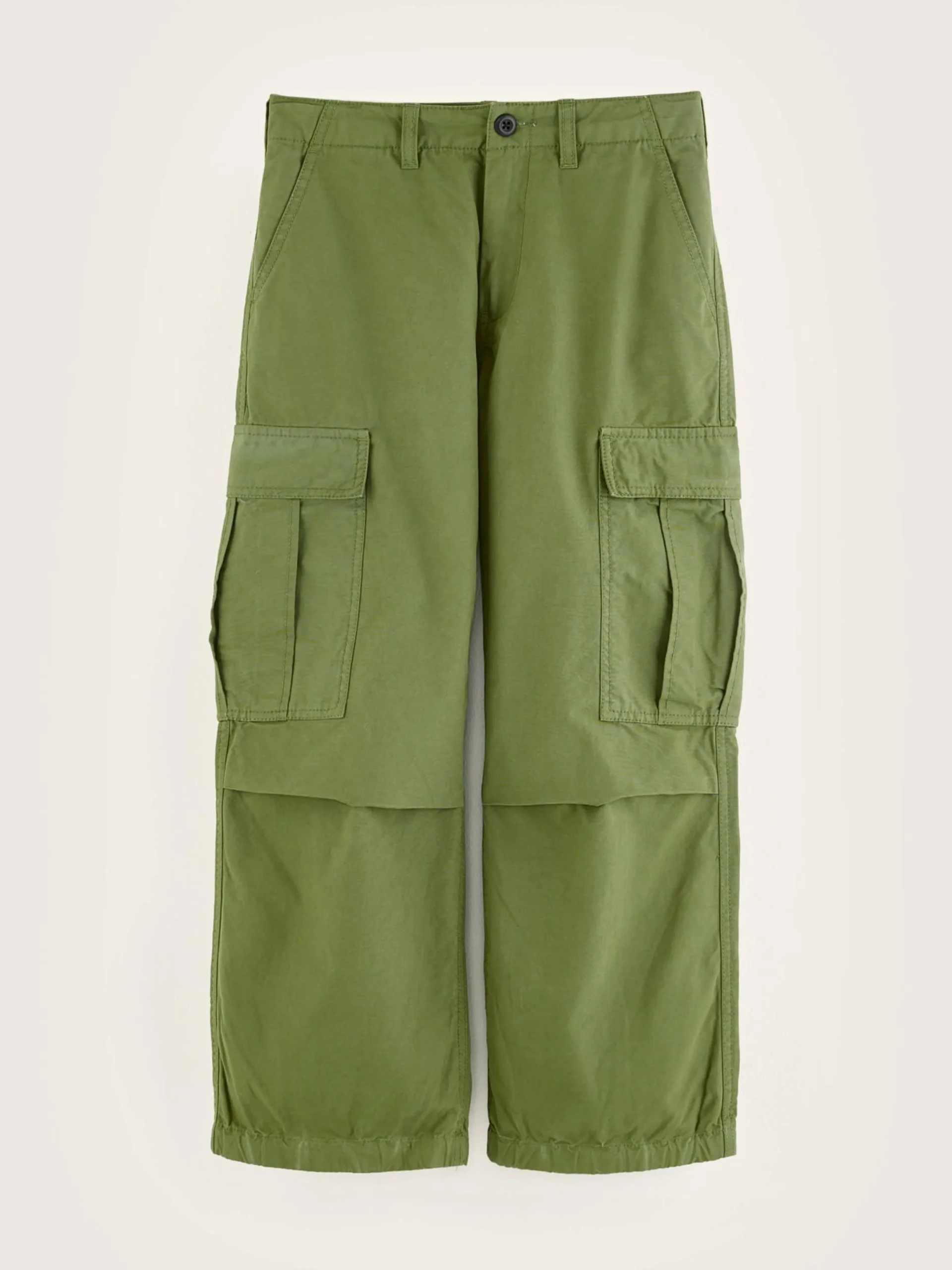Kaki broek in cargostijl, met wijde pijpen.