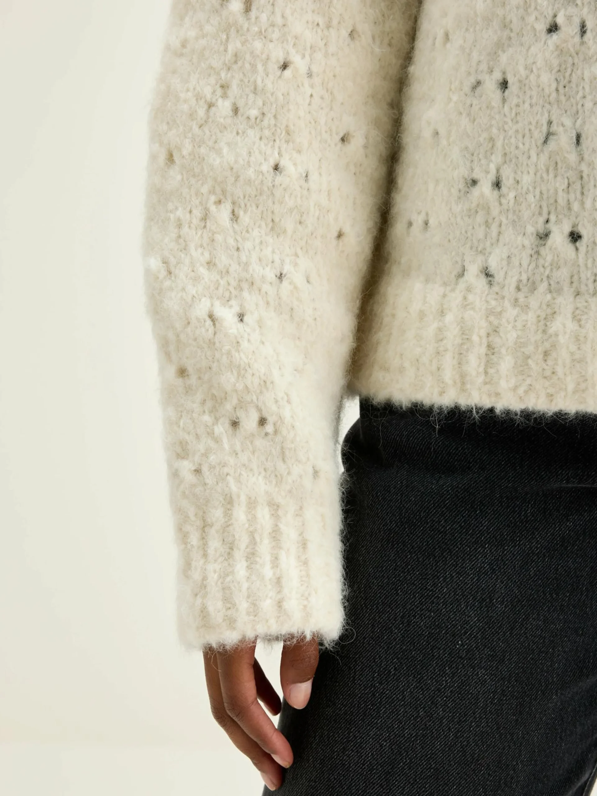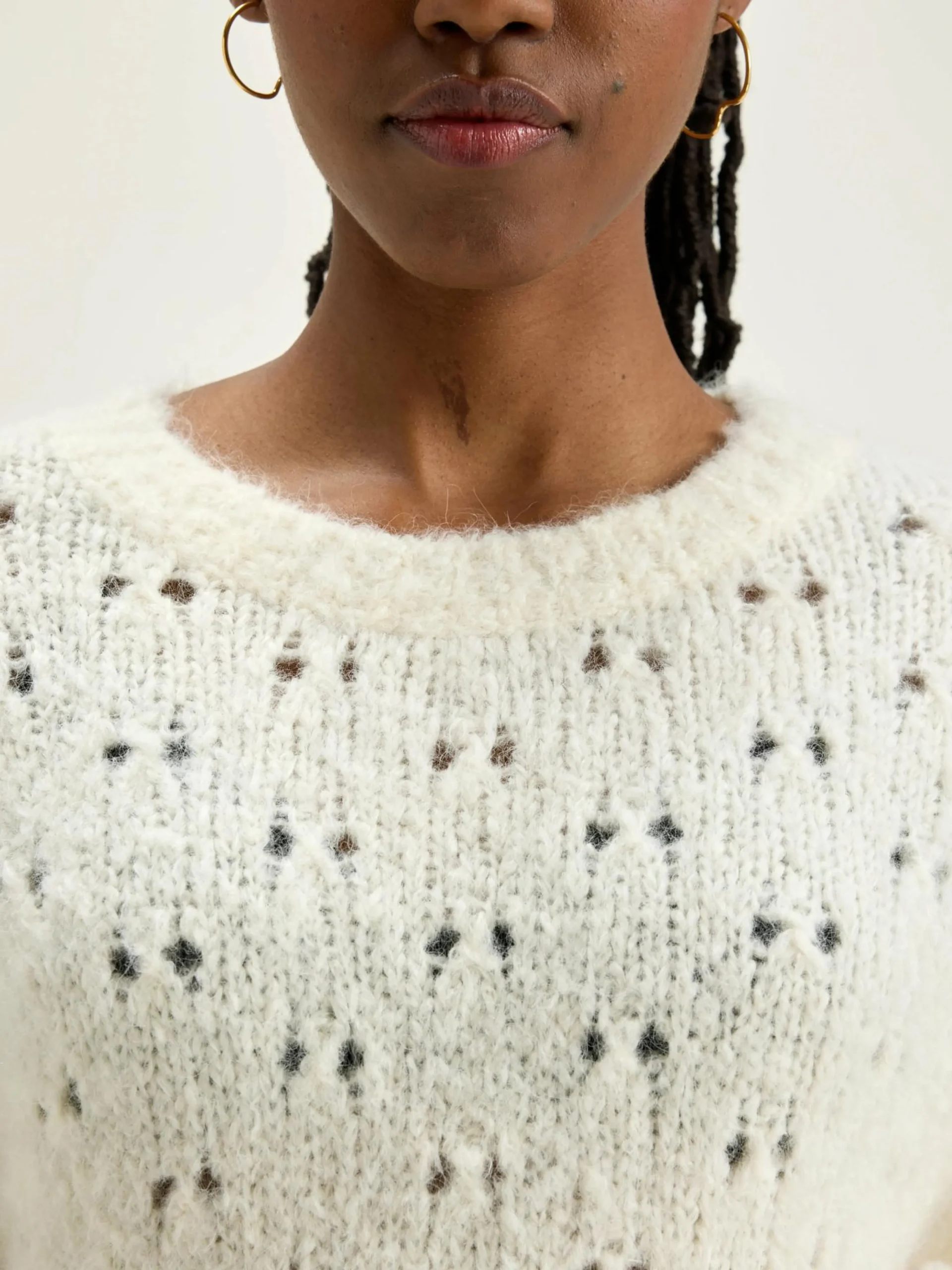 Klassieke trui van open breiwerk in gebroken wit.