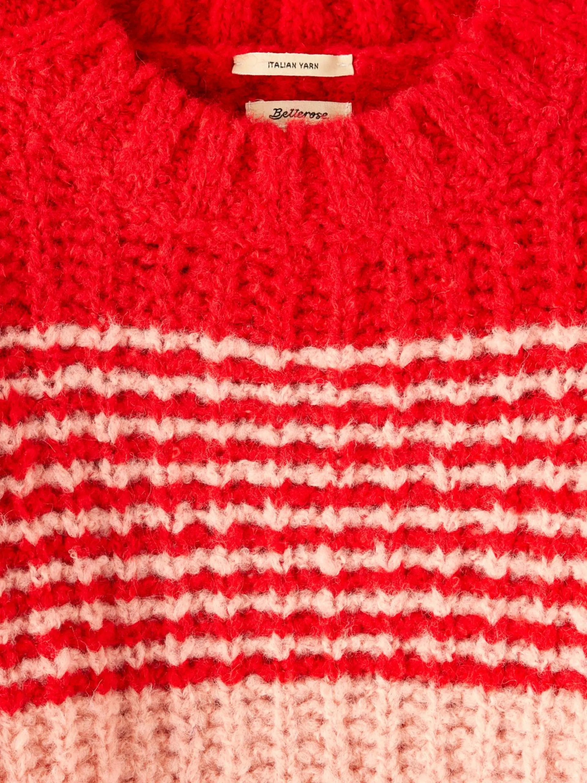 Losse averecht gebreide trui met rode strepen.