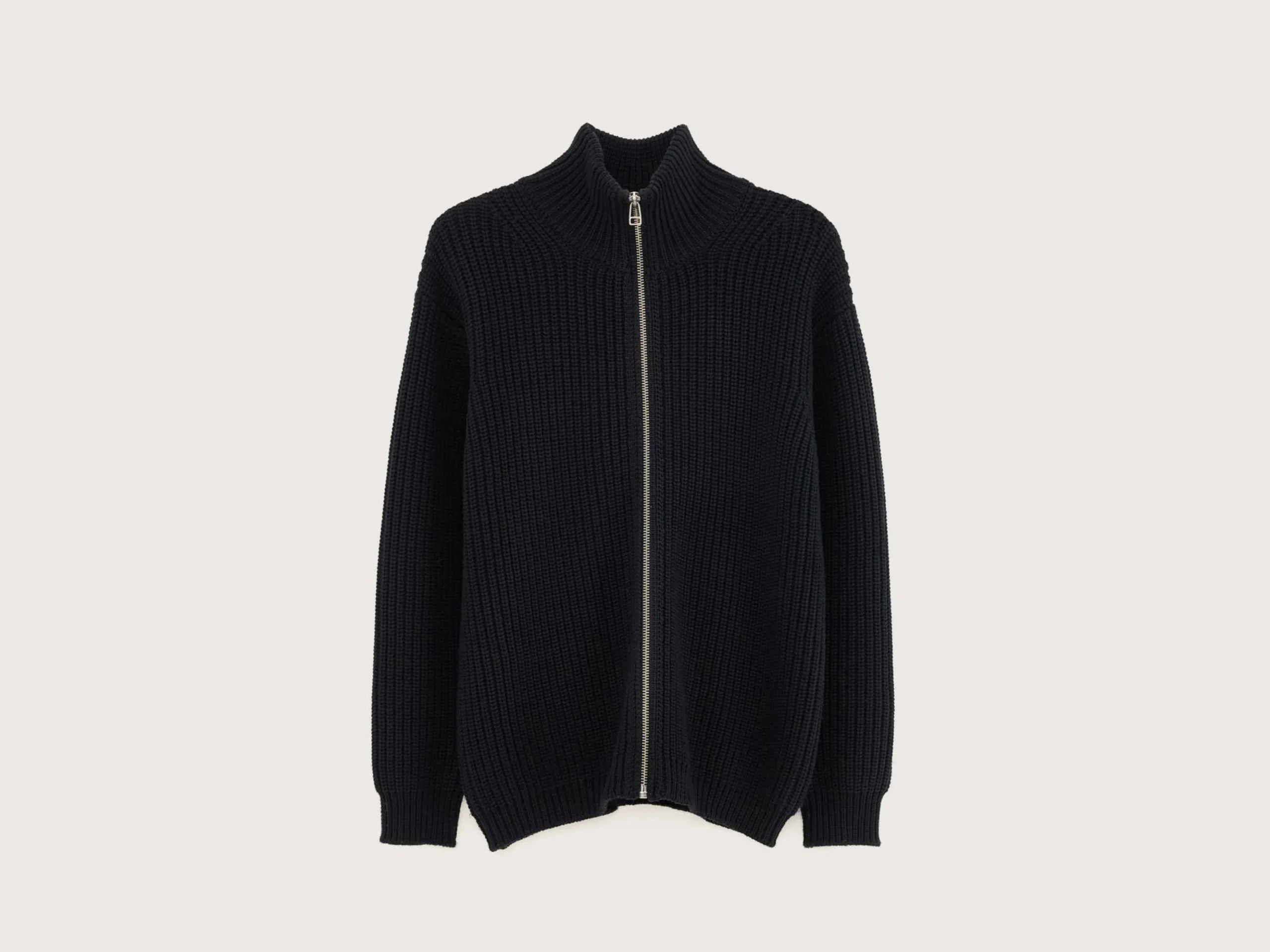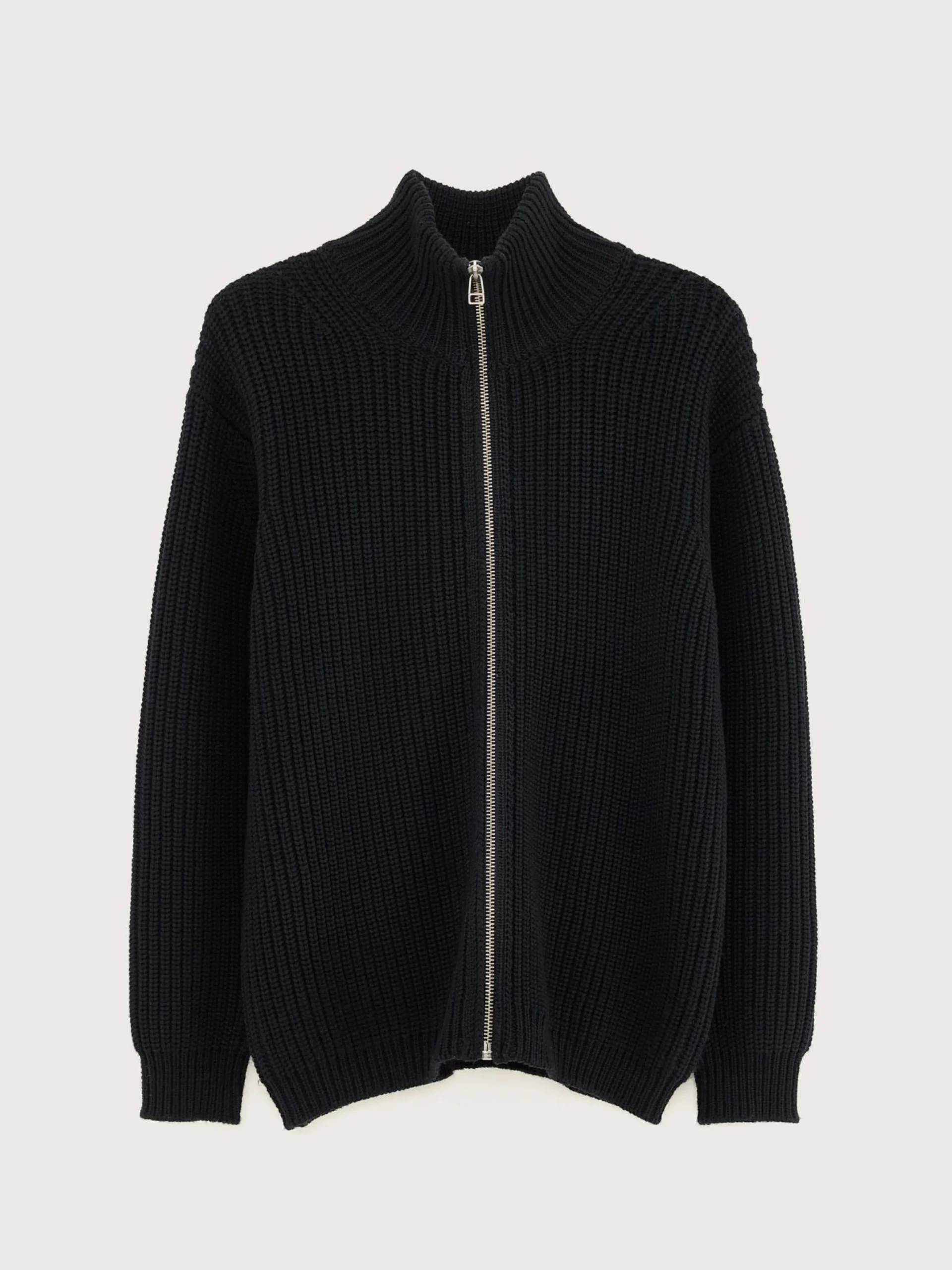 Comfortabele cardigan met ritssluiting vooraan, van marineblauwe, grove wol.