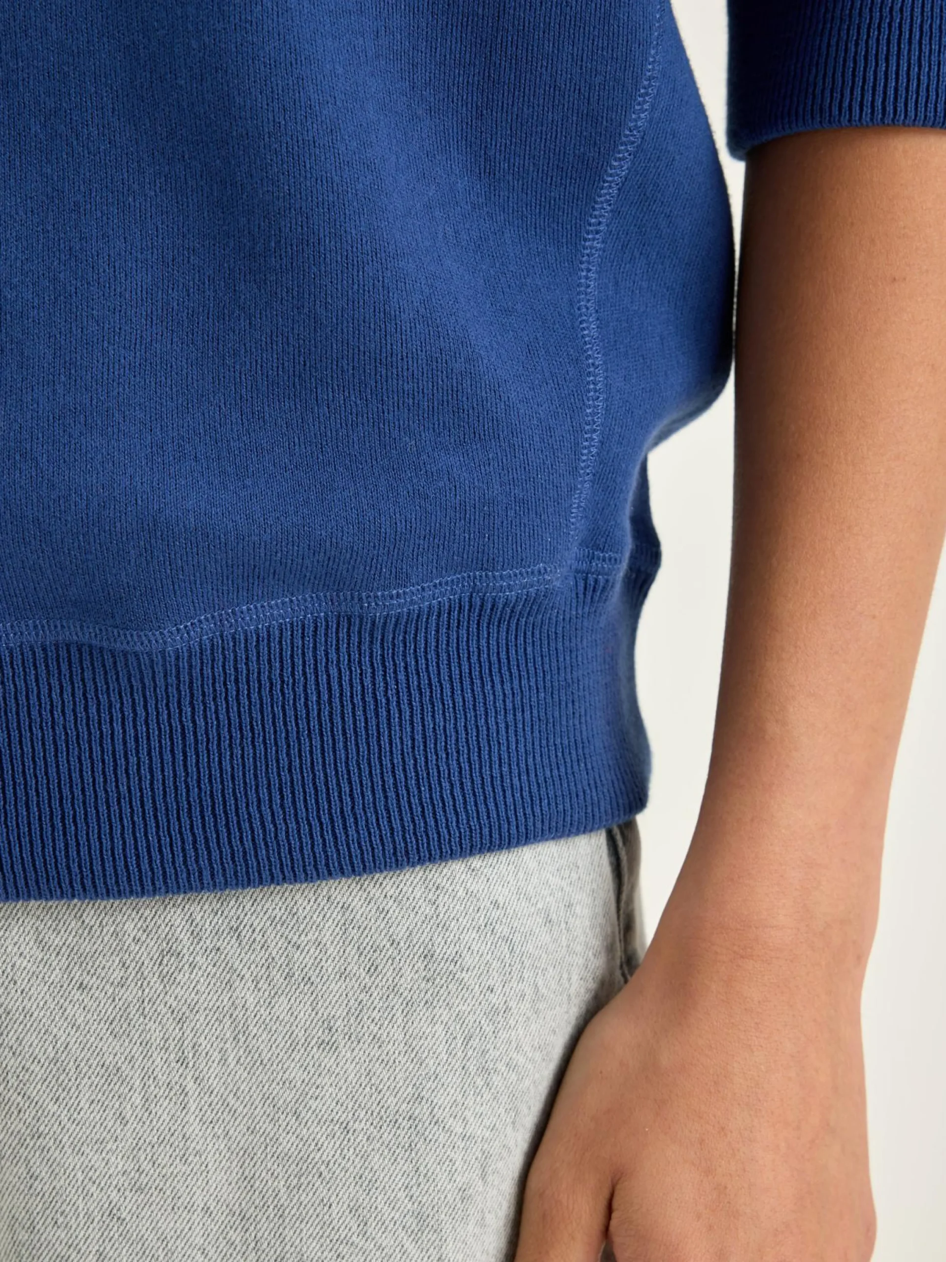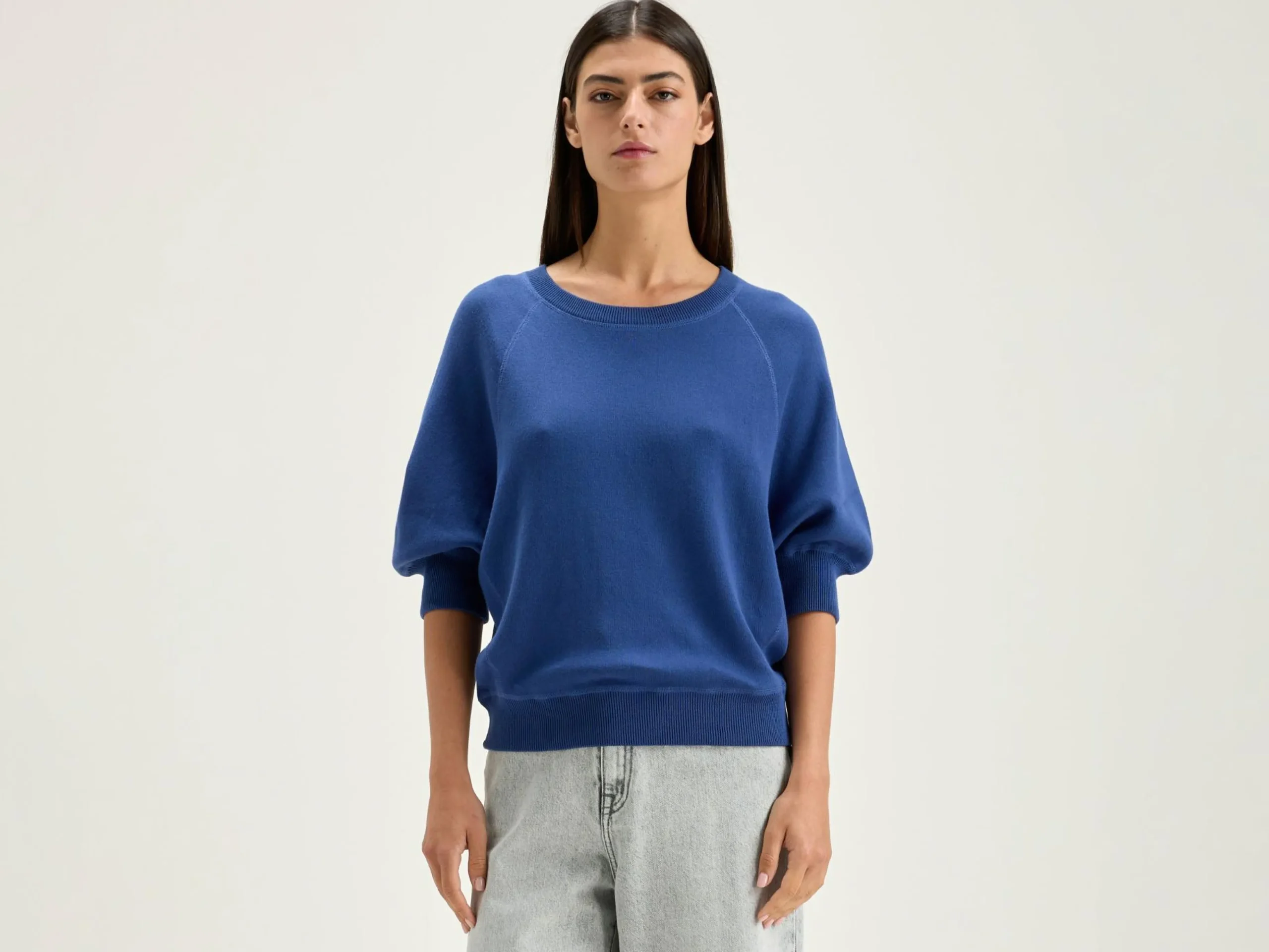 Oversizede crewneck trui met 3/4 mouwen en geribde boorden in blauwe jeans katoen.