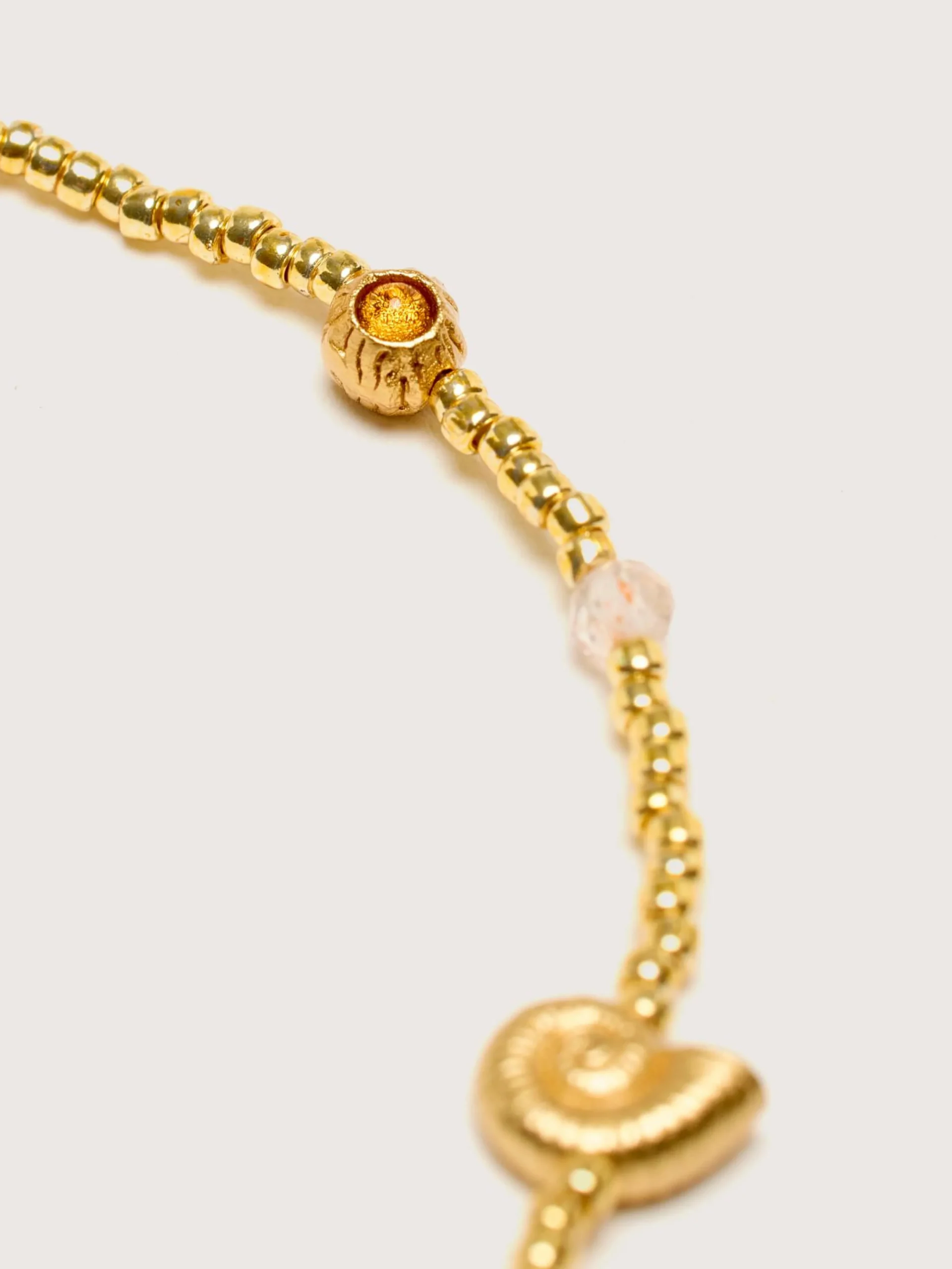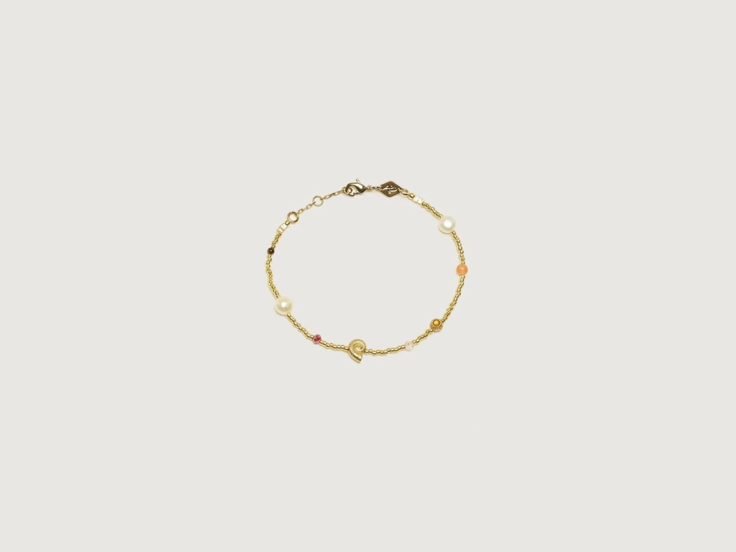 De Anni Lu Spirale d’Or armband heeft een op de oceaan geïnspireerd ontwerp met glazen kralen, stenen, zoetwaterparels en 18k verguld messing.