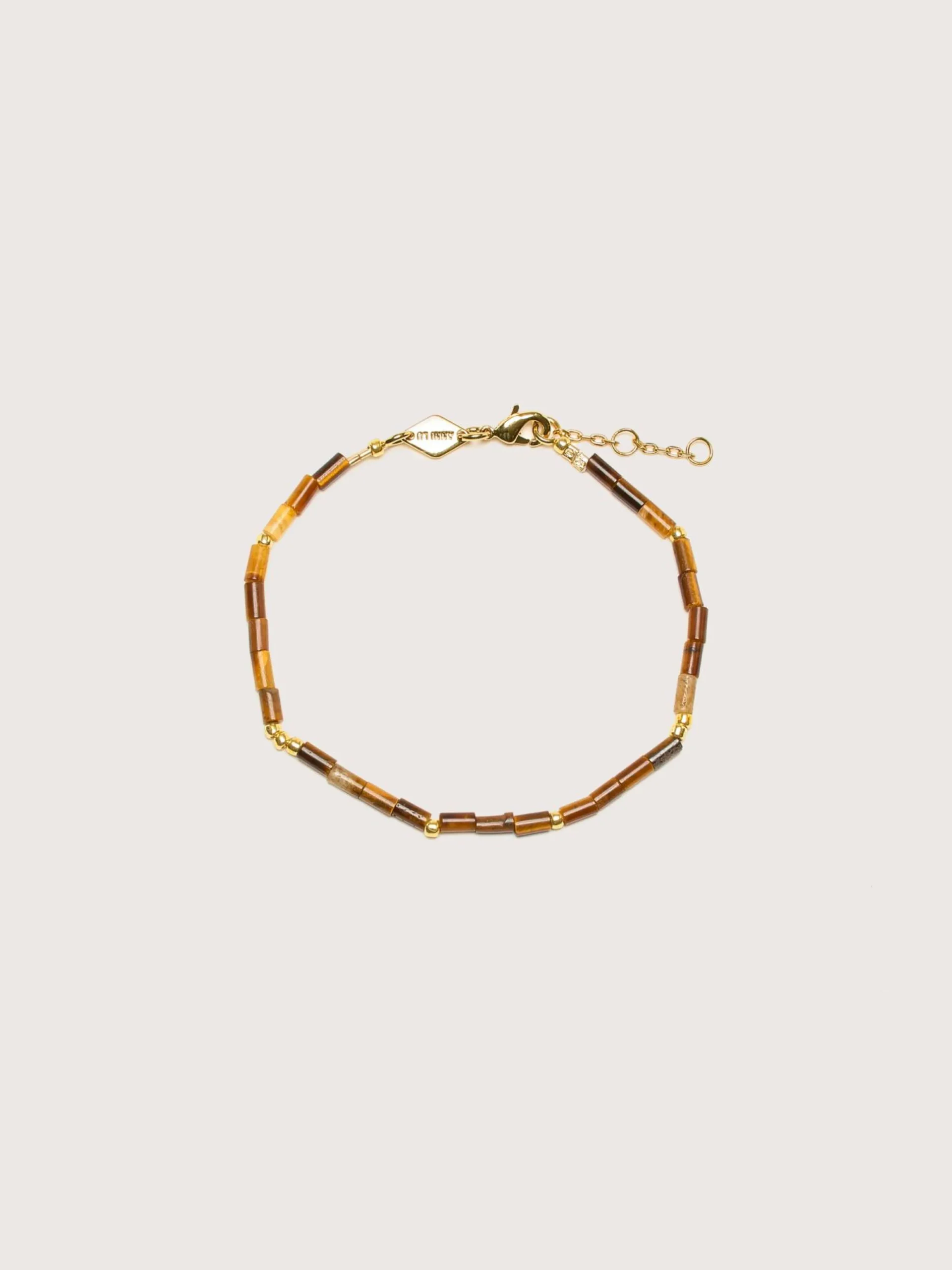 De Anni Lu Sun Stalker armband heeft tijgeroogstenen en glaskralen met 18k verguld messing.