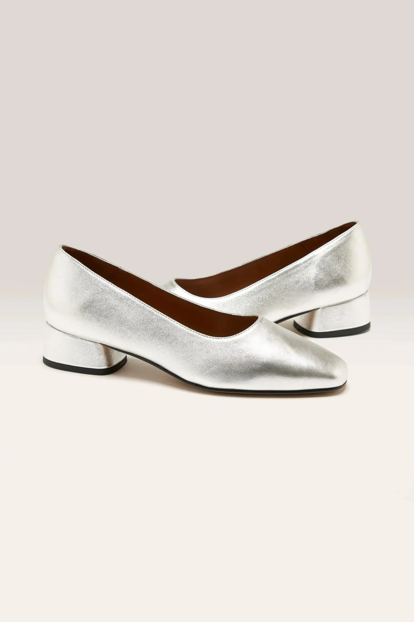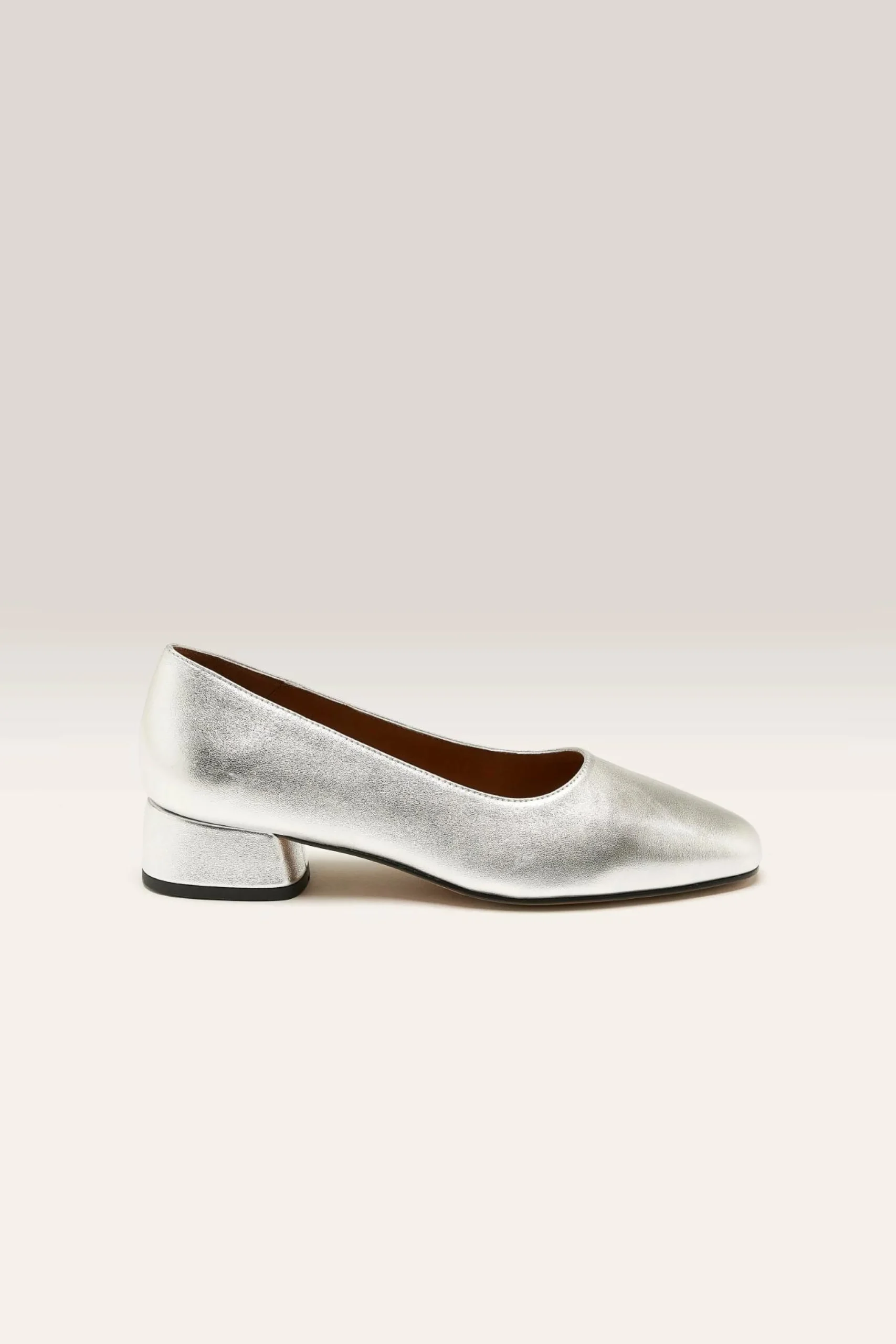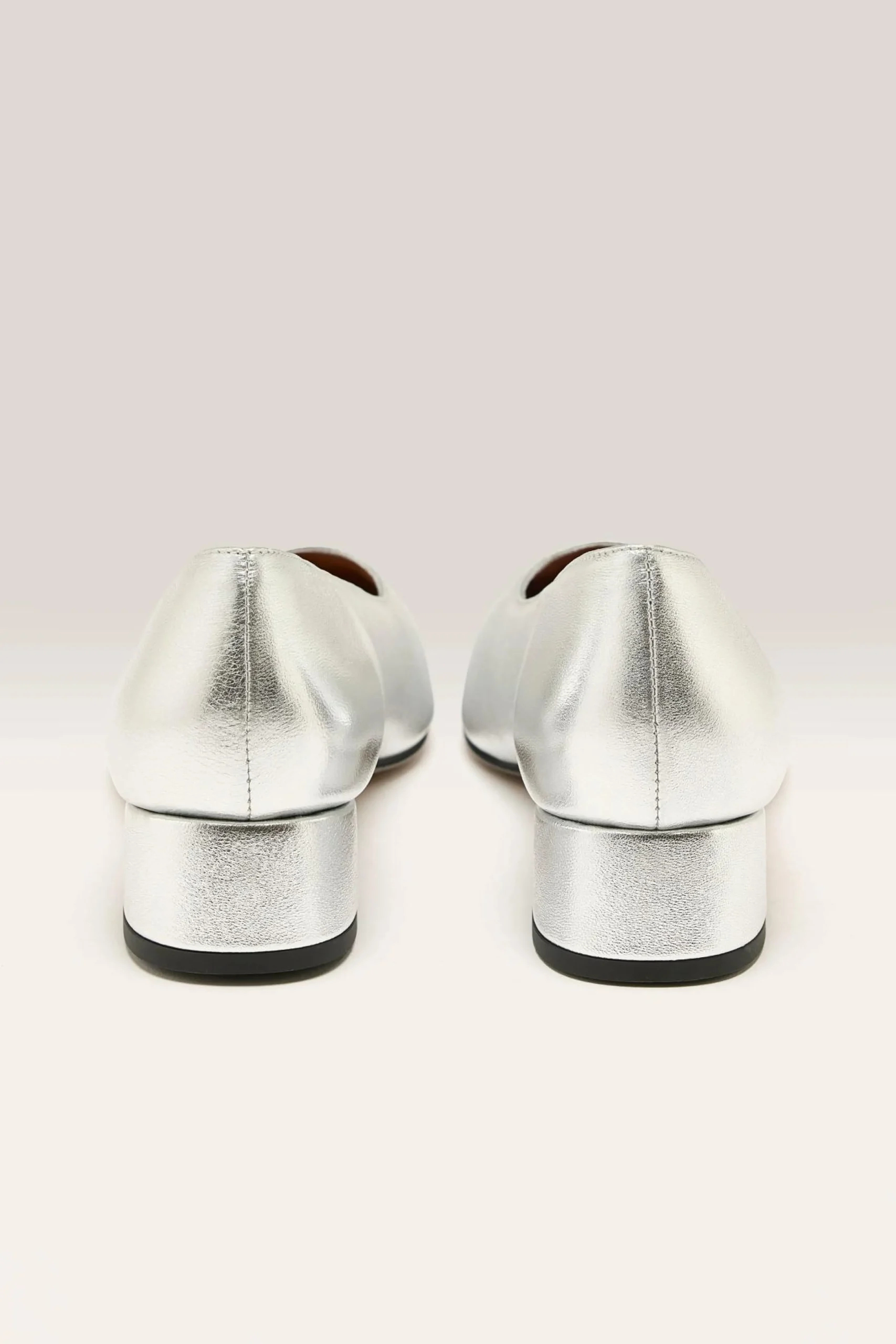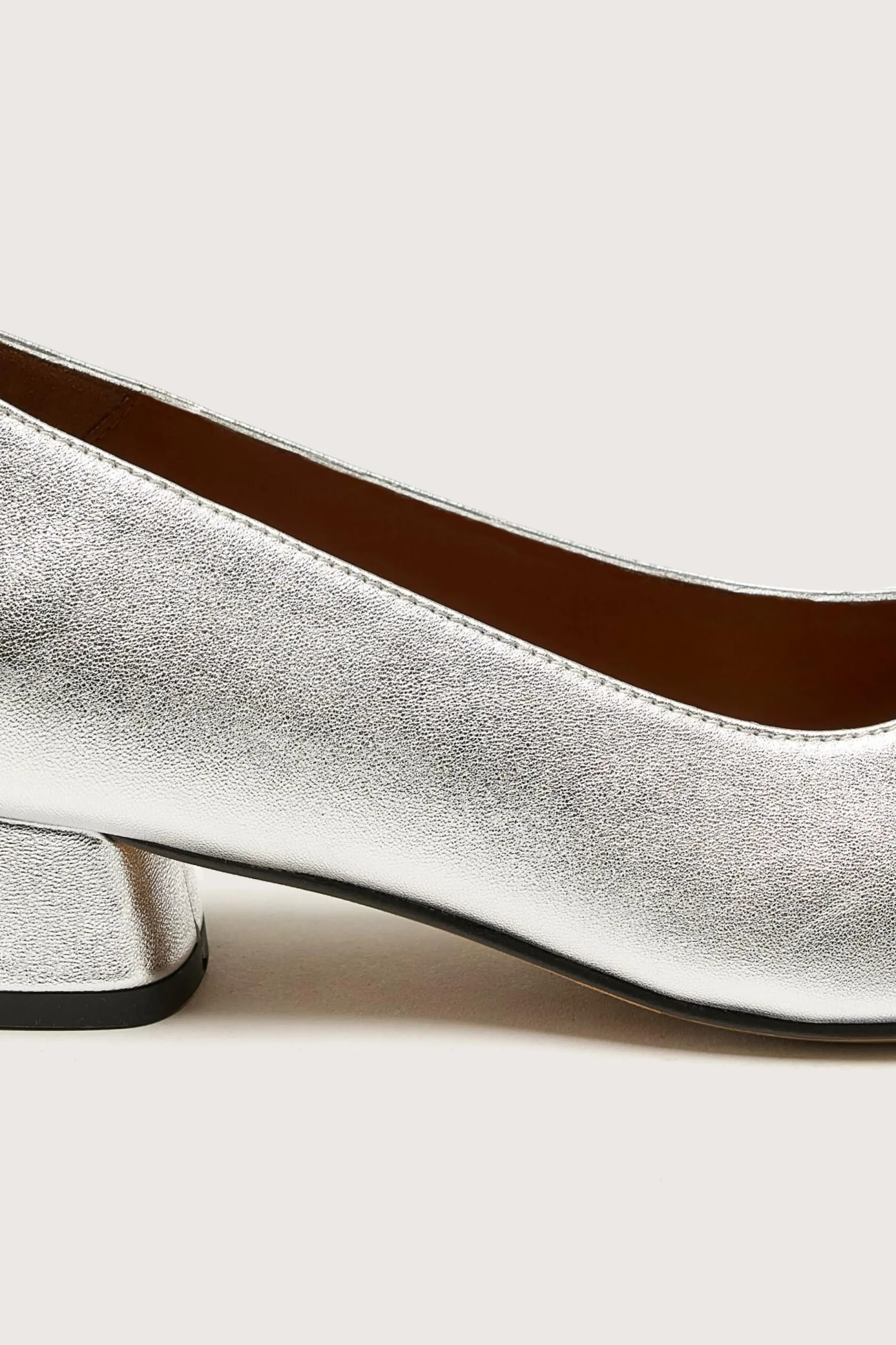 The Anthology Paris Alina Ballerine in silver lamé leather features a rounded, mid-rise heel with leather outsoles.