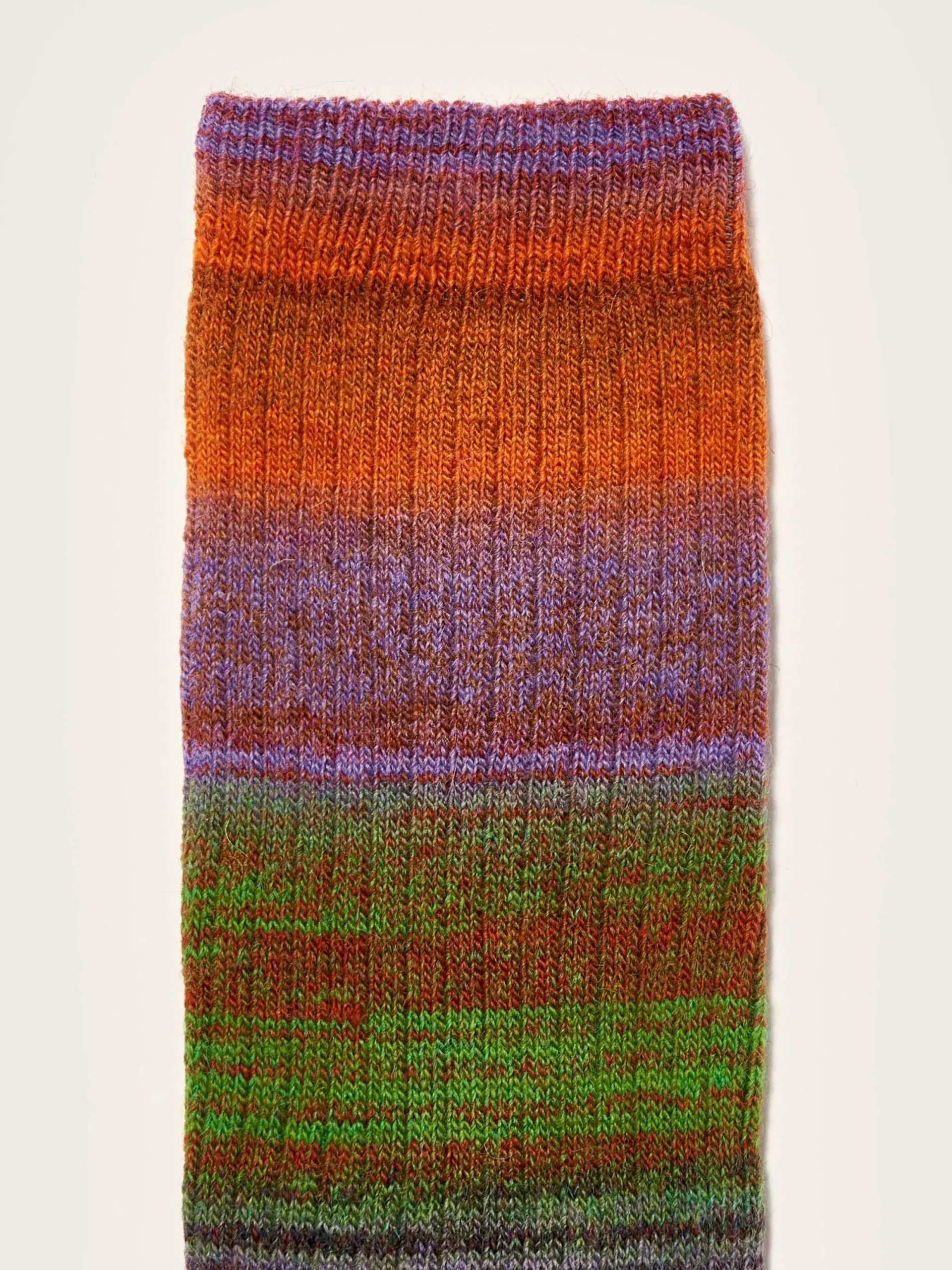 Ribgebreide sokken van meerkleurig garen, met schakeringen van groen en oranje, en contrasterende tenen en hielen.