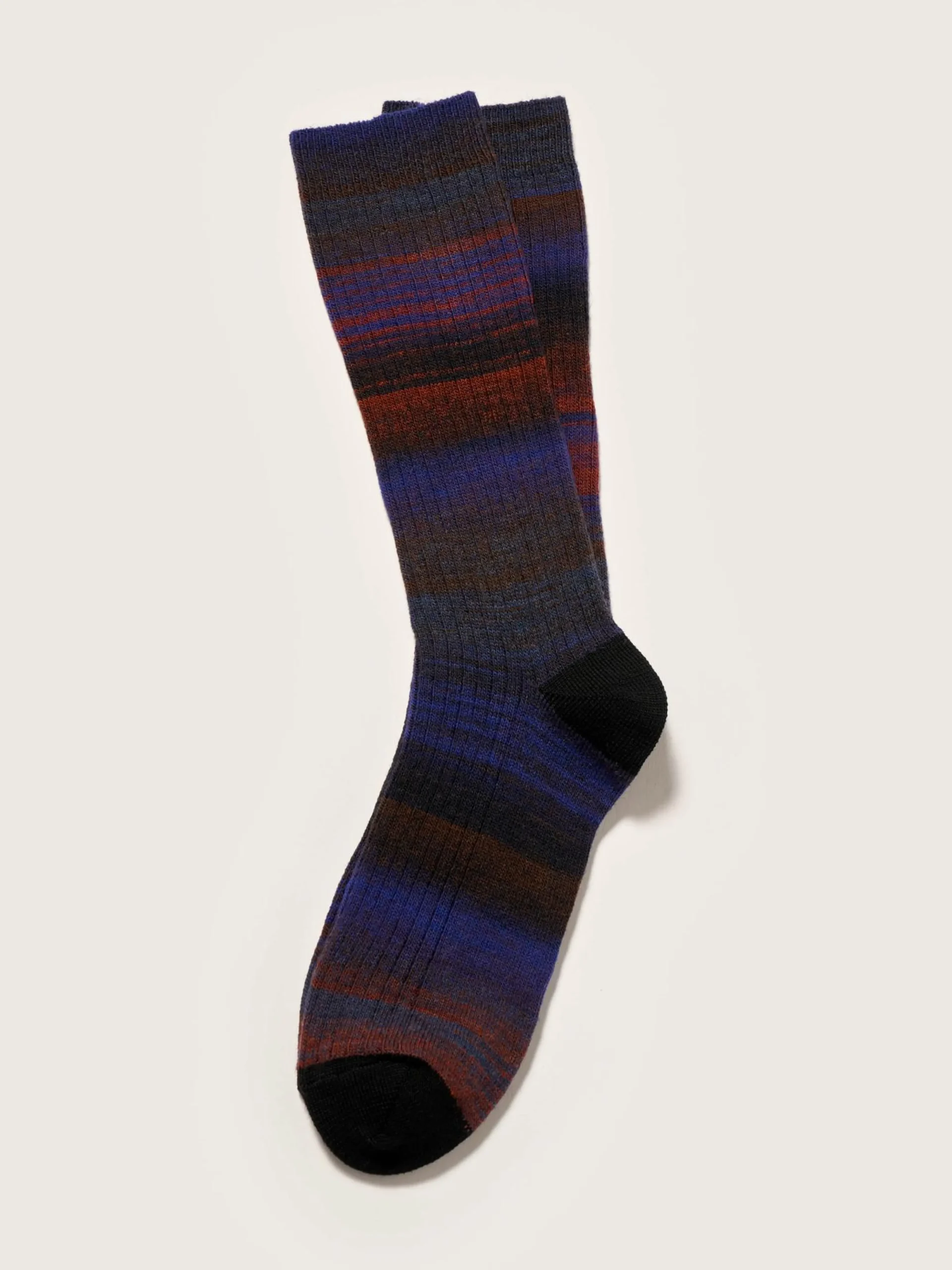 Ribgebreide sokken van meerkleurig garen, met schakeringen van paars en contrasterende tenen en hielen.