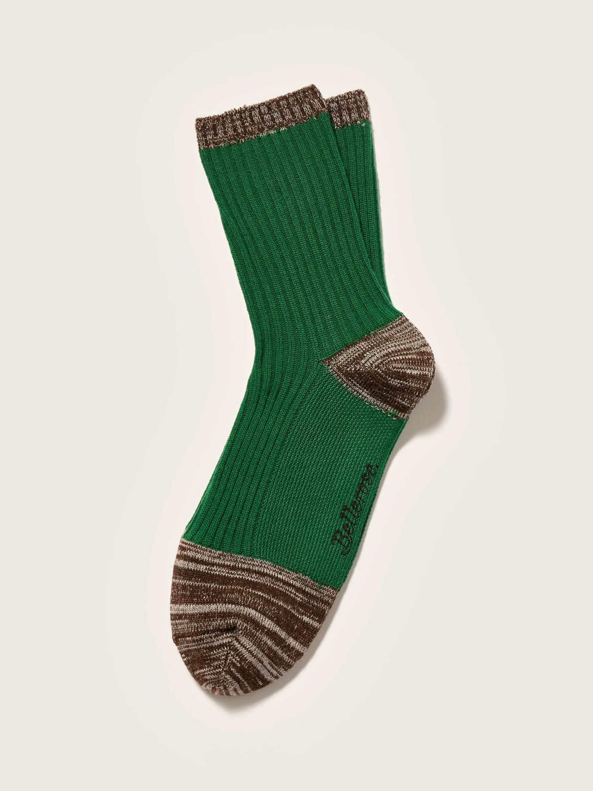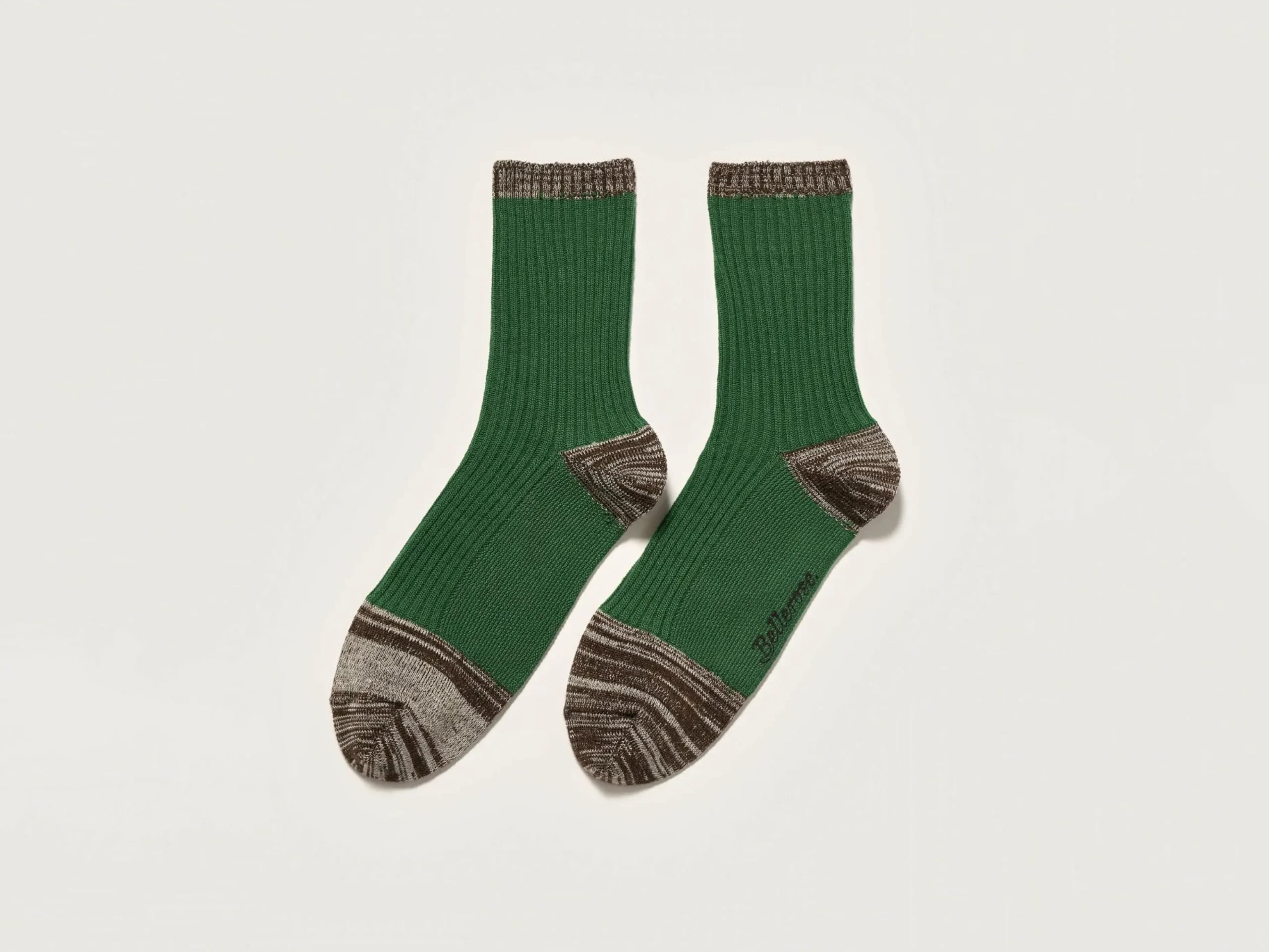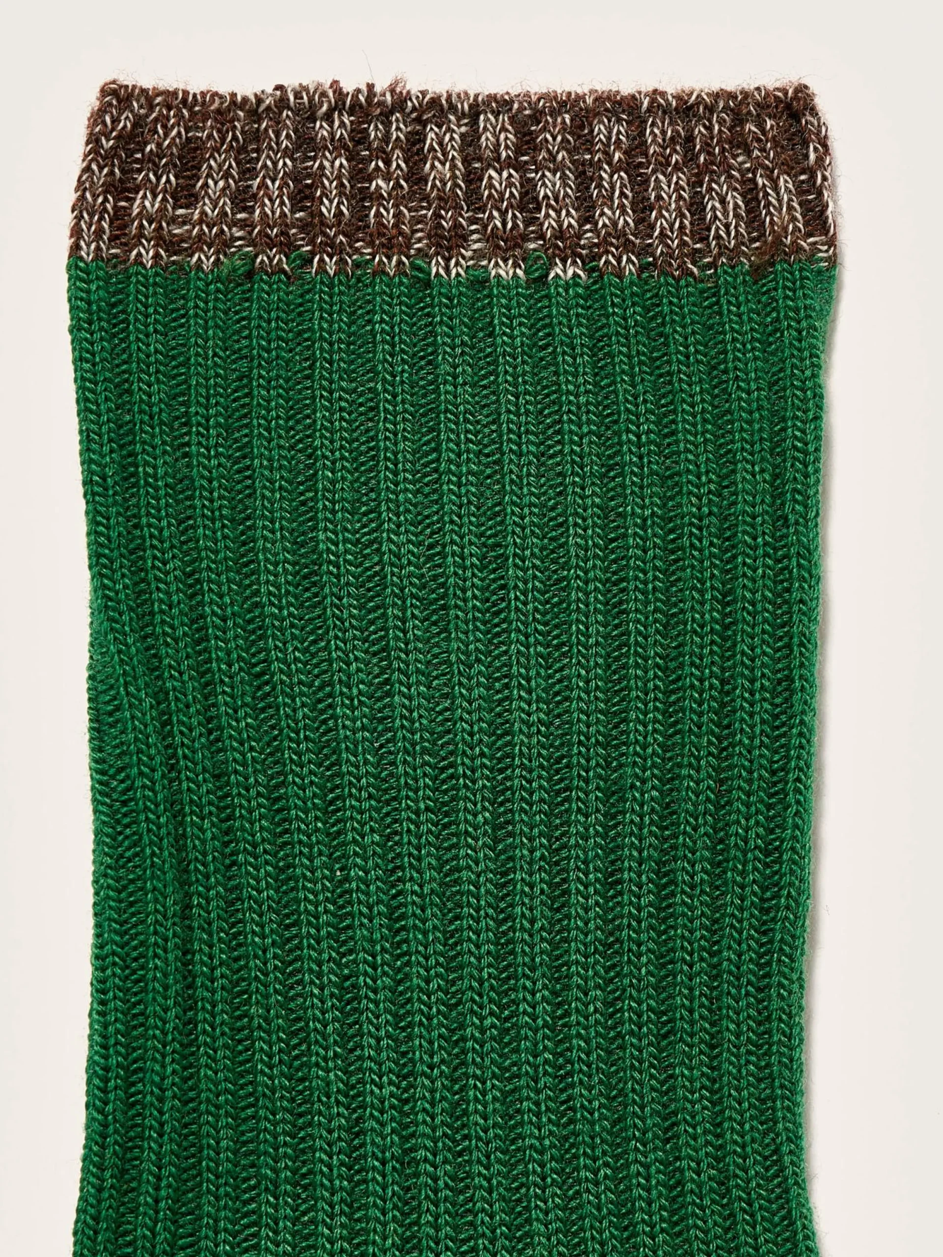Klassieke groene sokken met contrasterende randen, hielen en tenen van meerkleurig garen.