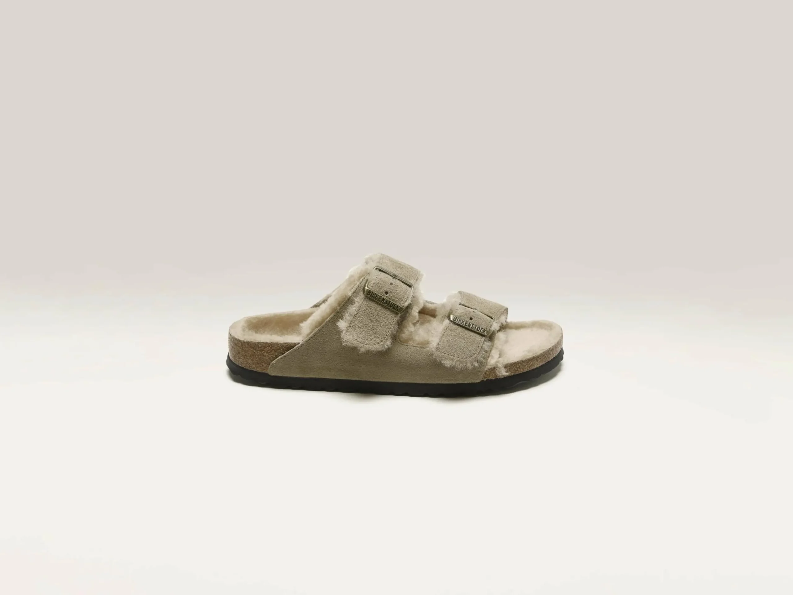 De gezellige Birkenstock Arizona Shearling sandalen hebben een suède bovenwerk en een anatomisch gevormd voetbed gevoerd met zacht lamsvel.
