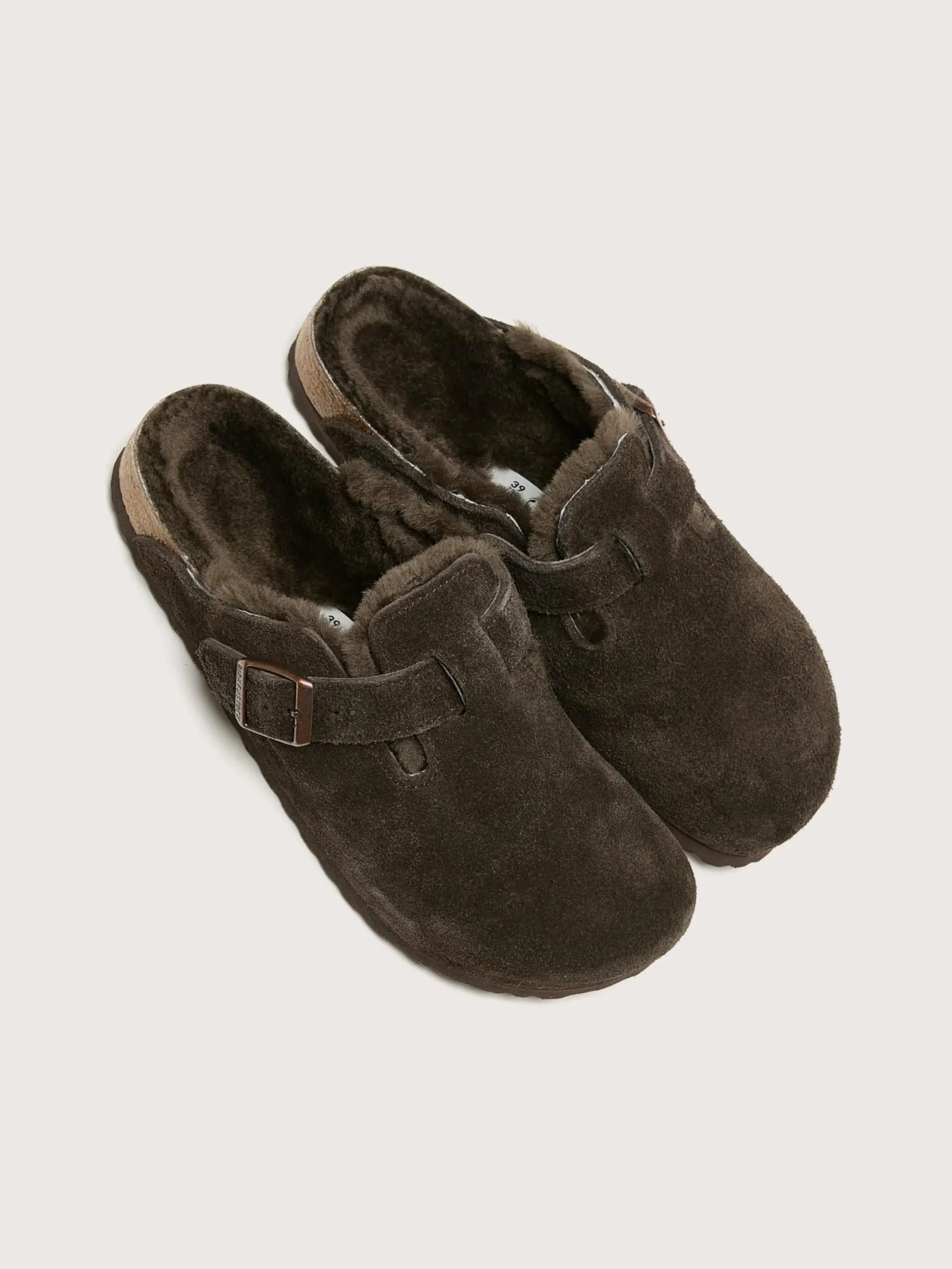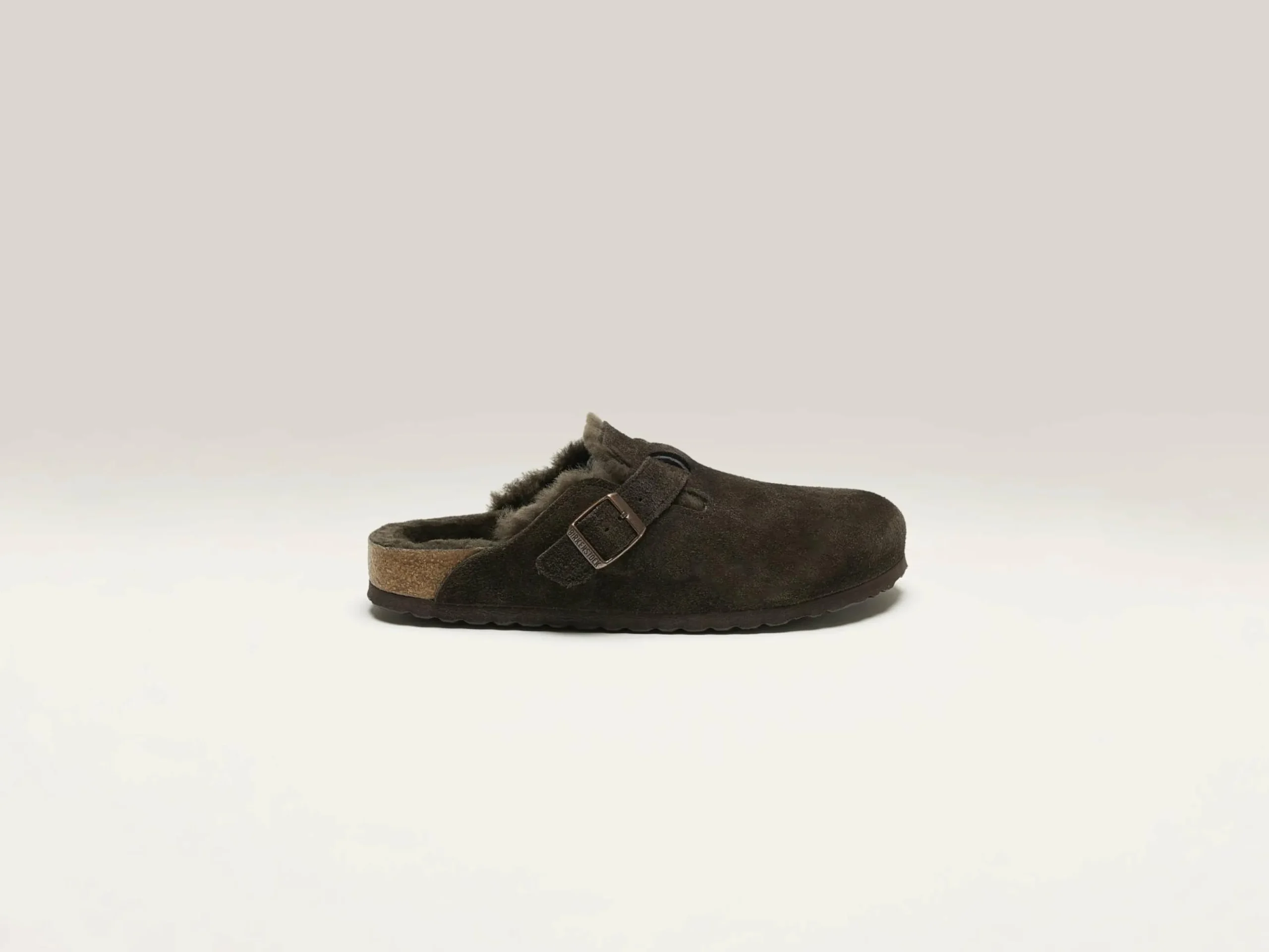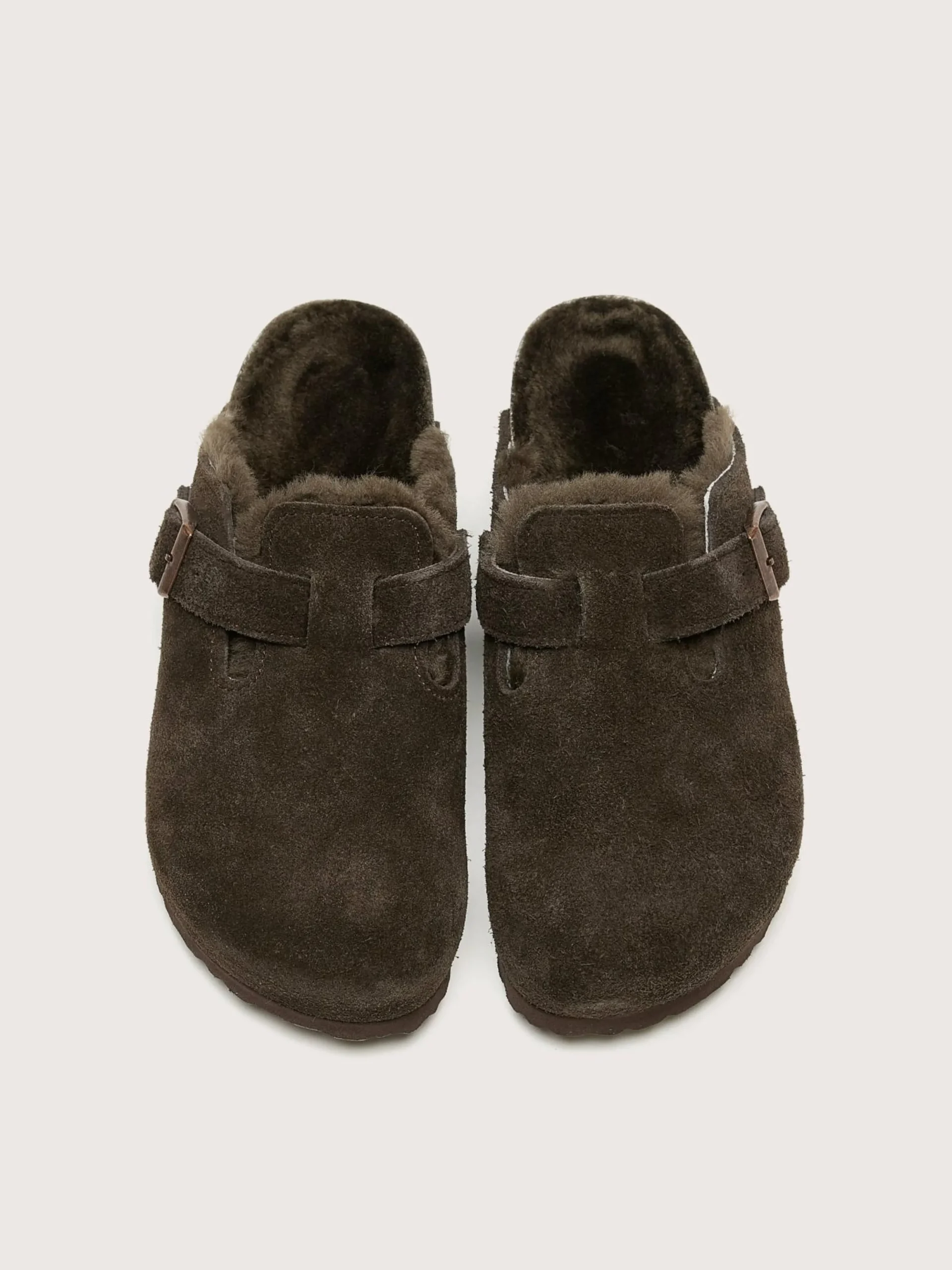 De Birkenstock Boston Shearling klompen hebben een premium suède bovenwerk met voering van natuurlijk lamsleder en een iconisch anatomisch gevormd kurken voetbed.