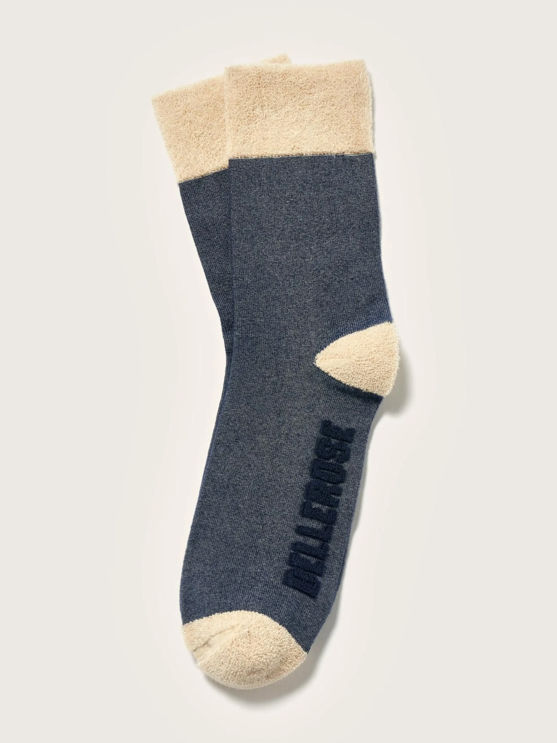 Klassieke, donkerblauwe sokken met Bellerose-signatuur van badstof op de voetzool.