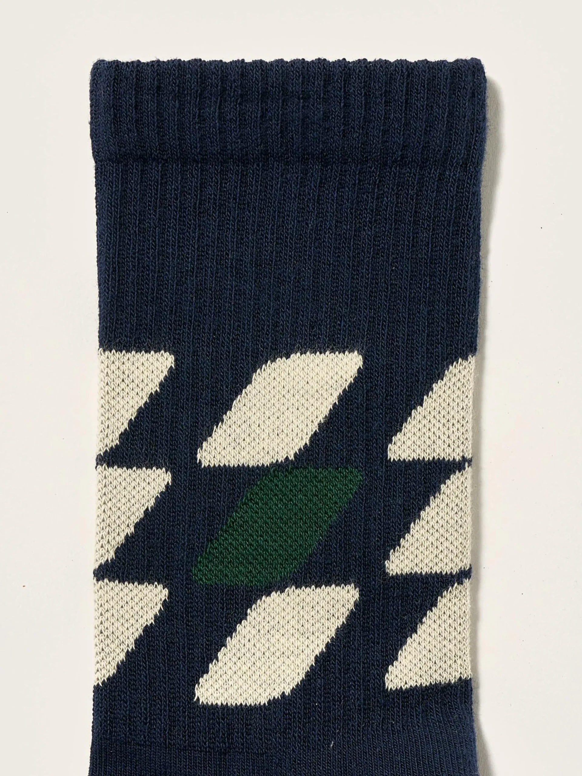 Klassieke halfhoge sokken met donkerblauwe, schuine streepdetails rond de enkel.