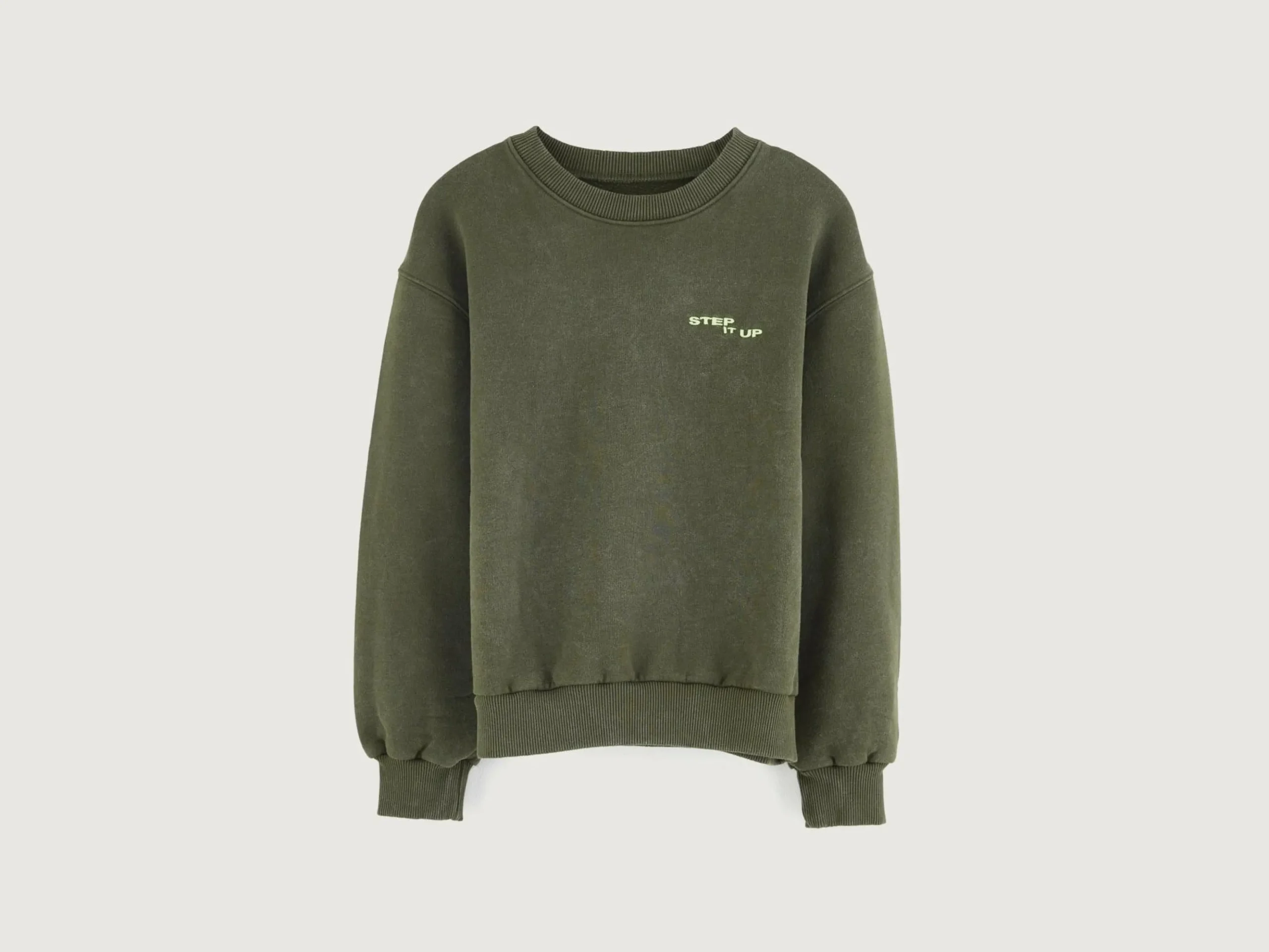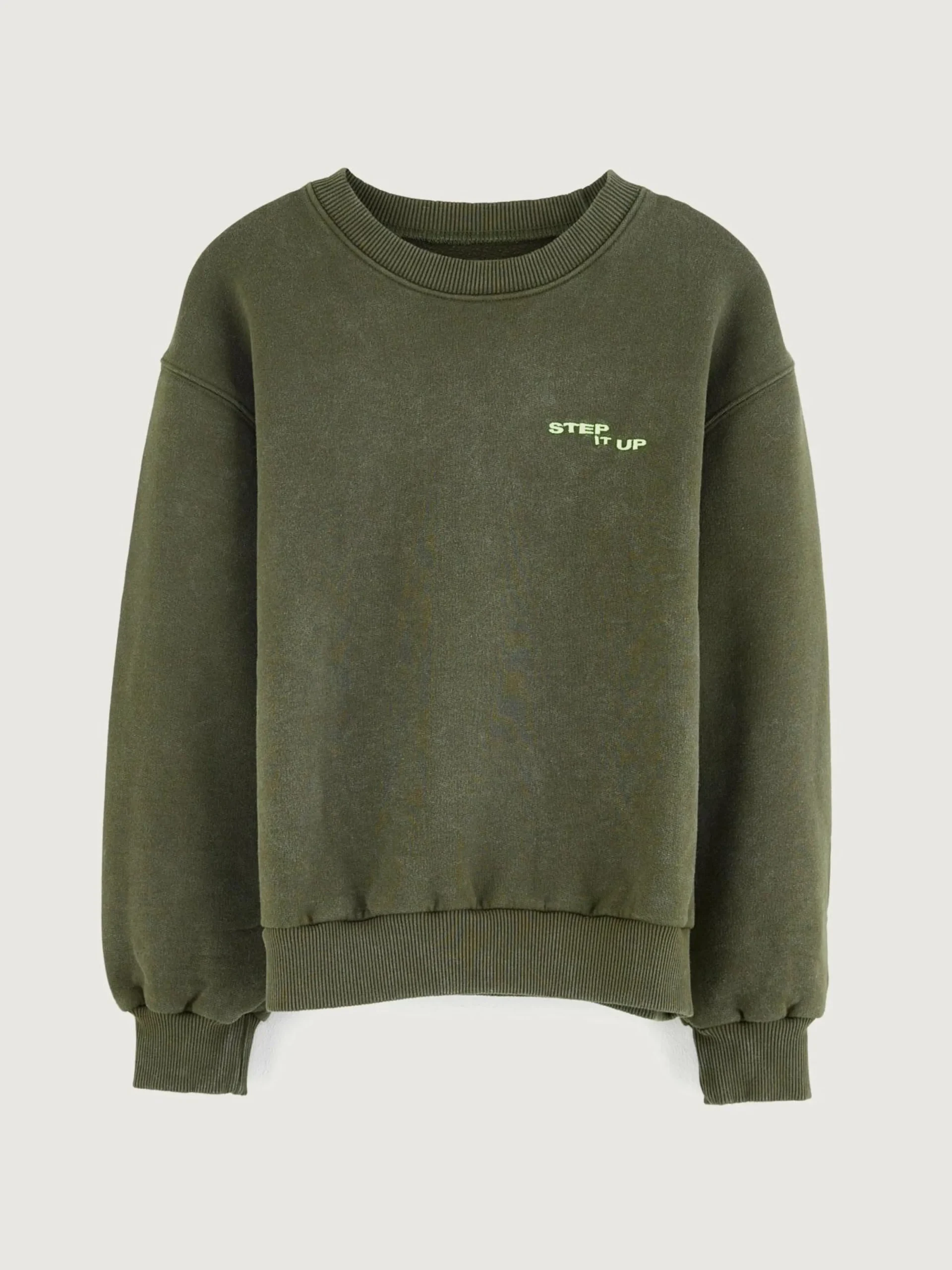 Comfortabel mosgroen sweatshirt van geborstelde fleece en met “Step it up”-print en foto van Daniil Lavrovski.