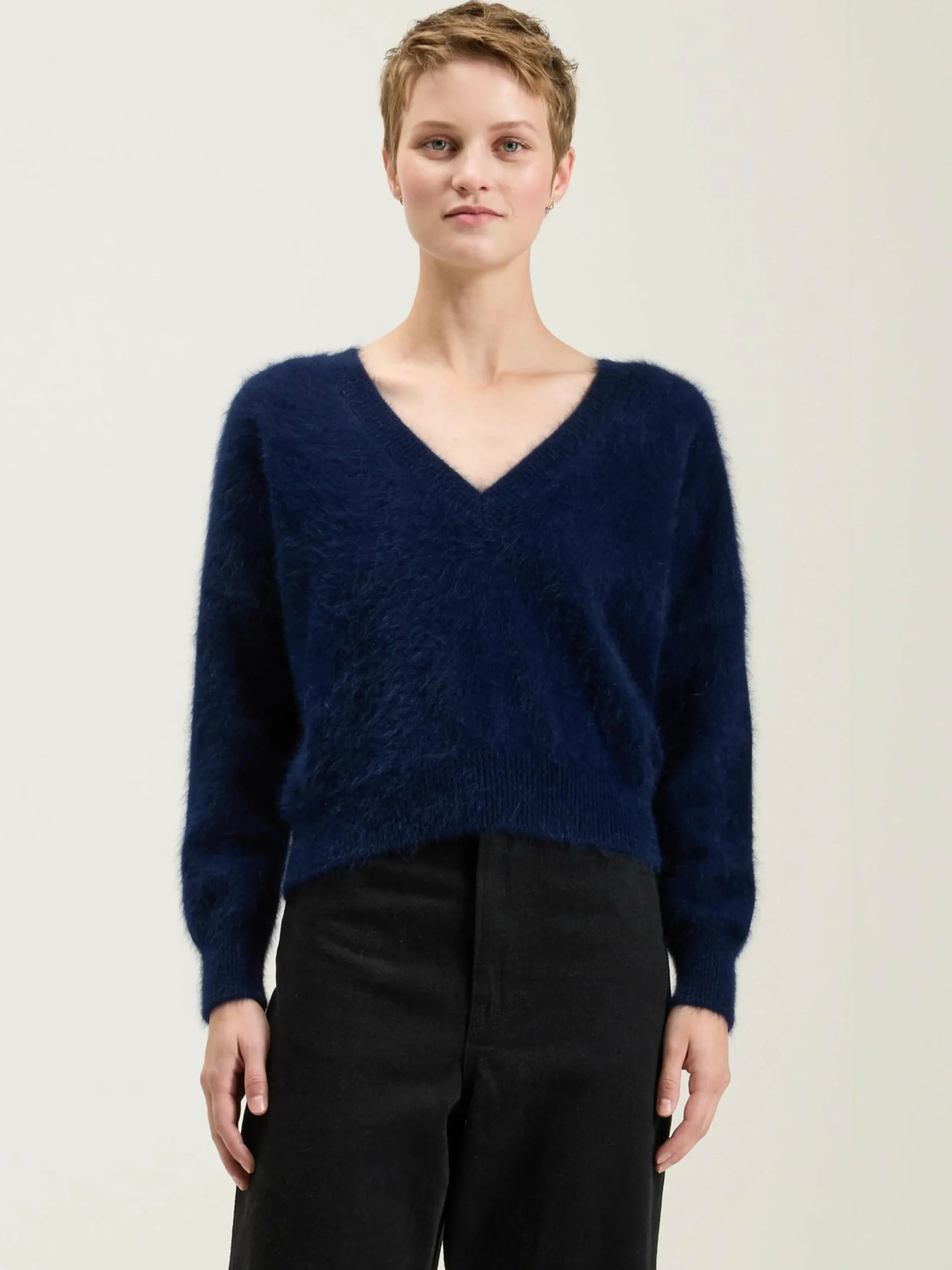 Omkeerbare blauwe trui met V-hals, van angorablend.