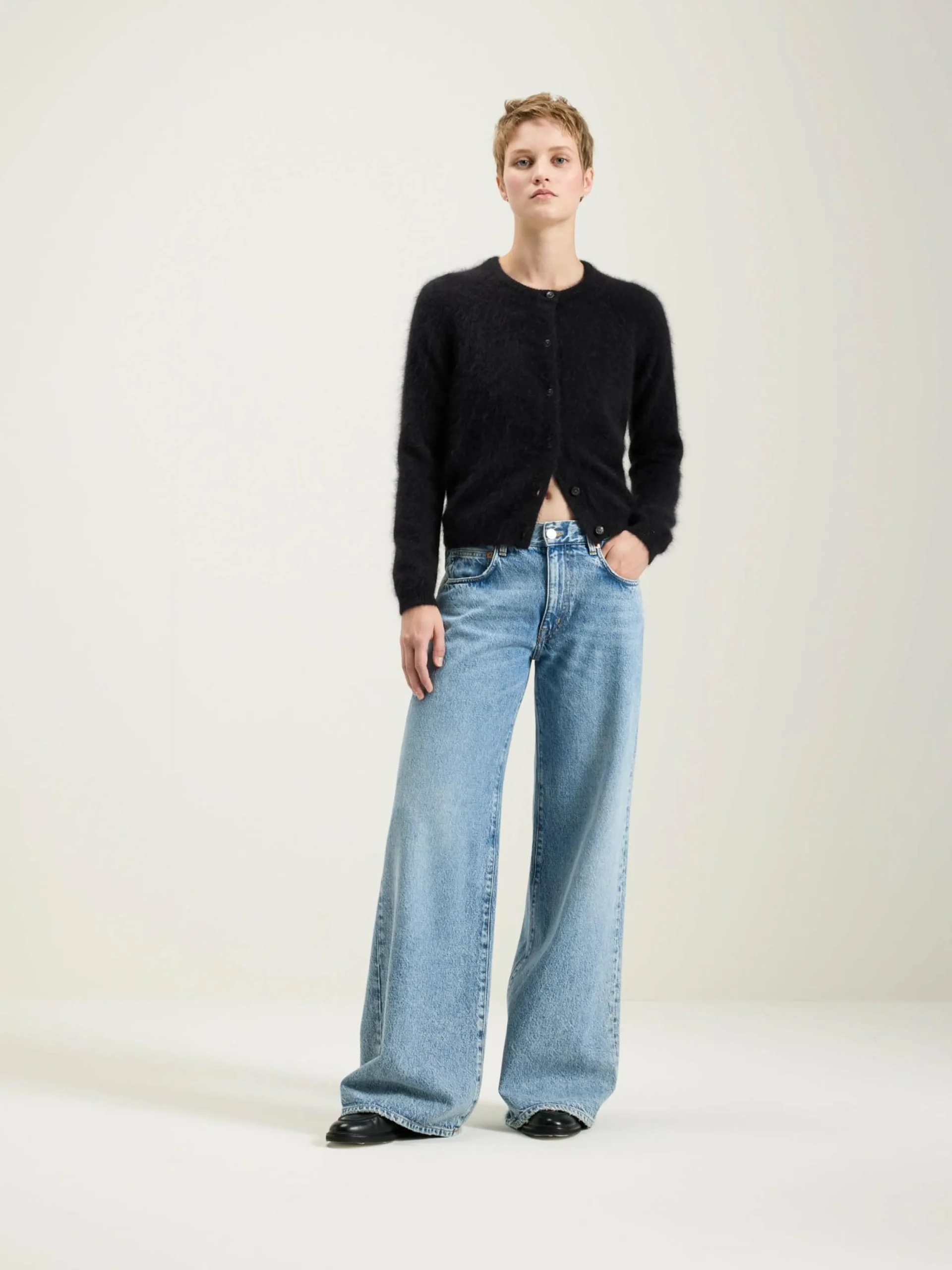 Klassieke crewneck cardigan met raglanmouwen in off-black angoramix.