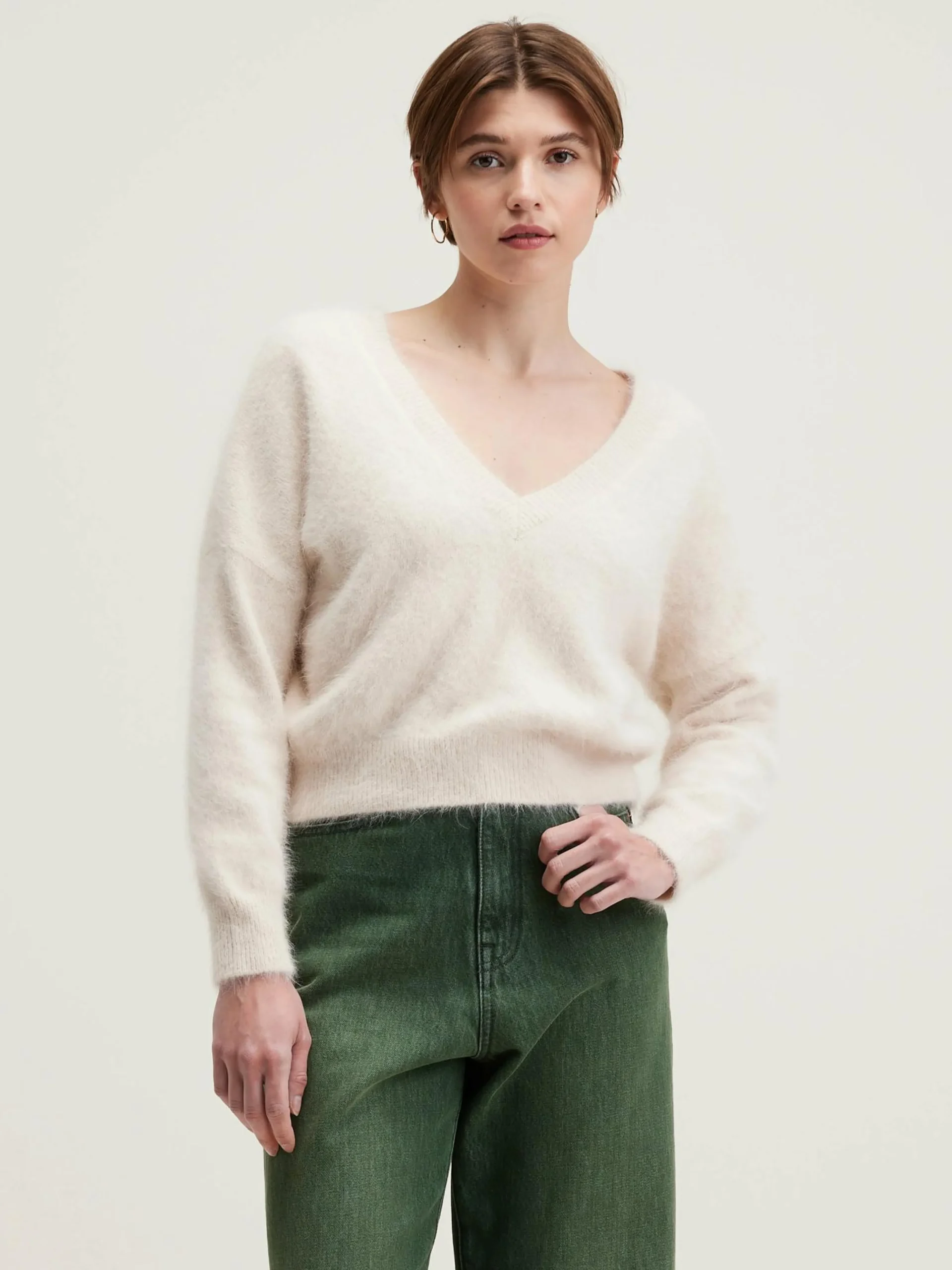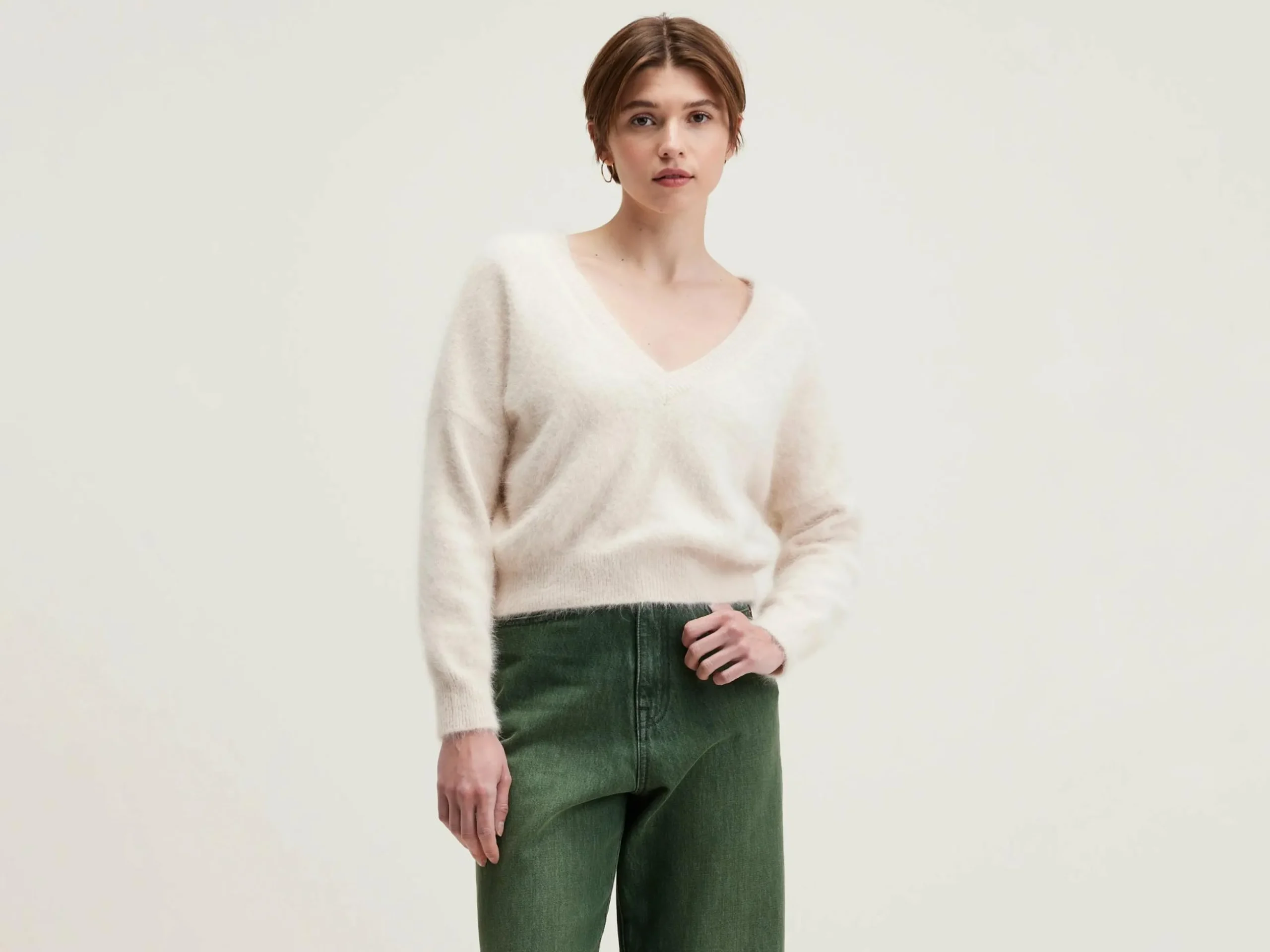 Omkeerbare crèmekleurige trui met V-hals, van angorablend.