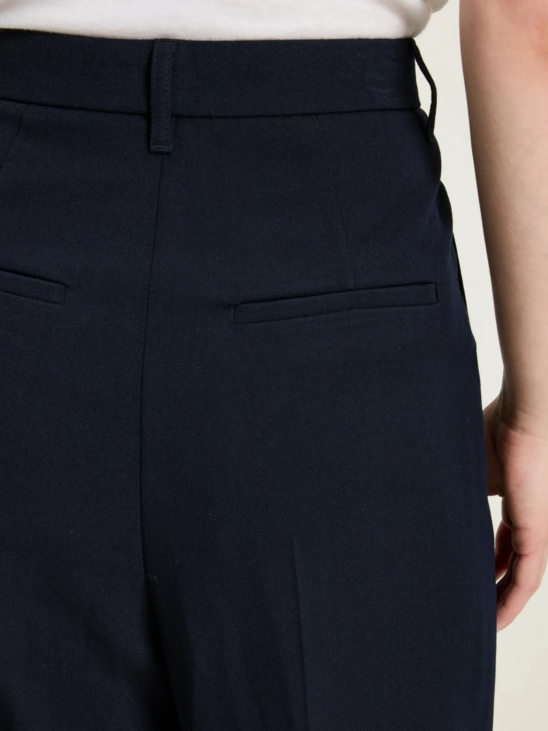 Geklede hoge taille broek met geplooide voorkant en wijde pijpen, in marineblauw.
