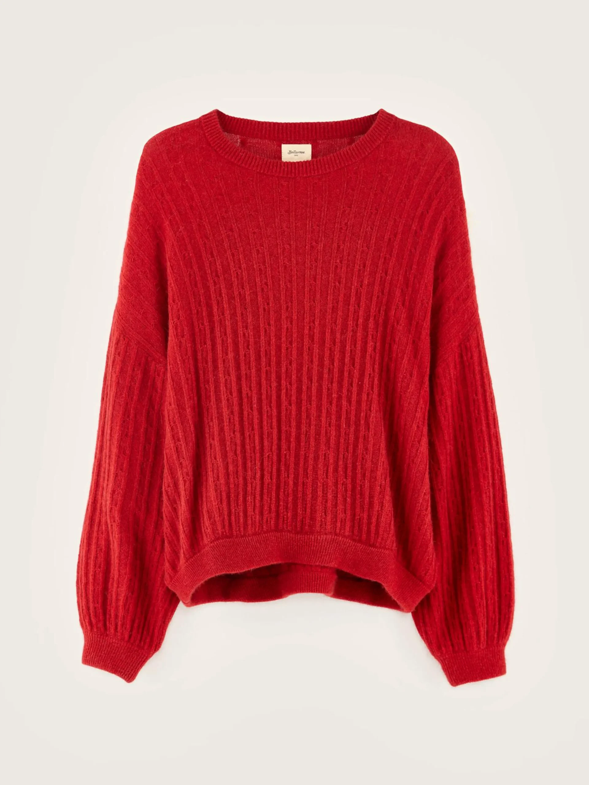 Ruime, donkerrode cropped kabeltrui, averecht gebreid.