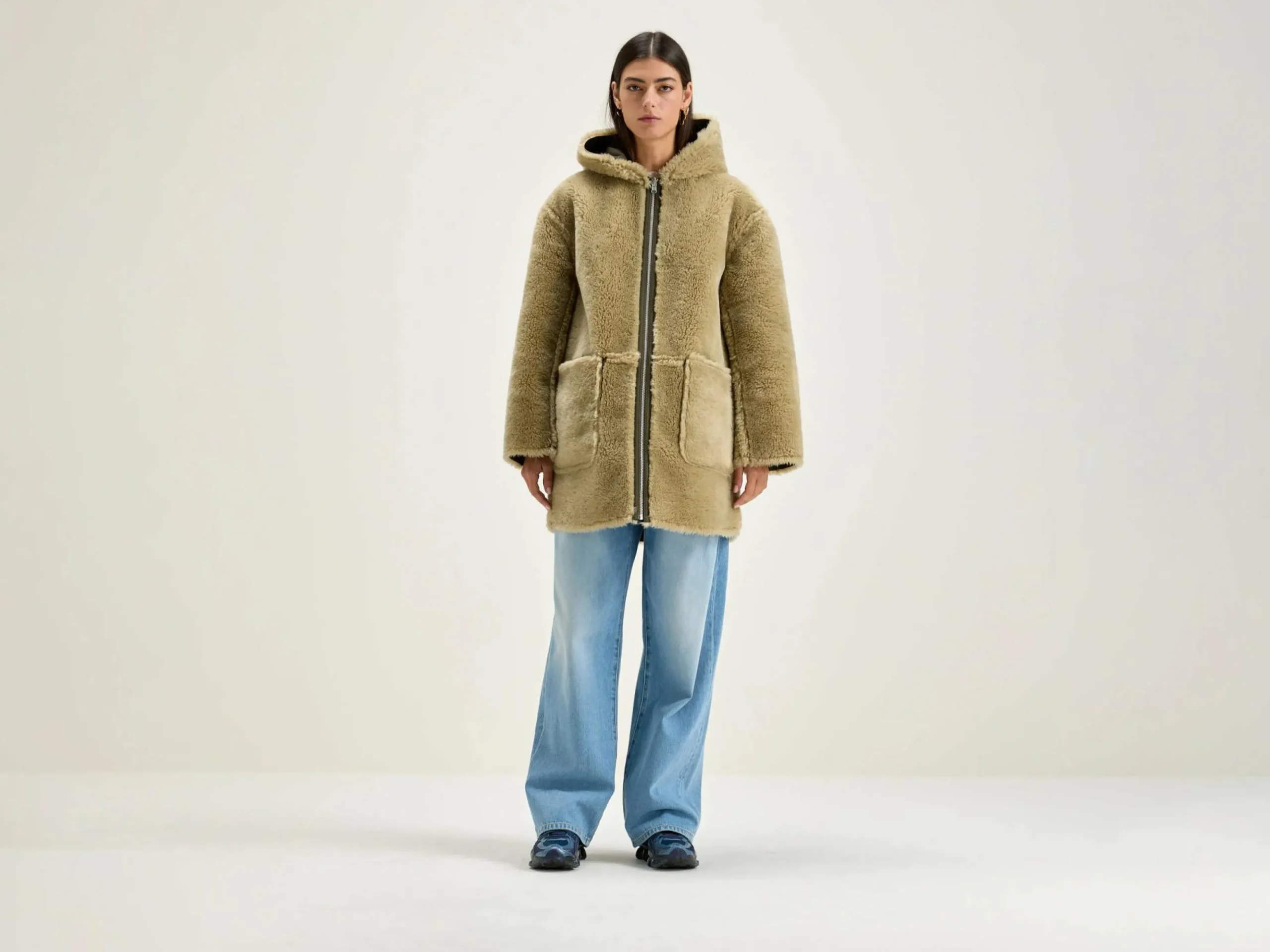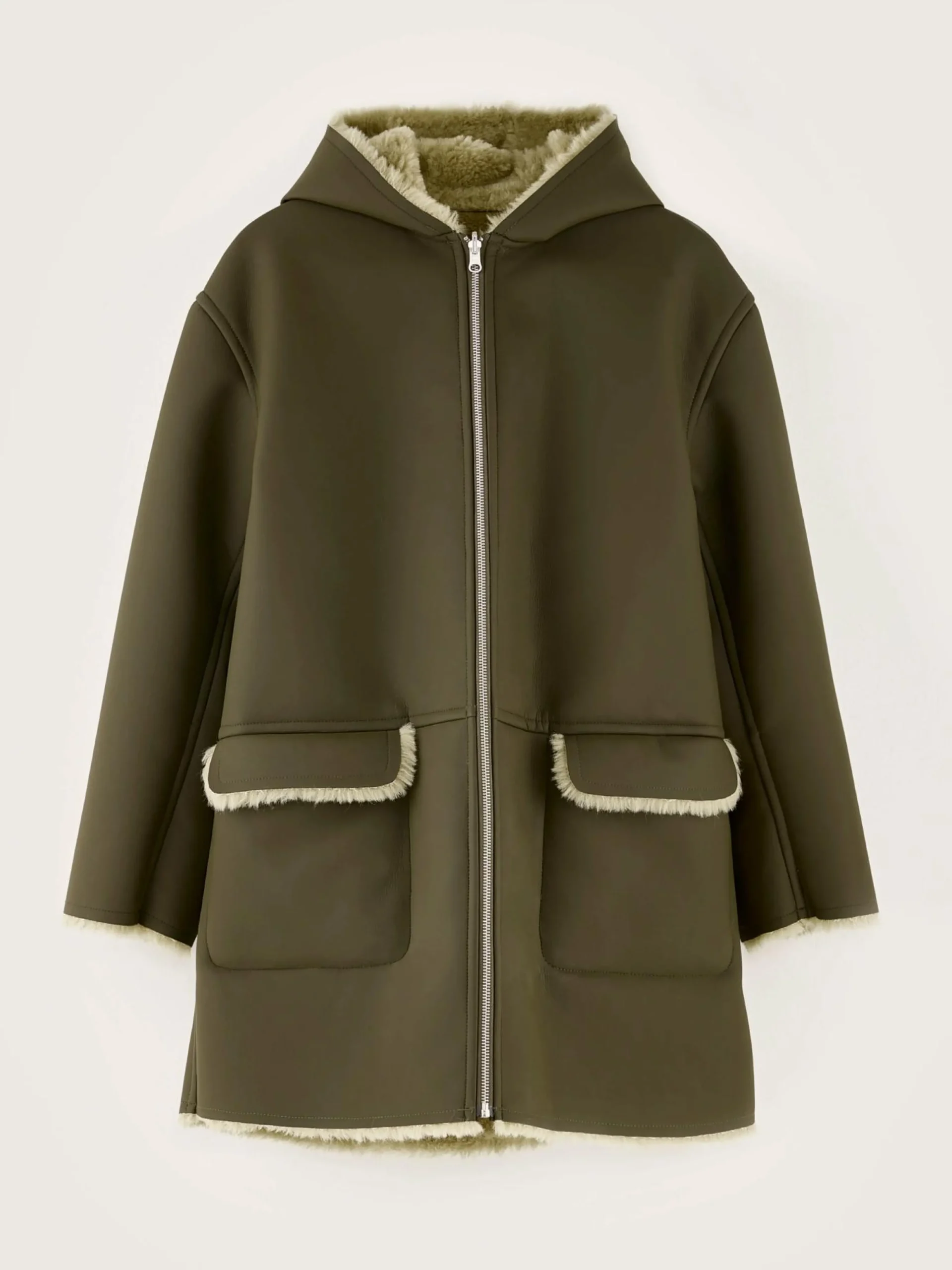 Omkeerbare mantel met capuchon, met ritssluiting en klepzakken vooraan, van mosgroen imitatie-shearlingleer.